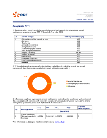 EDF Polska S.A. Oddział Wybrzeże w Gdańsku ul. Swojaka 9 80-867 Gdańsk Gdańsk 10.02.2014 r. Załącznik Nr 1 1. Struktura paliw i innych nośników energii pierwotnej zużywanych do wytworzenia energii elektrycznej sprzedanej przez EDF Wybrzeże S.A. w roku 2013. Lp. Żródło energii 1 Odnawialne żródło energii, w tym: Biomasa Geotermia Energetyka wiatrowa Energia słoneczna Duża energetyka wodna Mała energetyka wodna Węgiel kamienny Wegiel brunatny Gaz ziemny Energetyka jądrowa Inne (olej opałowy ciężki) RAZEM 2 3 4 5 6 Udział procentowy [%] 0,69 0,69 0,00 0,00 0,00 0,00 0,00 98,96 0,00 0,00 0,00 0,35 100 2. Wykres kołowy obrazujący graficznie strukturę paliw i innych nośników energii pierwotnej zużywanych do wytworzenia energii elektrycznej, o której mowa w pkt. 1. 98,96 węgiel kamienny 0,35 0,69 inne (olej opałowy ciężki) biomasa 3. Informacje o wpływie wytworzenia energii elektrycznej na środowisko w zakresie wielkości emisji dla poszczególnych paliw i innych nośników energii pierwotnej zużywanych do wytwarzania energii elektrycznej sprzedanej przez EDF Wybrzeże S.A.w roku 2013. CO2 Lp. SO2 NOx Pyły Rodzaj paliwa Odpady radioaktywne [Mg/MWh] 1 Węgiel kamienny Olej opałowy ciężki 0,3974 Biomasa 0,001262 0,00079 W/w informacje są dostępne na stronie internetowej www.edf.pl 0,00008 0