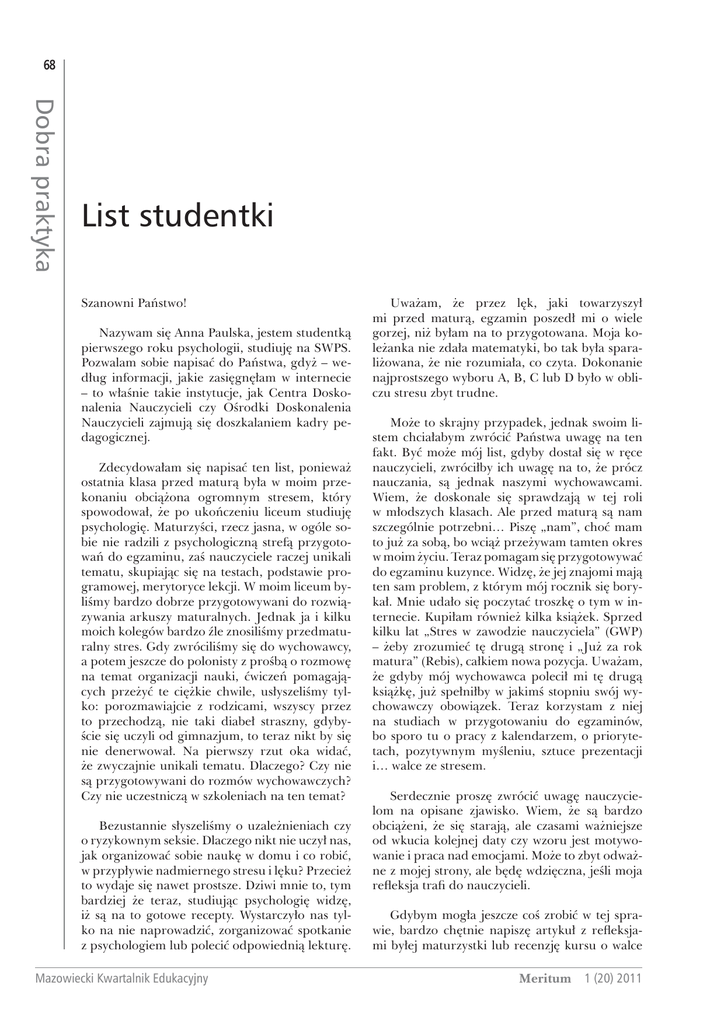 68 Dobra praktyka List studentki Szanowni Państwo! Nazywam się Anna Paulska, jestem studentką pierwszego roku psychologii, studiuję na SWPS. Pozwalam sobie napisać do Państwa, gdyż – według informacji, jakie zasięgnęłam w internecie – to właśnie takie instytucje, jak Centra Doskonalenia Nauczycieli czy Ośrodki Doskonalenia Nauczycieli zajmują się doszkalaniem kadry pedagogicznej. Zdecydowałam się napisać ten list, ponieważ ostatnia klasa przed maturą była w moim przekonaniu obciążona ogromnym stresem, który spowodował, że po ukończeniu liceum studiuję psychologię. Maturzyści, rzecz jasna, w ogóle sobie nie radzili z psychologiczną strefą przygotowań do egzaminu, zaś nauczyciele raczej unikali tematu, skupiając się na testach, podstawie programowej, merytoryce lekcji. W moim liceum byliśmy bardzo dobrze przygotowywani do rozwiązywania arkuszy maturalnych. Jednak ja i kilku moich kolegów bardzo źle znosiliśmy przedmaturalny stres. Gdy zwróciliśmy się do wychowawcy, a potem jeszcze do polonisty z prośbą o rozmowę na temat organizacji nauki, ćwiczeń pomagających przeżyć te ciężkie chwile, usłyszeliśmy tylko: porozmawiajcie z rodzicami, wszyscy przez to przechodzą, nie taki diabeł straszny, gdybyście się uczyli od gimnazjum, to teraz nikt by się nie denerwował. Na pierwszy rzut oka widać, że zwyczajnie unikali tematu. Dlaczego? Czy nie są przygotowywani do rozmów wychowawczych? Czy nie uczestniczą w szkoleniach na ten temat? Bezustannie słyszeliśmy o uzależnieniach czy o ryzykownym seksie. Dlaczego nikt nie uczył nas, jak organizować sobie naukę w domu i co robić, w przypływie nadmiernego stresu i lęku? Przecież to wydaje się nawet prostsze. Dziwi mnie to, tym bardziej że teraz, studiując psychologię widzę, iż są na to gotowe recepty. Wystarczyło nas tylko na nie naprowadzić, zorganizować spotkanie z psychologiem lub polecić odpowiednią lekturę. Mazowiecki Kwartalnik Edukacyjny Uważam, że przez lęk, jaki towarzyszył mi przed maturą, egzamin poszedł mi o wiele gorzej, niż byłam na to przygotowana. Moja koleżanka nie zdała matematyki, bo tak była sparaliżowana, że nie rozumiała, co czyta. Dokonanie najprostszego wyboru A, B, C lub D było w obliczu stresu zbyt trudne. Może to skrajny przypadek, jednak swoim listem chciałabym zwrócić Państwa uwagę na ten fakt. Być może mój list, gdyby dostał się w ręce nauczycieli, zwróciłby ich uwagę na to, że prócz nauczania, są jednak naszymi wychowawcami. Wiem, że doskonale się sprawdzają w tej roli w młodszych klasach. Ale przed maturą są nam szczególnie potrzebni… Piszę „nam”, choć mam to już za sobą, bo wciąż przeżywam tamten okres w moim życiu. Teraz pomagam się przygotowywać do egzaminu kuzynce. Widzę, że jej znajomi mają ten sam problem, z którym mój rocznik się borykał. Mnie udało się poczytać troszkę o tym w internecie. Kupiłam również kilka książek. Sprzed kilku lat „Stres w zawodzie nauczyciela” (GWP) – żeby zrozumieć tę drugą stronę i „Już za rok matura” (Rebis), całkiem nowa pozycja. Uważam, że gdyby mój wychowawca polecił mi tę drugą książkę, już spełniłby w jakimś stopniu swój wychowawczy obowiązek. Teraz korzystam z niej na studiach w przygotowaniu do egzaminów, bo sporo tu o pracy z kalendarzem, o priorytetach, pozytywnym myśleniu, sztuce prezentacji i… walce ze stresem. Serdecznie proszę zwrócić uwagę nauczycielom na opisane zjawisko. Wiem, że są bardzo obciążeni, że się starają, ale czasami ważniejsze od wkucia kolejnej daty czy wzoru jest motywowanie i praca nad emocjami. Może to zbyt odważne z mojej strony, ale będę wdzięczna, jeśli moja refleksja trafi do nauczycieli. Gdybym mogła jeszcze coś zrobić w tej sprawie, bardzo chętnie napiszę artykuł z refleksjami byłej maturzystki lub recenzję kursu o walce Meritum 1 (20) 2011 List studentki 69 przejdą obojętnie). Z pewnością wydajecie Państwo jakieś materiały dla nauczycieli, ulotki, czasopismo. Bardzo proszę o tym pomyśleć. Z poważaniem Anna Paulska Ten list to wołanie o pomoc, której autorka nie doświadczyła w jednym z najtrudniejszych dla niej okresów życia. Wzruszył nas, zobowiązał i skłonił do działania. Zastanawiające bowiem jest to, że w sytuacji gdy tyle jest na rynku edukacyjnym form doskonalenia nauczycieli związanych z udzielaniem pomocy psychologiczno-pedagogicznej w polskich szkołach, młodzi ludzie nadal pozostawieni są samym sobie, a ich problemy – po prostu bagatelizowane. Dobra praktyka ze stresem czy książki, która może pomóc maturzystom. Mogę to zrobić wspólnie z moimi kolegami czy z wykładowcami (niektórzy chętnie pomagają, a myślę, że obok tego problemu nie Nadal w naszych szkołach problemem jest brak umiejętności rozpoznawania potrzeb wychowanków i udzielania im adekwatnego do sytuacji wsparcia psychologicznego. Z listu wynika, że wsparcie kojarzy się nauczycielom z dawaniem dobrych rad, pocieszaniem, bagatelizowaniem, pouczaniem, czyli z całą gamą barier komunikacyjnych, które powodują zablokowanie kontaktu i niechęć do dalszych prób jego nawiązania. To co dla placówek doskonalenia staje się w związku z tym wyzwaniem, to stworzenie programu szkolenia dotyczącego pracy ze stresem, nie tylko tym nauczycielskim – np. „Jak być grzecznym i przy okazji nie zwariować” czy „Jak sobie radzić z trudnymi emocjami w relacji z uczniem lub jego rodzicem” – ale doskonalącego takie umiejętności wychowawcze, jak: rozpoznawanie i docieranie do potrzeb w kontakcie z wychowankiem, stosowanie różnych stylów komunikowania się, rozpoznawanie i unikanie barier komunikacyjnych poprzez stosowanie komunikatów Ja i innych związanych z asertywnością, praca ze stresem w sytuacjach dużego napięcia emocjonalnego, organizacja pracy własnej, rozpoznawanie stylu uczenia się… Wiem, że