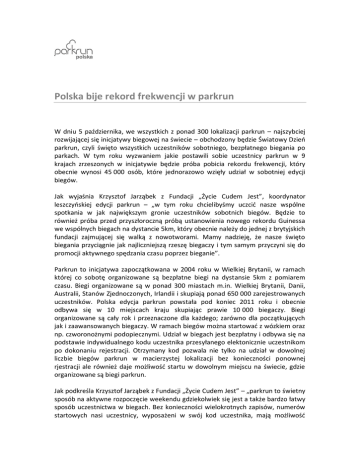 Polska bije rekord frekwencji w parkrun W dniu 5 października, we wszystkich z ponad 300 lokalizacji parkrun – najszybciej rozwijającej się inicjatywy biegowej na świecie – obchodzony będzie Światowy Dzień parkrun, czyli święto wszystkich uczestników sobotniego, bezpłatnego biegania po parkach. W tym roku wyzwaniem jakie postawili sobie uczestnicy parkrun w 9 krajach zrzeszonych w inicjatywie będzie próba pobicia rekordu frekwencji, który obecnie wynosi 45 000 osób, które jednorazowo wzięły udział w sobotniej edycji biegów. Jak wyjaśnia Krzysztof Jarząbek z Fundacji „Życie Cudem Jest”, koordynator leszczyńskiej edycji parkrun – „w tym roku chcielibyśmy uczcić nasze wspólne spotkania w jak największym gronie uczestników sobotnich biegów. Będzie to również próba przed przyszłoroczną próbą ustanowienia nowego rekordu Guinessa we wspólnych biegach na dystancie 5km, który obecnie należy do jednej z brytyjskich fundacji zajmującej się walką z nowotworami. Mamy nadzieję, że nasze święto biegania przyciągnie jak najliczniejszą rzeszę biegaczy i tym samym przyczyni się do promocji aktywnego spędzania czasu poprzez bieganie”. Parkrun to inicjatywa zapoczątkowana w 2004 roku w Wielkiej Brytanii, w ramach której co sobotę organizowane są bezpłatne biegi na dystansie 5km z pomiarem czasu. Biegi organizowane są w ponad 300 miastach m.in. Wielkiej Brytanii, Danii, Australii, Stanów Zjednoczonych, Irlandii i skupiają ponad 650 000 zarejestrowanych uczestników. Polska edycja parkrun powstała pod koniec 2011 roku i obecnie odbywa się w 10 miejscach kraju skupiając prawie 10 000 biegaczy. Biegi organizowane są cały rok i przeznaczone dla każdego; zarówno dla początkujących jak i zaawansowanych biegaczy. W ramach biegów można startować z wózkiem oraz np. czworonożnymi podopiecznymi. Udział w biegach jest bezpłatny i odbywa się na podstawie indywidualnego kodu uczestnika przesyłanego elektonicznie uczestnikom po dokonaniu rejestracji. Otrzymany kod pozwala nie tylko na udział w dowolnej liczbie biegów parkrun w macierzystej lokalizacji bez konieczności ponownej rjestracji ale również daje możliwość startu w dowolnym miejscu na świecie, gdzie organizowane są biegi parkrun. Jak podkreśla Krzysztof Jarząbek z Fundacji „Życie Cudem Jest” – „parkrun to świetny sposób na aktywne rozpoczęcie weekendu gdziekolwiek się jest a także bardzo łatwy sposób uczestnictwa w biegach. Bez konieczności wielokrotnych zapisów, numerów startowych nasi uczestnicy, wyposażeni w swój kod uczestnika, mają możliwość pojawienia się na starcie dowolnej lokalizacji biegu parkrun w swoim kraju i na świecie. Uzyskane rezultaty zapisywane są w profilu uczestnika i może on prześledzić historię startów we wszystkich miejscach, gdzie brał udział w biegach parkrun”. Organizatorzy polskiej edycji parkrun zapraszają serdecznie do udziału w biegach w dniu 5 października. Informacje nt. lokalizacji biegów w Polsce znaleźć można pod adresem www.parkrun.pl/leszno. Udział odbywa się na podstawie jednorazowej rejestracji pod adresem www.parkrun.pl/rejestracja oraz kodu, który po otrzymaniu na podany podczas rejestracji adres email należy wydrukować i przynieść ze sobą na bieg. Osoba do kontaktu: Krzysztof Jarząbek (Fundacja Życie Cudem Jest), koordynator parkrun LESZNO Tel. 507120540 Email: [email protected]’ [email protected] Organizator: Stowarzyszenie parkrun Polska ul. Żwirki i Wigury 8a/8 81-393 Gdynia tel. 519064467 email: [email protected] www.parkrun.pl www.parkrun.com KRS: 0000396109 NIP: 5862273106 REGON: 221532094
