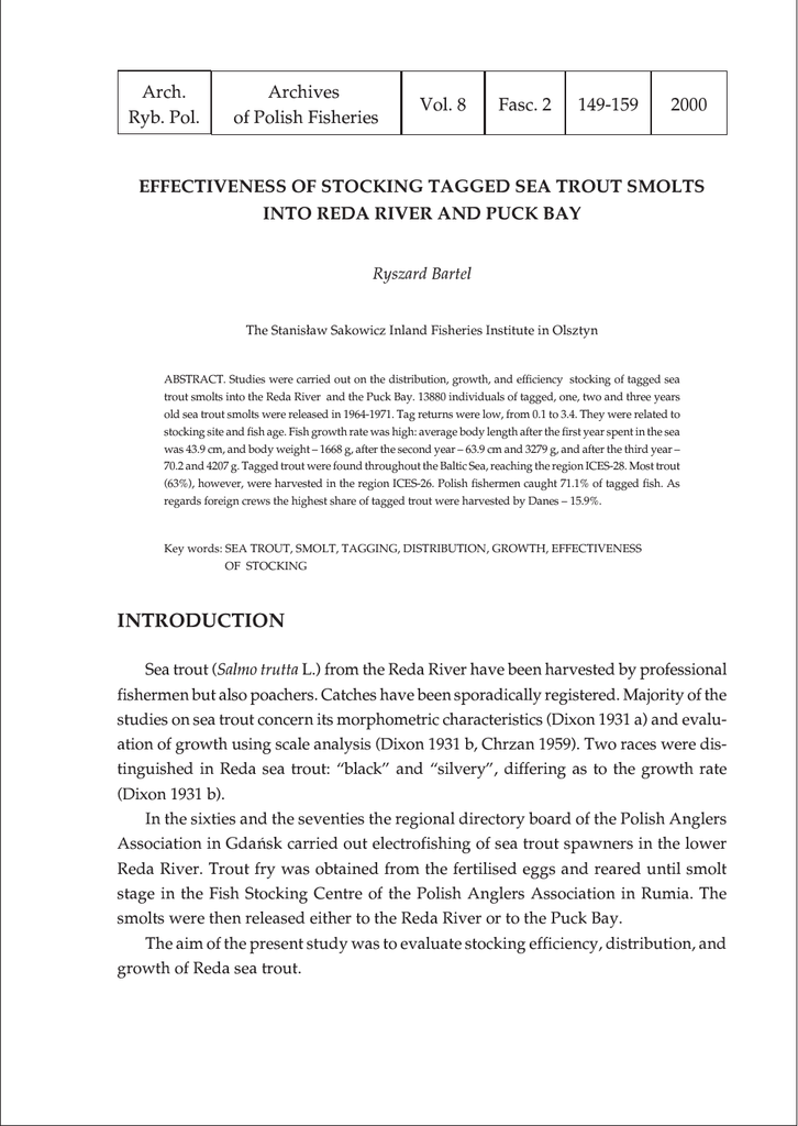 Arch. Ryb. Pol. Archives of Polish Fisheries Vol. 8 Fasc. 2 149-159 2000 EFFECTIVENESS OF STOCKING TAGGED SEA TROUT SMOLTS INTO REDA RIVER AND PUCK BAY Ryszard Bartel The Stanis³aw Sakowicz Inland Fisheries Institute in Olsztyn ABSTRACT. Studies were carried out on the distribution, growth, and efficiency stocking of tagged sea trout smolts into the Reda River and the Puck Bay. 13880 individuals of tagged, one, two and three years old sea trout smolts were released in 1964-1971. Tag returns were low, from 0.1 to 3.4. They were related to stocking site and fish age. Fish growth rate was high: average body length after the first year spent in the sea was 43.9 cm, and body weight – 1668 g, after the second year – 63.9 cm and 3279 g, and after the third year – 70.2 and 4207 g. Tagged trout were found throughout the Baltic Sea, reaching the region ICES-28. Most trout (63%), however, were harvested in the region ICES-26. Polish fishermen caught 71.1% of tagged fish. As regards foreign crews the highest share of tagged trout were harvested by Danes – 15.9%. Key words: SEA TROUT, SMOLT, TAGGING, DISTRIBUTION, GROWTH, EFFECTIVENESS OF STOCKING INTRODUCTION Sea trout (Salmo trutta L.) from the Reda River have been harvested by professional fishermen but also poachers. Catches have been sporadically registered. Majority of the studies on sea trout concern its morphometric characteristics (Dixon 1931 a) and evaluation of growth using scale analysis (Dixon 1931 b, Chrzan 1959). Two races were distinguished in Reda sea trout: “black” and “silvery”, differing as to the growth rate (Dixon 1931 b). In the sixties and the seventies the regional directory board of the Polish Anglers Association in Gdañsk carried out electrofishing of sea trout spawners in the lower Reda River. Trout fry was obtained from the fertilised eggs and reared until smolt stage in the Fish Stocking Centre of the Polish Anglers Association in Rumia. The smolts were then released either to the Reda River or to the Puck Bay. The aim of the present study was to evaluate stocking efficiency, distribution, and growth of Reda sea trout. 150 R. BARTEL MATERIAL AND METHODS Smolts reared in the Fish Stocking Centre of the Polish Anglers Association in Rumia were obtained from the spawners harvested using electric gear in 1964-1971 in the Reda River, and in 1964 in the Pogorzelica River, a tributary of the £eba River. The smolts were tagged with celluloid tags fastened under the anterior part of dorsal fin using a single silver or monel wire, and released to the lower Reda River in Mrzezino, and to the Puck Bay (Fig. 1). 13880 smolts were released in 1965-1974: 10693 fish aged 1-3 years were released to the Reda River and 3187, 2-3 years old fish to the Puck Bay (Tab. 1). TABLE 1 Experimental data, and stocking efficiency for tagged sea trout smolts released to the Reda River and the Puck Bay in 1965-1974 Released No. Harvested Number of ind. Average length (cm) Stocking Average efficiency mass (g) index Site Age 1 16.07.65 Reda 1+ 927 21.7 3 0.3 1 0.1 7760 8.3 2 16.07.66 Reda 1+ 1687 16.1 1 0.1 3 0.2 2200 3.9 4 0.2 4 0.2 2614 Older fish 2/ Date Totally sea trout aged 1+ Younger fish 1/ 3 10.05.73 Reda 1-2 1100 18.5 – – 8 0.7 2930 21.3 4 6-7.04.67 Reda 2 2426 17.8 10 0.4 16 0.7 2206 14.5 5 19.05.71 Reda 2 1138 21.2 – – 6 0.5 2760 5.7 6 18.05.72 Reda 2 986 20.7 6 0.6 12 12 2590 31.5 7 13.03.74 Reda 2 697 19.8 3462 39.7 Totally sea trout aged 2+ 5247 4 0.6 8 1.1 20 0.4 50 0.8 8 16.05.68 Reda 3 939 21.8 2 0.2 21 2.2 2525 56.5 9 18-20.05.68 Reda 3 790 24.9 – – 27 3.4 2695 92.1 Totally sea trout aged 3+ 1729 – 2 0.2 48 2.8 Totally sea trout aged 1-3 8079 – 22 0.3 102 1.3 10 28-29.04.67 Zat. Pucka 2 2514 17.7 3 0.1 18 0.7 2004 14.3 11 18.05.68 Zat. Pucka 3 673 23.7 – – 18 2.7 2262 60.5 Totally sea trout aged 2-3 3187 – 3 0.1 36 1.1 Totally sea trout experiments 1-11 13880 29 0.2 138 1.0 1/ the fish caught until the end of July of the year in which they were released 2/ the fish caught after the end of July of the year in which they were released Among the released fish, only 167 were caught: 29 “younger” fish harvested until July of the same year in which they were released, and 138 “older” individuals caught later. EFFECTIVENESS OF STOCKING TAGGED SEA TROUT SMOLTS INTO REDA... 151 Fig. 1. Stocking sites (arrows) of tagged sea trout Stocking efficiency was expressed by the ratio of weight of the fish caught to 1000 released smolts. If the information on fish weight was not available, average weight of the caught fish was used for the calculations. RESULTS AND DISCUSSION TAG RETURNS Very small number of tags were returned. Average returns were 1% from “older” fish and 0.2% from “younger” ones. The highest return rate was obtained from 3 years old smolts released to the Reda River in 1968. Return rate averaged 0.8% among the 2 years old smolts, ranging from 0.5% to 1.1%. The lowest return rate was obtained for the fish released to the Reda River in summer, 0.2% on the average. Among 2 and 3 152 R. BARTEL year-old smolts released into the Puck Bay the returns were similar as for the fish of the same age from the Reda River (Tab. 1). The results were low and similar to the return rates for the trout released in autumn (Bartel 1988). Such poor stocking efficiency might have resulted from environmental conditions rather than the quality of the stocking material. The latter was good as indicated by much higher returns of the fish of the same origin introduced into the £eba River and Gulf of Gdañsk. Among 3 years old smolts released to the £eba River in 1968, 22.8% of returns were obtained for “older” fish, and among 2 years old ones released in 1967-1974 the average rate of returns was 4.2% (2.4-9.7%). Stocking of the Gulf of Gdañsk was more efficient. In the group of 2 years old smolts introduced in 1971-1974, average return rate was 9.9% (4.1-18.8%), and as regards 3 years old ones release