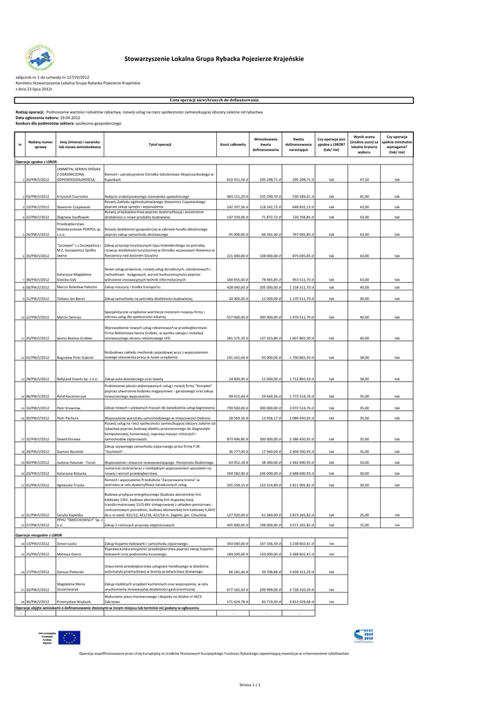 Stowarzyszenie Lokalna Grupa Rybacka Pojezierze Krajeńskie załącznik nr 1 do uchwały nr 127/IV/2012 Komitetu Stowarzyszenia Lokalna Grupa Rybacka Pojezierze Krajeńskie z dnia 23 lipca 2012r. Lista operacji niewybranych do dofinansowania Rodzaj operacji: Podnoszenie wartości roduktów rybactwa, rozwój usług na rzecz społeczności zamieszkującej obszary zależne od rybactwa Data ogłoszenia naboru: 19.04.2012 Konkurs dla podmiotów sektora: społeczno-gospodarczego Nadany numer sprawy Lp. Imię (imiona) i nazwisko lub nazwa wnioskodawcy Tytuł operacji Koszt całkowity Wnioskowana kwota dofinansowania Kwota dofinansowania narastająco Czy operacja jest zgodna z LSROR? (tak/ nie) Wynik oceny Czy operacja (średnia ocen) za spełnia minimalne lokalne kryteria wymagania? wyboru (tak/ nie) Operacje zgodne z LSROR 1 29/PW/I/2012 UNIMETAL SERWIS SPÓŁKA Z OGRANICZONĄ ODPOWIEDZIALNOŚCIĄ 2 03/PW/I/2012 Krzysztof Czarnotta 3 19/PW/I/2012 Sławomir Czapiewski 4 22/PW/I/2012 Zbigniew Szydłowski 26/PW/I/2012 Przedsiębiorstwo Wielobranżowe POKPOL sp. Rozwój działalności gospodarczej w zakresie handlu detalicznego z o.o. poprzez zakup samochodu dostawczego 6 35/PW/I/2012 "Szczepan" L.J.Szczepańscy i Zakup przyczep turystycznych typu holenderskiego na potrzeby M.Z. Szczepańscy Spółka rozwoju działalności turystycznej w Ośrodku wczasowym Rzewnica w Jawna Rzeczenicy nad Jeziorem Szczytno 7 38/PW/I/2012 Katarzyna Magdalena Kozicka-Iżyk Nowe usługi prawnicze, rozwój usług doradzczych, szkoleniowych i rachunkowo - księgowych, wzrost konkurencyjności poprzez wdrożenie innowacyjnych technik informatycznych 160 855,00 zł 8 09/PW/I/2012 Marcin Bolesław Hałucha Zakup maszyny i środka transportu. 428 040,00 zł 9 11/PW/I/2012 Tobiasz Jan Baran Zakup samochodu na potrzeby działalności budowlanej. 20 000,00 zł 10 12/PW/I/2012 Marcin Semrau Specjalistyczne urządzenie wiertnicze motorem rozwoju firmy i zakresu usług dla społeczności lokalnej. 5 Remont i uatrakcyjnienie Ośrodka Szkoleniowo-Wypoczynkowego w Kujankach Nabycie zrobotyzowanego stanowiska spawalniczego Rozwój Zakładu ogólnobudowlanego Sławomira Czapiewskiego poprzez zakup sprzętu i wyposażenia. Rozwój przędsiębiorstwa poprzez dywersyfikację i poszerzenie działalności o nowe produkty budowlane. 11 20/PW/I/2012 Iwona Bożena Grabiec Wprowadzenie nowych usług reklamowych w przedsiębiorstwie: Firma Reklamowa Iwona Grabiec, w wyniku zakupu i instalacji innowacyjnego ekranu reklamowego LED. 12 01/PW/I/2012 Bogusław Piotr Gabriel Rozbudowa zakładu mechaniki pojazdowej wraz z wyposażeniem nowego stanowiska pracy w nowe urządzenia. 13 28/PW/I/2012 Rallyland Events Sp. z o.o. Zakup auta dostawczego oraz lawety 610 451,56 zł 295 298,71 zł 295 298,71 zł tak 47,50 tak 483 151,20 zł 235 290,70 zł 530 589,41 zł tak 45,00 tak 242 397,56 zł 118 242,72 zł 648 832,13 zł tak 43,00 tak 147 339,06 zł 71 872,72 zł 720 704,85 zł tak 43,00 tak 95 000,00 zł 46 341,00 zł 767 045,85 zł tak 43,00 tak 221 400,00 zł 108 000,00 zł 875 045,85 zł tak 43,00 tak 78 465,85 zł 953 511,70 zł tak 43,00 tak 205 000,00 zł 1 158 511,70 zł tak 40,00 tak 12 000,00 zł 1 170 511,70 zł tak 40,00 tak 557 000,00 zł 300 000,00 zł 1 470 511,70 zł tak 40,00 tak 281 575,29 zł 137 353,80 zł 1 607 865,50 zł tak 40,00 tak 191 241,04 zł 93 000,00 zł 1 700 865,50 zł tak 38,00 tak 24 600,00 zł 12 000,00 zł 1 712 865,50 zł tak 38,00 tak 14 06/PW/I/2012 Rafał Kaczmarczyk Podniesienie jakości wykonywanych usług i rozwój firmy "Komplex" poprzez utworzenie budynku magazynowo - garażowego oraz zakup nowoczesnego wyposażenia. 99 415,44 zł 59 649,26 zł 1 772 514,76 zł tak 35,00 tak 15 16/PW/I/2012 Piotr Krawców Zakup nowych i używanych maszyn do świadczenia usług bagrowania 799 500,00 zł 300 000,00 zł 2 072 514,76 zł tak 35,00 tak 16 30/PW/I/2012 Piotr Pachura 28 569,16 zł 13 936,17 zł 2 086 450,93 zł tak 35,00 tak 17 32/PW/I/2012 Dawid Dorawa Wyposażenie warsztatu samochodowego w miejscowości Debrzno Rozwój usług na rzecz społeczności zamieszkującej obszary zależne od rybactwa poprzez budowę obiektu przeznaczonego do diagnostyki komputerowej, konserwacji, naprawy maszyn rolniczych i samochodów ciężarowych. 873 496,80 zł 300 000,00 zł 2 386 450,93 zł tak 35,00 tak Zakup używanego samochodu ciężarowego przez firmę P.W. "Szymtech". 36 777,00 zł 18 34/PW/I/2012 Szymon Nosiński 19 40/PW/I/2012 Justyna Halusiak - Toruń 20 23/PW/I/2012 21 41/PW/I/2012 22 31/PW/I/2012 23 27/PW/I/2012 17 940,00 zł 2 404 390,93 zł tak 35,00 tak 63 952,18 zł 38 300,00 zł 2 442 690,93 zł tak 33,00 tak Katarzyna Różycka Wyposażenie nowopowstającego Pensjonatu Rodzinnego Zakup tokarki ii otwarcie frezarki sterowanych numerycznie CNC/computer numerical control/wraz z niezbędnym wyposażeniem sposobem na rozwój i wzrost przedsiębiorstwa. 504 582,90 zł 246 000,00 zł 2 688 690,93 zł tak 30,00 tak Agnieszka Trocka Remont i wyposażenie Przedszkola "Zaczarowana kraina" w Jastrowiu w celu dywersyfikacji świadczonych usług. 205 358,15 zł 123 214,89 zł 2 811 905,82 zł tak 30,00 tak Budowa przyłącza energetycznego (budowa abonenckiej linii kablowej 15kV, budowa abonenckiej linii słupowej stacji transformatorowej 15/0,4kV zintegrowanej z układem pomiarowo rozliczeniowym pośrednim, budowa abonenckiej linii kablowej 0,4kV) dz.o nr ewid. 421/12, 421/18, 421/16 m. Zagórki, gm. Człuchów 127 920,00 zł 61 360,00 zł 2 873 265,82 zł tak 25,00 nie 405 900,00 zł 198 000,00 zł 3 071 265,82 zł tak 15,00 nie 343 040,00 zł 167 336,59 zł 3 238 602,41 zł nie 184 500,00 zł 150 000,00 zł 3 388 602,41 zł nie Cecylia Kapelska PPHU "ŚMIECHOWSCY" Sp. z o.o. Zakup 2 rolniczych przyczep objętościowych. Operacje niezgodne z LSROR 24 13/PW/I/2012 Zenon Łacko 25 15/PW/I/2012 Mateusz Giersz Zakup koparko-ładowarki i samochodu ciężarowego. Poprawa konkurencyjności przedsiębiorstwa poprzez zakup koparkoładow