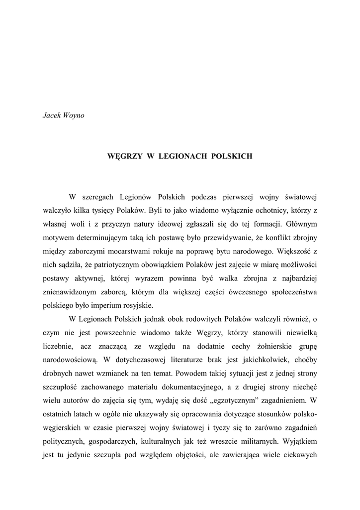 Jacek Woyno WĘGRZY W LEGIONACH POLSKICH W szeregach Legionów Polskich podczas pierwszej wojny światowej walczyło kilka tysięcy Polaków. Byli to jako wiadomo wyłącznie ochotnicy, którzy z własnej woli i z przyczyn natury ideowej zgłaszali się do tej formacji. Głównym motywem determinującym taką ich postawę było przewidywanie, że konflikt zbrojny między zaborczymi mocarstwami rokuje na poprawę bytu narodowego. Większość z nich sądziła, że patriotycznym obowiązkiem Polaków jest zajęcie w miarę możliwości postawy aktywnej, której wyrazem powinna być walka zbrojna z najbardziej znienawidzonym zaborcą, którym dla większej części ówczesnego społeczeństwa polskiego było imperium rosyjskie. W Legionach Polskich jednak obok rodowitych Polaków walczyli również, o czym nie jest powszechnie wiadomo także Węgrzy, którzy stanowili niewielką liczebnie, acz znaczącą ze względu na dodatnie cechy żołnierskie grupę narodowościową. W dotychczasowej literaturze brak jest jakichkolwiek, choćby drobnych nawet wzmianek na ten temat. Powodem takiej sytuacji jest z jednej strony szczupłość zachowanego materiału dokumentacyjnego, a z drugiej strony niechęć wielu autorów do zajęcia się tym, wydaję się dość „egzotycznym” zagadnieniem. W ostatnich latach w ogóle nie ukazywały się opracowania dotyczące stosunków polskowęgierskich w czasie pierwszej wojny światowej i tyczy się to zarówno zagadnień politycznych, gospodarczych, kulturalnych jak też wreszcie militarnych. Wyjątkiem jest tu jedynie szczupła pod względem objętości, ale zawierająca wiele ciekawych informacji praca o żołnierzach węgierskich stanowiących gros załogi twierdzy przemyskiej1. Niniejszy artykuł przynajmniej częściowo i w skromnym stosunkowo zakresie wypełni być może istniejącą w tym temacie lukę w polskiej historiografii Mimo wielowiekowej przecież przyjaźni między naszymi narodami niewiele wiemy o naszych wzajemnych powiązaniach i dotyczy to zarówno Węgrów jak i Polaków. Węgierskich ochotników w Legionach łączyła z ich polskimi towarzyszami broni nić sympatii, na którą miała wpływ świadomość zbliżonych losów obu narodów. Madziarzy brali przecież udział w poprzednich polskich zrywach narodowych, żeby wspomnieć ich walkę w oddziałach powstańczych w latach 1863—18642. Węgierscy ochotnicy w strukturach organizacyjnych formacji legionowych służyli zarówno w większych zwartych grupach, jak też porozrzucani byli pojedynczo w poszczególnych oddziałach.. Pierwszy oddział Węgrów przybył do II Brygady Legionów Polskich w Rafajłowej już w listopadzie 1914 roku, gdzie czasowo pozostawał jaka tzw. „Kompania Węgierska”. Po pewnym czasie Węgrzy zostali rozdzieleni do różnych pododdziałów 2 i 3 pułku piechoty legionów. Kilkunastu Węgrów było więc w szeregach II batalionu. 3 pułku piechoty legionów, który przemianowany został na III batalion 2 pułku legionów. Ich stan liczebny zaczął się jednak dość szybko zmniejszać3. Powody takiego rozwoju sytuacji nie są niestety bliżej znane. Brak jest jakichkolwiek wiadomości na ten temat i to zarówno w pozostałych po Legionach Polskich materiałach archiwalnych, jak również w niewielkiej liczbie opracowań i relacji powstałych już po 1918 roku. Na pewno jednak jak podkreślają to ich polscy towarzysze broni powodem wykruszenia się Węgrów z szeregów legionowych nie była ani dezercja, ani też dekownictwo, które tak często miało wówczas miejsce w innych formacjach wojskowych armii austro-węgierskiej. Można nawet zaryzykować stwierdzenie, że tutaj sytuacja była zupełnie odmienna, gdyż Węgrzy stanowili 1 Węgrzy w twierdzy przemyskiej w latach 1914—1915, red. István Lagzi. Wyd. Węgierski Instytut Kultury; Muzeum Narodowe Ziemi Przemyskiej, Warszawa-Przemyśl. 2 Patrz T. P o l a k, Węgrzy w powstaniu styczniowym 1863—1864, Studia i Materiały do Historii Wojskowości, t. V, Warszawa 1960. 3 Relacja mjr. Zygmunta Hofbauera, Kompania Węgierska następnie przydzielona do 2 i 3 pp II Bryg. Leg. Pol. CAW, I.400.1782, poz. 8, k. 14. element, który wstąpił do Legionów z pobudek natury czysto ideowej, często podkreślając, że chcą w ten sposób rewanżować się Polakom za pomoc, którą ci udzielili im w czasie walk narodowowyzwoleńczych w latach 1846—1848. Początkowo zresztą polscy legioniści nie za bardzo rozumieli motywy ideowe, którymi kierowali się Węgrzy wstępując do Legionów, często też pokpiwali sobie z nich z tego właśnie powodu. Wkrótce jednak „wszelkie różnice zatarły się i Węgrzy stali się serdecznymi przyjaciółmi i towarzyszami broni”4. Poziomem ideowym i zaangażowaniem w walce odpowiadali na przeciętnemu poziomowi legionów narodowości polskiej. Można ogólnie stwierdzić, że Węgrzy brali udział we wszystkich bitwach legionowych od momentu przekroczenia przełęczy Pantyrpas w październiku aż do końca grudnia 1914 roku. (Zawizów, Mołotków i szereg utarczek pod Zieloną i Pasieczną). W tych bojach i potyczkach byli zazwyczaj żołnierzami odważniejszymi niż przeciętny polski legionista5. Udział Węgrów w Legionach Polskich jak już wspomniano był wyrazem wielkiej sympatii żywionej przez nich do Polski i Polaków, był też swego rodzaju aktem wdzięczności za to co zrobił gen. Józef Bem i inni polscy ochotnicy w okresie Wiosny Ludów. Niemałą rolę odegrała tu też datująca się z tych samych czasów nienawiść Węgrów do Rosji. U Węgrów sympatia do Polaków była raczej ogólna, natomiast jeśli chodzi o Polaków i ich stosunek do Węgrów to sprawa była bardziej złożona. Sympatię do Węgrów odczuwali raczej tylko legioniści wywodzący się z Galicji, w przeciwieństwie do tych, którzy pochodzili z zaboru rosyjskiego. Sąd tych ostatnich o Węgrach był negatywny, gdyż pozostawali pod wpływem rosyjskiego punktu widzenia6. Warto równ