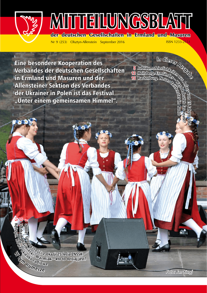 MITTEILUNGSBLATT der deutschen Gesellschaften in Ermland und Masuren Nr 9 (253) Olsztyn-Allenstein September 2016 ISSN 1233-2151 Nr. 11 (207) Olsztyn-Allenstein November 2012 ISSN 1233-2151 In di es e rA us 5 Jubiläumsfeierlichk e 12 Heilsberg. Ermländ iten a e 15 Rastenburg. Neue r – sZ be s von 25 Jahren VdG ga Anlas deutet das heute? us s be r im Radio wa tfenste ei Eine besondere Kooperation des Verbandes der deutschen Gesellschaften in Ermland und Masuren und der Allensteiner Sektion des Verbandes der Ukrainer in Polen ist das Festival „Unter einem gemeinsamen Himmel“. y c z iń 5 Opol e . U r o a r m o ki 13 Lidzb a r k W we t y 15 Kętrz y n . N o W st sk o ści z o kazji 25-lecia ZNSSK e n i. k o W a r m i ak – kto to dzisiaj jest? m ra n u dio w e m er ze Foto: Jan Kuryj Einladung Jubiläumskonzert Der Vorsitzende des Verbandes der deutschen sozial-kulturellen Gesellschaften in Polen Bernard Gaida gibt sich die Ehre zum Galakonzert einzuladen. Das Konzert findet aus Anlass des 25-Gründungsjubiläums des Verbandes der deutschen Gesellschaften und der Unterzeichnung des Nachbarschaftsvertrages am 8. Oktober 2016 in der Philharmonie in Allenstein (ul. B. Głowackiego 1) um 18.00 Uhr statt. Im Programm A. Vivaldi – Konzert C-Dur N. Porpora – Alto Giove aus der Oper „Polifemo“ G.F. Händel – Aria Lascia ch’io pianga aus der Oper „Rinaldo“ J.S. Bach – Jesu bleibt meine Freunde A. Vivaldi –Konzert C-Dur Aufführende Piotr Sułkowski – Dirgent Arkadiusz Krupa – Oboe Agnieszka Zwolska – Oboe Ewa Mrowca-Kościukiewicz – Cembalo Das Konzert wird von Mitteln des Auswertigen Amtes der Bundesrepublik Deutschland, des polnischen Innenministeriums und der Stiftung für deutsch-polnischen Zusammenarbeit finanziert. 2 9/2016 Allenstein. Festival im Amphitheater FORUM Unter einem gemeinsamen Himmel Eine besondere Kooperation des Verbandes der deutschen Gesellschaften in Ermland und Masuren und der Allensteiner Sektion des Verbandes der Ukrainer in Polen ist seit einigen Jahren das Festival der Nationen Europas „Unter einem gemeinsamen Himmel“. Die neunte Auflage ging am 14. August über die Bühne des Amphitheaters am Fuße der Allensteiner Burg. Ein leichter Nieselregen begleitete die letzten Vorbereitungen der auftretenden Künstler am 14. August, doch mit Beginn der Veranstaltung um 13 Uhr fielen nur die letzten Tropfen. Begrüßt wurden die Gäste, die das Halbrund des Amphitheaters in Allenstein gut füllten, von den Vorsitzenden der beiden Organisationen, Henryk Hoch und Stefan Migus. Grußworte gab es von den Bevollmächtigten für Minderheitenfragen beim Wojewodschaftsamt Monika Szustowicz und beim Marschallamt Wiktor Marek Leyk. Der Marschall der Wojewodschaft Ermland und Masuren Gustaw Marek Brzezin war darüber hinaus Schirmherr des Festivals. Von der Westukraine… Den Anfang machten in diesem Jahr die Mitglieder der Volkslieder- und -tanzgruppe „Wołyn“ aus der Ukraine. Das so genannte „verdiente Ensemble“ unter der Leitung von Oleksander Stadnik stammt aus Łuck, der Partnerstadt von Allenstein. Es präsentierte eine mitreißende Mischung aus melancholischen und schwungvollen Volksliedern sowie akrobatischen Tänzen. Aufmerksam beobachtet wurden die Künstler von den jungen Tänzern der Tanzgruppe „Saga“ der deutschen Minderheit in Bartenstein. Trotz des vollkommen anderen Programms finden sicher einige artistische Elemente von „Wołyn“ demnächst den Weg ins Training zumindest der Jungen von „Saga“. …bis nach Schlesien… Vor „Saga“ jedoch trat als Vertreter der deutschen Minderheit das „Kupskie Echo“ aus Kupp unter der künstlerischen Leitung von Agnieszka Ślusarczyk auf. Den Mitgliedern der Gruppe gelang es, mit kleinen zusätzlichen Elementen wie einem Fächer, Hut und Stock, oder einem Weinglas ihre Trachten der jeweiligen Atmosphäre der Lieder anzupassen und so das Publikum mitzuneh- men. Einen interessanten Kontrast dazu bildete die Gesangsgruppe „Słowiańska Dusza“ aus Danzig, die in ihrer Besetzung Polen, Ukrainer und Weißrussen verbindet und die entsprechenden Sprachen in ihre Lieder einfließen lässt. Gemeinsam seien ihnen, so der Gitarrist Igor Dubicki, die gemeinsamen slawischen Wurzeln und – wie der Name sagt – die slawische Seele. …und in moderne Zeiten Die Farben der Region vertraten neben „Saga“ folgende Gruppen der deutschen Minderheit: die jungen „Tannen“ aus Osterode, „Masurenklang“ aus Peitschendorf, „Stimme der Heimat“ aus Lötzen und „Warmia“ aus Heilsberg. Eingestreut ins Programm wurden die Solisten. Monika Krzenzek hatte ihre Schwester Wiktoria mitgebracht, die ebenso wie sie bereits den Wettbewerb des deutschen Liedes in Osterode gewinnen konnte, Mateusz Matlas trat gewohnt souverän auf und die erstmals beim Festival singende Magdalena Lobert zog mit ihrer Stimme selbst die Zuhörer in ihren Bann, die der deutschen Sprache nicht mächtig waren. Die ukrainische Seite vertraten die Kinder der Allensteiner Formation „Suzirjaczko“ und zum Abschluss die Folkrockgruppe „Karpatian“, die Volksmusik sehr viel moderner versteht als das Ensemble „Wołyn“. Mit elektrischer Verstärkung ist sie weithin zu hören und lockte noch einige Zuschauer ins Amphitheater, darunter ein Brautpaar, dem das Publikum mit dem polnischen „Sto lat“ ein lautstarkes Ständchen brachte. Ein Wermutstropfen für die Veranstaltung war das Fehlen der Roma-Gruppe „Hitano“ aus Allenstein, die wegen der Erkrankung ihres Leiters Adam Federowicz kurzfristig absagen musste. Am Ende stand dennoch ein rundes Bild der aktuellen Ausgabe des Festivals der Nationen Europas „Unter einem gemeinsamen Himmel“. Dies gelang dank der finanziellen Unterstützung des Innen- und des Kultusministeriums Polens sowie des Marschallamtes der Wojewodschaft Ermland-Masuren, und der tatkräftigen Unterstützung durch das Kulturzentrum der Stadt Allenstein. Text und Bild: Uwe Hahnkamp 9/2016 3 