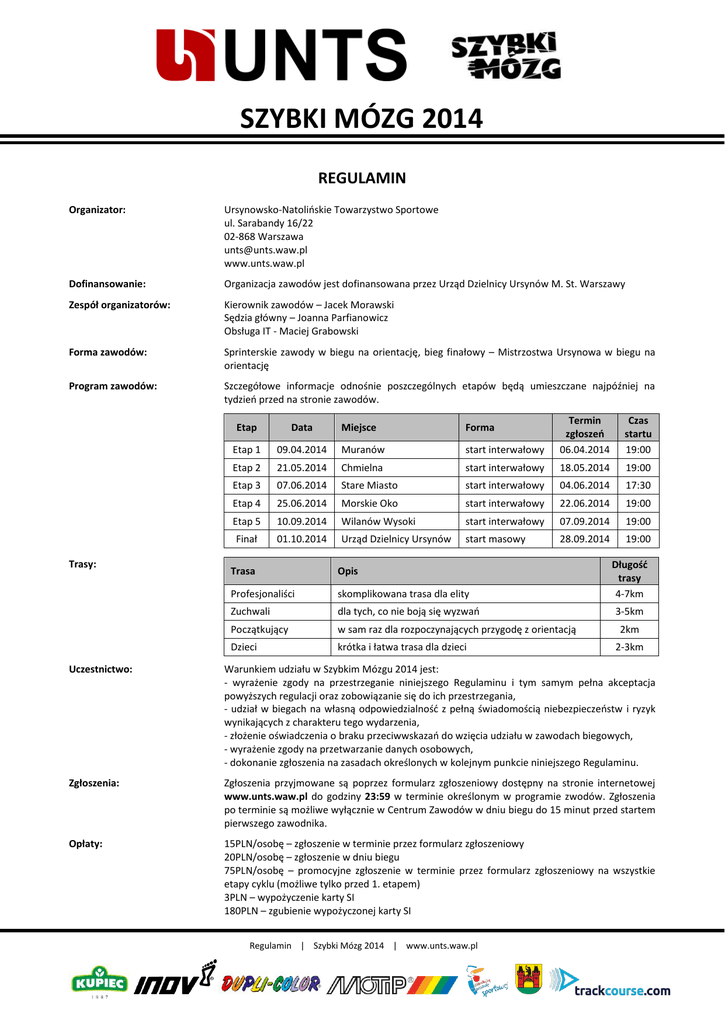 SZYBKI MÓZG 2014 REGULAMIN Organizator: Ursynowsko-Natolioskie Towarzystwo Sportowe ul. Sarabandy 16/22 02-868 Warszawa [email protected] www.unts.waw.pl Dofinansowanie: Organizacja zawodów jest dofinansowana przez Urząd Dzielnicy Ursynów M. St. Warszawy Zespół organizatorów: Kierownik zawodów – Jacek Morawski Sędzia główny – Joanna Parfianowicz Obsługa IT - Maciej Grabowski Forma zawodów: Sprinterskie zawody w biegu na orientację, bieg finałowy – Mistrzostwa Ursynowa w biegu na orientację Program zawodów: Szczegółowe informacje odnośnie poszczególnych etapów będą umieszczane najpóźniej na tydzieo przed na stronie zawodów. Trasy: start interwałowy Termin zgłoszeo 06.04.2014 Czas startu 19:00 start interwałowy 18.05.2014 19:00 Stare Miasto start interwałowy 04.06.2014 17:30 25.06.2014 Morskie Oko start interwałowy 22.06.2014 19:00 10.09.2014 Wilanów Wysoki start interwałowy 07.09.2014 19:00 01.10.2014 Urząd Dzielnicy Ursynów start masowy 28.09.2014 19:00 Etap Data Miejsce Forma Etap 1 Etap 2 09.04.2014 Muranów 21.05.2014 Chmielna Etap 3 07.06.2014 Etap 4 Etap 5 Finał Trasa Opis Profesjonaliści skomplikowana trasa dla elity Zuchwali dla tych, co nie boją się wyzwao Początkujący w sam raz dla rozpoczynających przygodę z orientacją Dzieci krótka i łatwa trasa dla dzieci Długośd trasy 4-7km 3-5km 2km 2-3km Uczestnictwo: Warunkiem udziału w Szybkim Mózgu 2014 jest: - wyrażenie zgody na przestrzeganie niniejszego Regulaminu i tym samym pełna akceptacja powyższych regulacji oraz zobowiązanie się do ich przestrzegania, - udział w biegach na własną odpowiedzialnośd z pełną świadomością niebezpieczeostw i ryzyk wynikających z charakteru tego wydarzenia, - złożenie oświadczenia o braku przeciwwskazao do wzięcia udziału w zawodach biegowych, - wyrażenie zgody na przetwarzanie danych osobowych, - dokonanie zgłoszenia na zasadach określonych w kolejnym punkcie niniejszego Regulaminu. Zgłoszenia: Zgłoszenia przyjmowane są poprzez formularz zgłoszeniowy dostępny na stronie internetowej www.unts.waw.pl do godziny 23:59 w terminie określonym w programie zwodów. Zgłoszenia po terminie są możliwe wyłącznie w Centrum Zawodów w dniu biegu do 15 minut przed startem pierwszego zawodnika. Opłaty: 15PLN/osobę – zgłoszenie w terminie przez formularz zgłoszeniowy 20PLN/osobę – zgłoszenie w dniu biegu 75PLN/osobę – promocyjne zgłoszenie w terminie przez formularz zgłoszeniowy na wszystkie etapy cyklu (możliwe tylko przed 1. etapem) 3PLN – wypożyczenie karty SI 180PLN – zgubienie wypożyczonej karty SI Regulamin | Szybki Mózg 2014 | www.unts.waw.pl Płatności: W przypadku osób zgłoszonych przez formularz zgłoszeniowy jedyną możliwością jest wniesienie opłaty w terminie zgłoszeo poprzez system płatności online dostępny na stronie www.unts.waw.pl. Nie ma możliwości przeniesienia wniesionego wpisowego na rzecz innego zawodnika. Osoby, które zgłosiły się przez formularz zgłoszeniowy, a nie dokonały wpłaty wpisowego w terminie zgłoszeo zostaną wykreślone z listy zgłoszonych i w razie chęci udziału w biegu będą musiały dokonad ponownej rejestracji w dniu zawodów. W przypadku osób zgłoszonych w dniu zawodów jedyną akceptowaną formą wniesienia opłaty za udział w zawodach jest płatnośd gotówką. Poprzez dokonanie opłaty uczestnik potwierdza, że zapoznał się z regulaminem i zobowiązuje się do jego przestrzegania oraz wyraża zgodę na przetwarzanie swoich danych osobowych na potrzeby organizacji zawodów Szybki Mózg 2014. Potwierdzanie PK: Zawody zostaną przeprowadzone przy użyciu elektronicznego systemu potwierdzania punktów kontrolnych i pomiaru czasu SPORTident. Dla osób, które nie posiadają kart SPORTident istnieje możliwośd ich wypożyczenia w dniu biegu. Chęd wypożyczenia karty SI należy zgłosid w formularzu zgłoszeniowym, a także wnieśd opłatę za jej wypożyczenie. GPS-tracking: Podczas każdego etapu wybraną grupę zawodników wyposażymy w odbiorniki GPS, dzięki czemu będzie można na żywo śledzid ich poczynania na trasie. Lista zawodników biegających z odbiornikami GPS będzie publikowana wraz z listami startowymi przed każdym etapem. Limit uczestników: Na zawodach nie obowiązuje limit uczestników, natomiast liczba osób, które mogą się zapisad na bieg w dniu zawodów będzie ograniczona do 10 osób w każdej kategorii. Limit czasu: Podczas zawodów wszystkich zawodników obowiązuje limit czasu, który wynosi 60 minut. Oznacza to, że osoby, które go przekroczą mogą nie zostad sklasyfikowane. Start: Zawodnicy startują indywidualnie w określonym interwale czasowym (start interwałowy) lub jednocześnie (start masowy) w zależności od formy rozgrywania danego etapu. Szczegółowe listy startowe zawierające godzinę startu każdego zawodnika będą publikowane na stronie zawodów najpóźniej na dzieo przed zawodami. Wyniki: Wyniki poszczególnych etapów będą publikowane na stronie zawodów po każdym etapie. Klasyfikacja generalna: Podczas tegorocznej edycji Szybkiego Mózgu prowadzona będzie klasyfikacja generalna kobiet i mężczyzn w kategoriach wiekowych: Kategoria kobieca Kategoria męska KM10 Wiek w latach Rok urodzenia 10 i mniej 2004 i młodsi K12 M12 11-14 2003-2000 K16 M16 15-19 1999-1995 K20 M20 20-29 1994-1985 K30 M30 30-39 1984-1975 K40 M40 40-49 1974-1965 K50 M50 50-59 1964-1955 K60 M60 60 i więcej 1954 i starsi Po rozegraniu 5 etapów w każdej z kategorii wiekowych zostanie wyłoniony zwycięzca, który otrzyma tytuł „Szybkiego Mózgu 2014”. Do klasyfikacji generalnej wliczane będą 3 najlepsze wyniki z 5 pierwszych etapów, a punkty za dany etap będą przyznawane według tabeli: Trasa Miejsce 1 2 3 4 5 6 7 8 9 10 … Profesjonaliści 100 95 90 87 84 81 80 79 78 77 … Zuchwali 80 75 70 67 64 61 60 59 58 57 … Początkujący 40 35 30 27 24 21 20 19 18 17 … Dzieci 50 45 40 37 34 31 30 29 2