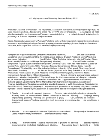 Pobrano z portalu Mapa Kultury 17.05.2012 42. Międzynarodowe Warsztaty Jazzowe Puławy 2012 ____________________________ autor: Warsztaty Jazzowe w Puławach - to najstarsze, a zarazem wzorcowe przedsięwzięcie tego typu na skalę międzynarodową. Zainicjowane przez PSJ w 1970 roku w Chodzieży, a następnie od 1990 roku bezpośrednio kontynuowane w Puławach, pozostaje jedną z najważniejszych instytucji ruchu jazzowego w Polsce o niepowtarzalnej atmosferze. Kadra „Warsztatów Jazzowych w Puławach” złożona jest z wybitnych polskich i zagranicznych artystów jazzowych, wyróżniających się profesjonalnym przygotowaniem pedagogicznym, będących leaderami zespołów, kompozytorami, solistami o renomie międzynarodowej. Fortepian: dr Wojciech Niedziela (Akademia Muzyczna Katowice), dr Kuba Stankiewicz (Akademia Muzyczna Zielona Góra) Kontrabas, gitara basowa: dr Jacek Niedziela-Meira (Akademia Muzyczna, Katowice), Kamil Erdem (Yildiz Technical University, Istanbul,Turcja), Gitara: Artur Lesicki (Szkoła Jazzu i Muzyki Rozrywkowej, Wrocław), Konrad Zemler - solista, kompozytor Trąbka, puzon: Dante Luciani (Miami University, USA) Sax, flet: Peter Brewer (Doctor of Musical Arts, Miami University, USA) Perkusja: Zbigniew Lewandowski (Szkoła Jazzu i Muzyki Rozrywkowej, Wrocław) Big band: Dante Luciani (Miami University, USA) Vocal: Sibel Kose (Vocal Jazz Studio, Istanbul), dr.Janusz Szrom (Wydział Jazzu Zesp.Szkół Muz. im. F.Chopina, Warszawa) Historia jazzu: dr.Jacek Niedziela-Meira (Akademia Muzyczna, Katowice) Teoria improwizacji: Janusz Szprot (Bilkent University) Sekcje rytmiczne akompaniujące solistom i wokalistom: - Wojciech Majewski /p/, Wojciech Pulcyn /b/, Kazimierz Jonkisz /dr/ - Bogdan Hołownia /p/, dr. Mariusz Bogdanowicz /b/, Sebastian Frankiewicz /dr/ Zajęcia dodatkowe: Nauka emisji techniką Speech Level Singing (NVP): Marek Stawiński Kierownik dydaktyczny: Janusz Szprot Program dydaktyczny Warsztatów uwzględnia standardy przyjęte w IAJE (International Association for Jazz Education). Obok zajęć grupowych i indywidualnych, prowadzone są zespoły – big band i combo, wykłady – teoria i historia stylów jazzowych, a całodzienne zajęcia wieńczą koncerty i jam sessions. 1. Teoria improwizacji – wykłady Janusza Szprota, założyciela i długoletniego kierownika Katedry Jazzu na amerykańskim Bilkent University w Ankarze. Wykłady obejmują zasady improwizacji jazzowej. Pomocą jest podręcznik z płytą CD „Materiały do ćwiczeń improwizacji jazzowej” będący abecadłem teorii jazzu oraz prezentujący, jak się uczyć jazzu w praktyce. 2. Historia jazzu - wykłady b.dziekana Wydziału Jazzu Akademii Jacka Niedzieli-Meiry ilustrowane przykładami audio i video. Muzycznej w Katowicach dr 3. Klasy instrumentalne - zajęcia indywidualne i grupowe w zakresie podstaw techniki instrumentalnej, artykulacji, kształtowania dźwięku, frazowania, barwy, dynamiki, a także strona 1 / 3 Pobrano z portalu Mapa Kultury kompozycja jazzowa, stylistyka, transkrypcje solówek i praca nad przygotowaniem nowego utworu. indywidualnym i zespołowym 4. Klasy wokalne - zajęcia indywidualne i w grupach z udziałem akompaniamentu sekcji rytmicznych: podstawy harmoniki i improwizacja „scat”, różnorodność stylistyki jazzowej, emisja głosu, rytmika jazzowa. 5. Klasa zespołów instrumentalnych - podstawy kompozycji i aranżacji, praca nad zespołowym przygotowaniem materiału. Opiekunem zespołów będzie w tym roku dr Peter Brewer, wybitny saksofonista i pedagog z Miami University. 6. Klasa big bandu jazzowego prowadzona przez doświadczonego i band leadera Dante Lucianiego z Miami University. amerykańskiego puzonistę Puławski Ośrodek Kultury „Dom Chemika” posiadający 15 klas lekcyjnych wyposażonych w instrumenty i aparaturę oraz 2 sale koncertowe zapewnia idealne warunki do prowadzenia zajęć zarówno indywidualnych i zespołowych. Codziennie w godzinach wieczornych, na dużej scenie odbywają się publiczne koncerty profesjonalnych zespołów w różnorodnym stylistycznie repertuarze, prezentujące główne nurty współczesnego jazzu. Późnym wieczorem kadra i uczestnicy spotykają się na tzw. „jam sessions”. Do dyspozycji uczestników Warsztatów jest biblioteka muzyczna wyposażona w ponad 10.000 woluminów, nut i materiałów szkoleniowych oraz materiałów dydaktycznych z kolekcji Jamey Aebersolda. Jest to obecnie największy zbiór tego rodzaju w Polsce i służy uczestnikom Warsztatów nie tylko w czasie ich trwania. Podczas Warsztatów Jazzowych uczestników obwiązują: 1. Regulamin Warsztatów Jazzowych zawierający zasady zachowania się podczas całego okresu trwania Warsztatów oraz zalecenia szczególnej ostrożności w posługiwaniem się sprzętem muzycznym i wyposażeniem klas wykładowych. 2. Regulamin Bursy Szkół Zawodowych, związany z warunkami zakwaterowania. Plan dnia: 08.00 - 09.30 śniadanie, bursa 10.00 - 11.00 Teoria improwizacji jazzowej, Janusz Szprot - wykład dla wszystkich uczestników, sala koncertowa 11.00 - 14.30 klasy instrumentalne i wokalne 15.00 - 16.00 obiad, bursa 16.00 - 18.30 zespoły, big band i zajęcia indywidualne 19.00 20.00 kolacja, bursa 20.00 - 21.00 Historia jazzu, dr. Jacek Niedziela-Meira, wykład dla wszystkich uczestników, Mała Sala Koncertowa 21:00 - 03.00 koncert - Sala Koncertowa; jam-session - kawiarnia „Smok” Zapisy: do dnia 30.06.2012 r. 1. poprzez 2. listownie: formularz zgłoszeniowy na stronie internetowej www.pok.cad.pl Puławski Ośrodek Kultury „Dom Chemika” ul. Wojska Polskiego 4 24-100 Puławy Koszt udziału w Warsztatach - 950 zł. obejmuje także: zakwaterowanie, wyżywienie, publiczne koncerty strona 2 / 3 Pobrano z portalu Mapa Kultury oraz unikalny podręcznik Janusz Szprota „Materiały do ćwiczeń improwizacji jazzowej +CD”. Konto bankowe do wpłat: 32 1560 0013 2367 1256 5276 0002 (Getin Bank). Organizatorzy: Fundacja Jazz Jamboree Polskie S