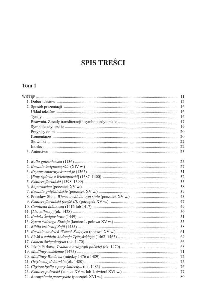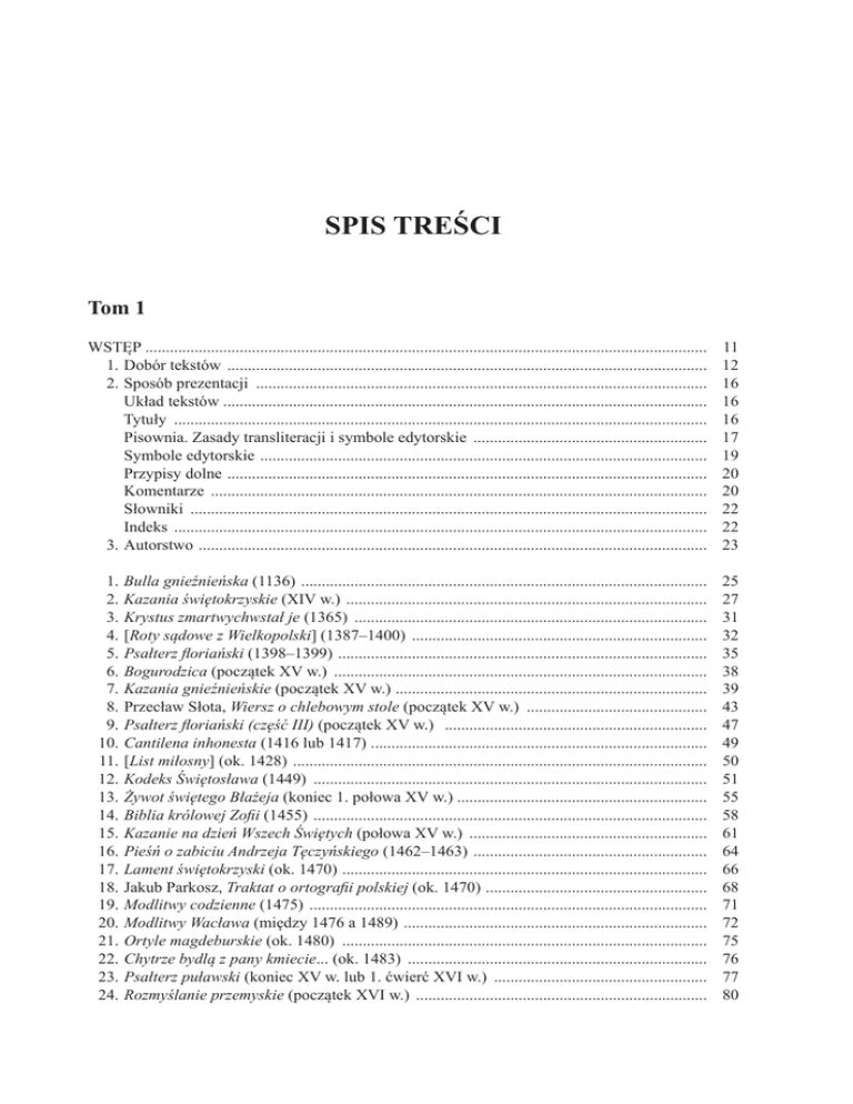 SPIS TREŚCI Tom 1 WSTĘP .......................................................................................................................................... 1.Dobór tekstów ...................................................................................................................... 2.Sposób prezentacji ............................................................................................................... Układ tekstów ...................................................................................................................... Tytuły ................................................................................................................................... Pisownia. Zasady transliteracji i symbole edytorskie .......................................................... Symbole edytorskie .............................................................................................................. Przypisy dolne ...................................................................................................................... Komentarze .......................................................................................................................... Słowniki ............................................................................................................................... Indeks ................................................................................................................................... 3.Autorstwo ............................................................................................................................. 11 12 16 16 16 17 19 20 20 22 22 23 1.Bulla gnieźnieńska (1136) .................................................................................................... 2.Kazania świętokrzyskie (XIV w.) ......................................................................................... 3.Krystus zmartwychwstał je (1365) ....................................................................................... 4.[Roty sądowe z Wielkopolski] (1387–1400) ......................................................................... 5.Psałterz floriański (1398–1399) ........................................................................................... 6.Bogurodzica (początek XV w.) ............................................................................................ 7.Kazania gnieźnieńskie (początek XV w.) ............................................................................. 8.Przecław Słota, Wiersz o chlebowym stole (początek XV w.) ............................................. 9.Psałterz floriański (część III) (początek XV w.) ................................................................. 10.Cantilena inhonesta (1416 lub 1417) ................................................................................... 11.[List miłosny] (ok. 1428) ...................................................................................................... 12.Kodeks Świętosława (1449) ................................................................................................. 13.Żywot świętego Błażeja (koniec 1. połowa XV w.) ............................................................. 14.Biblia królowej Zofii (1455) ................................................................................................. 15.Kazanie na dzień Wszech Świętych (połowa XV w.) ........................................................... 16.Pieśń o zabiciu Andrzeja Tęczyńskiego (1462–1463) .......................................................... 17.Lament świętokrzyski (ok. 1470) .......................................................................................... 18.Jakub Parkosz, Traktat o ortografii polskiej (ok. 1470) ....................................................... 19.Modlitwy codzienne (1475) .................................................................................................. 20.Modlitwy Wacława (między 1476 a 1489) ........................................................................... 21.Ortyle magdeburskie (ok. 1480) .......................................................................................... 22.Chytrze bydlą z pany kmiecie... (ok. 1483) .......................................................................... 23.Psałterz puławski (koniec XV w. lub 1. ćwierć XVI w.) ..................................................... 24.Rozmyślanie przemyskie (początek XVI w.) ........................................................................ 25 27 31 32 35 38 39 43 47 49 50 51 55 58 61 64 66 68 71 72 75 76 77 80 6 25.Reguła zakonu św. Klary (początek XVI lub przełom XV i XVI w.) .................................. 86 26.Modlitwy codzienne (początek XVI w.) ............................................................................... 91 27.Jan Konarski, Mowa powitalna (między 1512 a 1515) ....................................................... 92 28.Biernat z Lublina, [Przypowieści] (1522) ............................................................................ 93 29.[Rozmówki polsko-niemieckie] (1523) ................................................................................. 95 30.[Przepisy] (1. połowa XVI w.) ............................................................................................. 96 31.Walenty Wróbel, Żołtarz Dawida Proroka (1528) ............................................................... 98 32.Stanisław Kucieński, List do Mikołaja Szydłowieckiego (1529) ......................................... 102 33.List do burmistrza i rajców miasta Bardiowa (1530) .......................................................... 103 34.Olbracht Gasztołd, List do Mikołaja Nipszyca (1531) ......................................................... 104 35.Stefan Falimirz, O ziołach i mocy ich… (1534) ........................................................