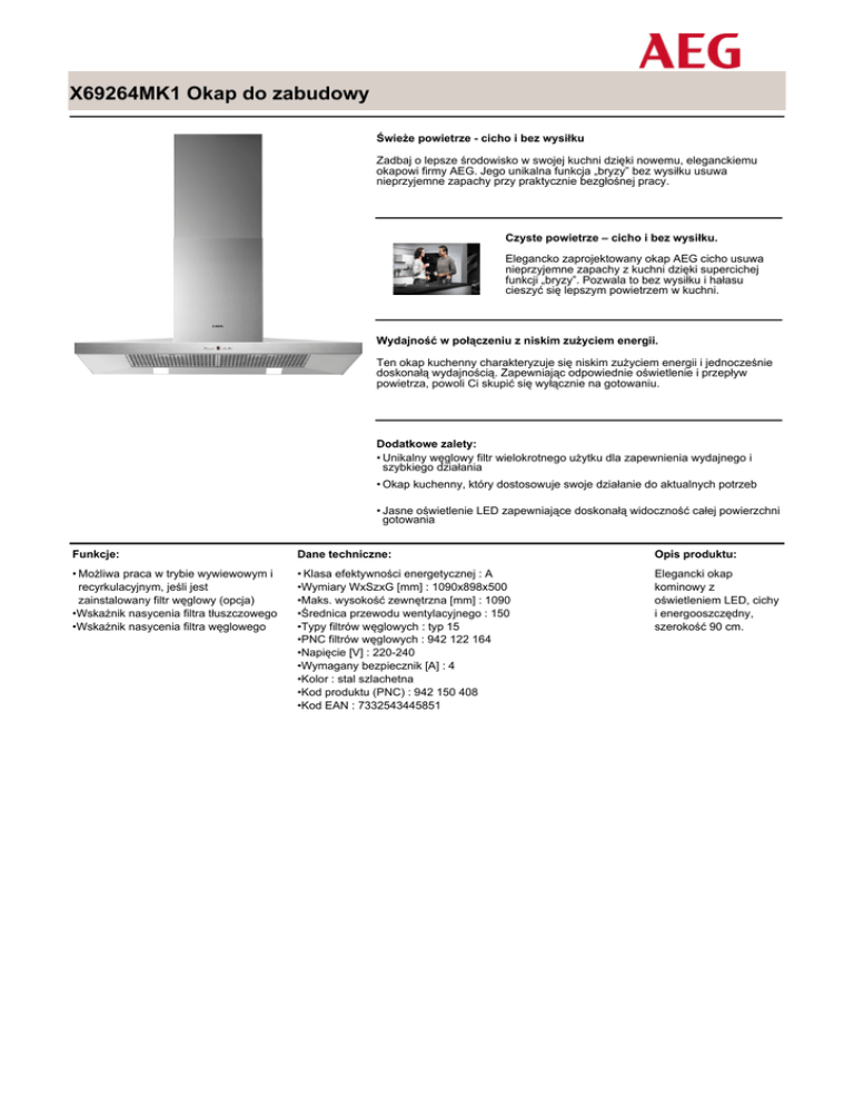X69264MK1 Okap do zabudowy Świeże powietrze - cicho i bez wysiłku Zadbaj o lepsze środowisko w swojej kuchni dzięki nowemu, eleganckiemu okapowi firmy AEG. Jego unikalna funkcja „bryzy” bez wysiłku usuwa nieprzyjemne zapachy przy praktycznie bezgłośnej pracy. Czyste powietrze – cicho i bez wysiłku. Elegancko zaprojektowany okap AEG cicho usuwa nieprzyjemne zapachy z kuchni dzięki supercichej funkcji „bryzy”. Pozwala to bez wysiłku i hałasu cieszyć się lepszym powietrzem w kuchni. Wydajność w połączeniu z niskim zużyciem energii. Ten okap kuchenny charakteryzuje się niskim zużyciem energii i jednocześnie doskonałą wydajnością. Zapewniając odpowiednie oświetlenie i przepływ powietrza, powoli Ci skupić się wyłącznie na gotowaniu. Dodatkowe zalety: • Unikalny węglowy filtr wielokrotnego użytku dla zapewnienia wydajnego i szybkiego działania • Okap kuchenny, który dostosowuje swoje działanie do aktualnych potrzeb • Jasne oświetlenie LED zapewniające doskonałą widoczność całej powierzchni gotowania Funkcje: Dane techniczne: Opis produktu: • Możliwa praca w trybie wywiewowym i recyrkulacyjnym, jeśli jest zainstalowany filtr węglowy (opcja) •Wskaźnik nasycenia filtra tłuszczowego •Wskaźnik nasycenia filtra węglowego • Klasa efektywności energetycznej : A •Wymiary WxSzxG [mm] : 1090x898x500 •Maks. wysokość zewnętrzna [mm] : 1090 •Średnica przewodu wentylacyjnego : 150 •Typy filtrów węglowych : typ 15 •PNC filtrów węglowych : 942 122 164 •Napięcie [V] : 220-240 •Wymagany bezpiecznik [A] : 4 •Kolor : stal szlachetna •Kod produktu (PNC) : 942 150 408 •Kod EAN : 7332543445851 Elegancki okap kominowy z oświetleniem LED, cichy i energooszczędny, szerokość 90 cm. X69264MK1 Okap do zabudowy