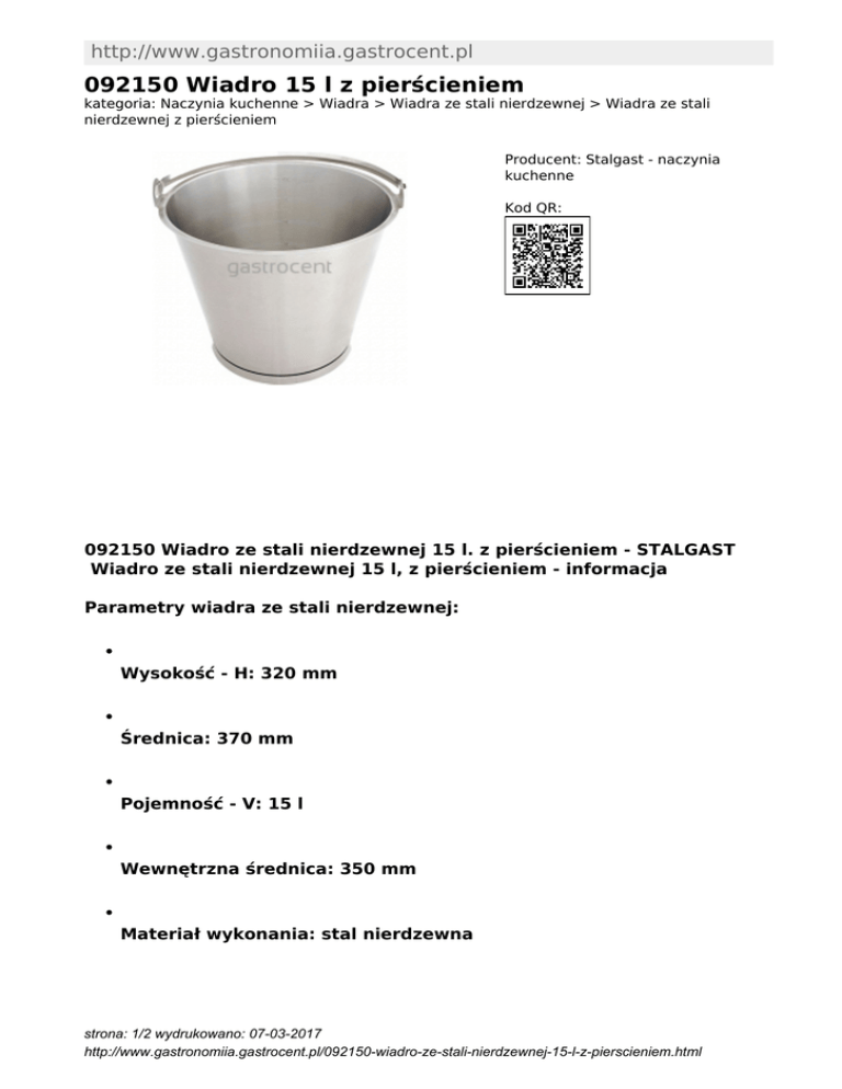 http://www.gastronomiia.gastrocent.pl 092150 Wiadro 15 l z pierścieniem kategoria: Naczynia kuchenne > Wiadra > Wiadra ze stali nierdzewnej > Wiadra ze stali nierdzewnej z pierścieniem Producent: Stalgast - naczynia kuchenne Kod QR: 092150 Wiadro ze stali nierdzewnej 15 l. z pierścieniem - STALGAST Wiadro ze stali nierdzewnej 15 l, z pierścieniem - informacja Parametry wiadra ze stali nierdzewnej: Wysokość - H: 320 mm Średnica: 370 mm Pojemność - V: 15 l Wewnętrzna średnica: 350 mm Materiał wykonania: stal nierdzewna strona: 1/2 wydrukowano: 07-03-2017 http://www.gastronomiia.gastrocent.pl/092150-wiadro-ze-stali-nierdzewnej-15-l-z-pierscieniem.html Opis wiadra ze stali nierdzewnej: wiadro z pierścieniem podziałka wewnątrz w litrach średnica podstawy 232 mm do wiadra pasuje pokrywa ze stali nierdzewnej 093150 Produkt był dostępny do katalogu 2015-2016 aktualnie towar wycofany. strona: 2/2 wydrukowano: 07-03-2017 http://www.gastronomiia.gastrocent.pl/092150-wiadro-ze-stali-nierdzewnej-15-l-z-pierscieniem.html