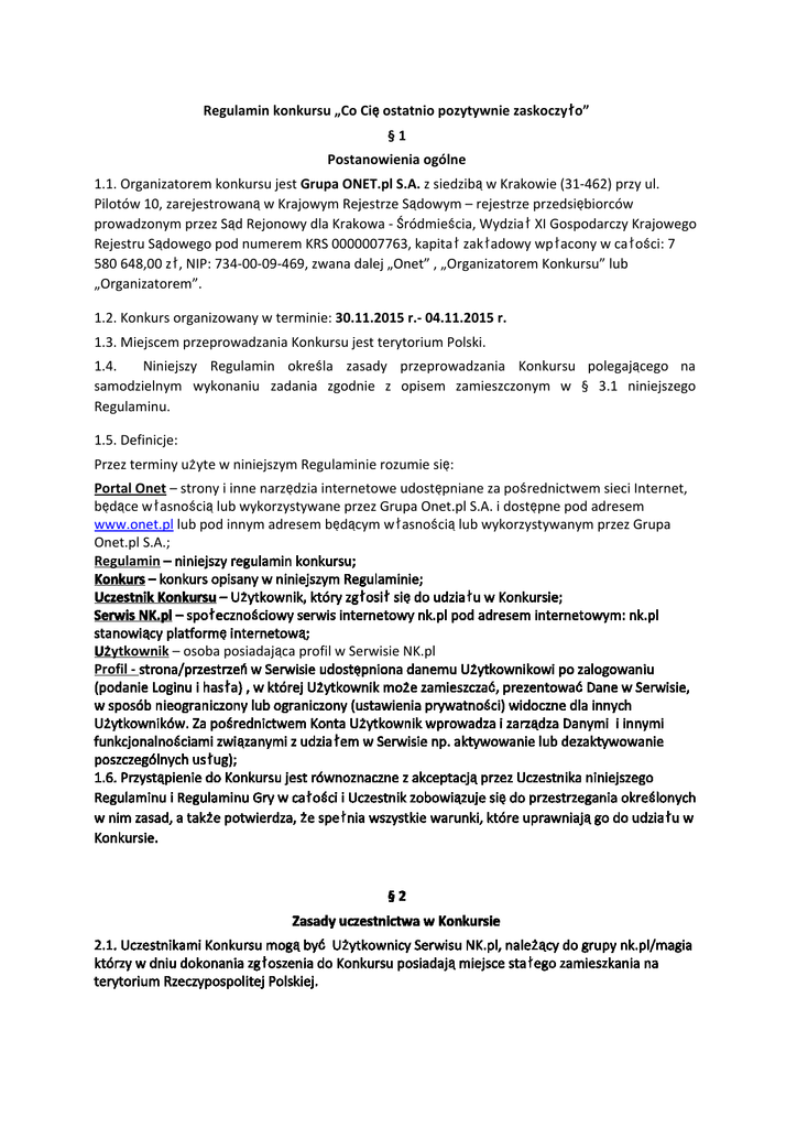 Regulamin konkursu „Co Cięostatnio pozytywnie zaskoczyło” §1 Postanowienia ogólne 1.1. Organizatorem konkursu jest Grupa ONET.pl S.A. z siedzibąw Krakowie (31-462) przy ul. Pilotów 10, zarejestrowanąw Krajowym Rejestrze Sądowym – rejestrze przedsiębiorców prowadzonym przez Sąd Rejonowy dla Krakowa - Śródmieścia, WydziałXI Gospodarczy Krajowego Rejestru Sądowego pod numerem KRS 0000007763, kapitałzakładowy wpłacony w całości: 7 580 648,00 zł, NIP: 734-00-09-469, zwana dalej „Onet” , „Organizatorem Konkursu” lub „Organizatorem”. 1.2. Konkurs organizowany w terminie: 30.11.2015 r.- 04.11.2015 r. 1.3. Miejscem przeprowadzania Konkursu jest terytorium Polski. 1.4. Niniejszy Regulamin określa zasady przeprowadzania Konkursu polegającego na samodzielnym wykonaniu zadania zgodnie z opisem zamieszczonym w § 3.1 niniejszego Regulaminu. 1.5. Definicje: Przez terminy użyte w niniejszym Regulaminie rozumie się: Portal Onet – strony i inne narzędzia internetowe udostępniane za pośrednictwem sieci Internet, będące własnościąlub wykorzystywane przez Grupa Onet.pl S.A. i dostępne pod adresem www.onet.pl lub pod innym adresem będącym własnościąlub wykorzystywanym przez Grupa Onet.pl S.A.; Regulamin – niniejszy regulamin konkursu; Konkurs – konkurs opisany w niniejszym Regulaminie; Uczestnik Konkursu – Użytkownik, który zgłosiłsiędo udziału w Konkursie; Serwis NK.pl – społecznościowy serwis internetowy nk.pl pod adresem internetowym: nk.pl stanowiący platformęinternetową; Użytkownik – osoba posiadająca profil w Serwisie NK.pl Profil - strona/przestrzeńw Serwisie udostępniona danemu Użytkownikowi po zalogowaniu (podanie Loginu i hasła) , w której Użytkownik może zamieszczać, prezentowaćDane w Serwisie, w sposób nieograniczony lub ograniczony (ustawienia prywatności) widoczne dla innych Użytkowników. Za pośrednictwem Konta Użytkownik wprowadza i zarządza Danymi i innymi funkcjonalnościami związanymi z udziałem w Serwisie np. aktywowanie lub dezaktywowanie poszczególnych usług); 1.6. Przystąpienie do Konkursu jest równoznaczne z akceptacjąprzez Uczestnika niniejszego Regulaminu i Regulaminu Gry w całości i Uczestnik zobowiązuje siędo przestrzegania określonych w nim zasad, a także potwierdza, że spełnia wszystkie warunki, które uprawniajągo do udziału w Konkursie. §2 Zasady uczestnictwa w Konkursie 2.1. Uczestnikami Konkursu mogąbyćUżytkownicy Serwisu NK.pl, należący do grupy nk.pl/magia którzy w dniu dokonania zgłoszenia do Konkursu posiadająmiejsce stałego zamieszkania na terytorium Rzeczypospolitej Polskiej. 2.2. W przypadku osób niepełnoletnich uczestniczących w Konkursie Organizator zastrzega sobie prawo do wydania nagrody po otrzymania pisemnej zgody ich opiekunów prawnych/ rodziców , dostarczonej Organizatorowi najpóźniej w dniu odbioru nagrody, w dwóch oryginalnych egzemplarzach. 2.3. Uczestnikami Konkursu nie mogąbyćpracownicy i przedstawiciele Organizatora Konkursu oraz Partnera technicznego członkowie ich rodzin do drugiego stopnia pokrewieństwa, oraz innych podmiotów biorących bezpośredni udziałw przygotowaniu i przeprowadzeniu Konkursu na zlecenie Organizatora. 2.4. W Konkursie Użytkownik może wziąćudziałjeden raz. Dana osoba może wziąćudziałw Konkursie tylko z jednego konta w serwisie NK.pl 2.5. Zgłoszenia do Konkursu wypełnione nieprawidłowo, w sposób niepełny lub teżzawierające nieprawdziwe dane nie będąuwzględniane. 2.6. Zgłoszenie udziału w Konkursie oznacza akceptacjęjego zasad przewidzianych w niniejszym Regulaminie. 2.7. Organizator zastrzega sobie prawo do nieprzyjęcia Zgłoszeńdo Konkursu, które nie dotarły do niego w odpowiednim terminie, z przyczyn od niego niezależnych, m.in. wskutek awarii łączy internetowych czy systemu Uczestnika Konkursu. 2.8. Nagrodąw Konkursie jest: Za zajęcie miejsca 1: Srebrna bransoletka z zawieszkąz koniczynki marki APART, o wartości: 64 zł brutto §3 Zasady przyznawania nagród Konkursowych 3.1. Zadaniem każdego Uczestnika Konkursu przesłanie tekstu na zadany temat: Mała rzecz a cieszy – opisz jakie ostatnio wydarzanie Ciępozytywnie zaskoczyło .” (dalej: Odpowiedź). Odpowiedźnależy przesłaćna oficjalne konto pod adres: http://nk.pl/poczta/compose/49217590 Odpowiedźnależy przesłaćw trakcie trwania konkursu. 3.2. Uczestnik Konkursu wysyłając zgłoszenie oświadcza, że Odpowiedź, nie była nigdzie wcześniej publikowana oraz że przysługująmu wyłączne i nieograniczone prawa autorskie do Odpowiedzi. Uczestnik Konkursu oświadcza, iżOdpowiedźnie narusza przepisów prawa, prawem chronionych dóbr osób lub podmiotów trzecich ani teżpraw na dobrach niematerialnych. 3.3. Nad prawidłowym przebiegiem konkursu czuwa Komisja Konkursowa składająca się z przedstawicieli Organizatora Konkursu. 3.4. Komisja Konkursowa wybierze Odpowiedzi, która w jej opinii sąnajciekawsze. Z posiedzenia Komisji Konkursowej zostanie sporządzony protokół z wyszczególnieniem Zwycięzców oraz przyznanym ich Nagród. 3.5. Posiedzenie Komisji, podczas którego nastąpi przyznanie nagród Konkursowych, odbędzie się w terminie do: 05.12.2015 r. W Konkursie nagrodzonych zostanie 1 (jeden) Uczestnik. 3.6. W Konkursie określona w pkt. 2.9. powyżej nie podlega wymianie na jej równowartośćw pieniądzu, ani na nagrody innego rodzaju. 3.7. Zwycięzca Konkursu nie może przenieśćprawa do otrzymania nagrody na osoby trzecie. 3.8. Uczestnik poprzez przesłanie zgłoszenia, wyraża zgodęna publikacjętreści tej Odpowiedzi na stronach Portalu Onet, dostępnej pod adresem: z zachowaniem postanowieńpunktu 4.4. oraz oświadcza, że udziela Organizatorowi Konkursu nieodpłatnej licencji na korzystanie z Odpowiedzi na następujących polach eksploatacji: a) prawo publicznego odtwarzania (w tym w sieci wewnętrznej), wykonywania oraz nadawania, a także publicznego udostępniania w siec
