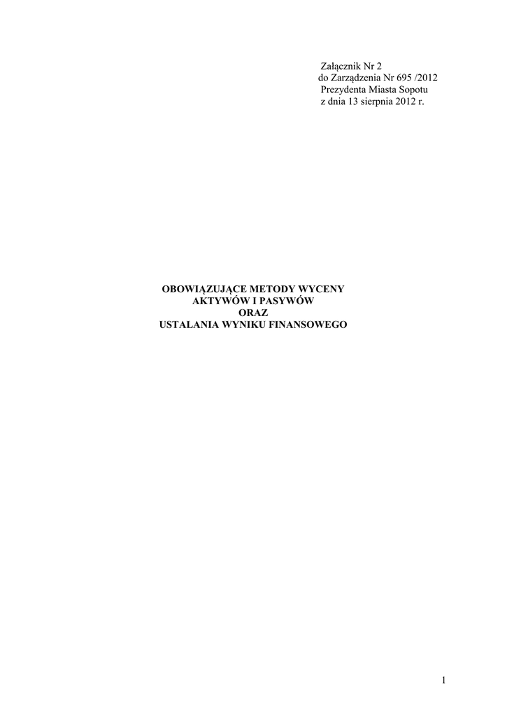 Załącznik Nr 2 do Zarządzenia Nr 695 /2012 Prezydenta Miasta Sopotu z dnia 13 sierpnia 2012 r. OBOWIĄZUJĄCE METODY WYCENY AKTYWÓW I PASYWÓW ORAZ USTALANIA WYNIKU FINANSOWEGO 1 Stosowane przez jednostkę zasady wyceny aktywów i pasywów wynikają z następujących przepisów prawa: 1) ustawy z dnia 29 września 1994 r. o rachunkowości (tj. Dz. U. z 2009 r. Nr 152, poz. 1223 z późn. zm.), 2) ustawy z dnia 27 sierpnia 2009 r. o finansach publicznych (Dz. U. z 2009 r. Nr 1240 z późn. zm.), 3) ustawy z dnia 29 sierpnia 1997 r. Ordynacja podatkowa (tj. Dz. U. zs 2005 r. Nr 8, poz. 60 z późn. zm.), 4) rozporządzenia Ministra Finansów z dnia 5 lipca 2010 r. w sprawie szczególnych zasad rachunkowości oraz planów kont dla budżetu państwa, budżetów jednostek samorządu terytorialnego, jednostek budżetowych, samorządowych zakładów budżetowych, państwowych funduszy celowych oraz państwowych jednostek budżetowych mających siedzibę poza granicami Rzeczypospolitej Polskiej (Dz. U. Nr 128 poz. 861 z późn.zm.), 1. Obowiązujące zasady wyceny aktywów i pasywów Przy wycenie aktywów i pasywów obowiązują zasady określone w ustawie o rachunkowości oraz w przepisach szczególnych dotyczących zasad rachunkowości oraz planów kont dla budżetu państwa, budżetów jednostek samorządu terytorialnego, jednostek budżetowych, samorządowych zakładów budżetowych, państwowych funduszy celowych oraz państwowych jednostek budżetowych mających siedzibę poza granicami Rzeczypospolitej Polskiej. Przy sprzedaży, nieodpłatnym przekazaniu innej jednostce, darowiźnie i likwidacji zużytych składników majątku ruchomego powierzonego jednostkom budżetowym stosuje się takie same zasady jak te, które wynikają z rozporządzenia Rady Ministrów z dnia 21maja 2010 r. w sprawie sposobu i trybu gospodarowania składnikami rzeczowymi majątku ruchomego, w który wyposażone są jednostki budżetowe (Dz. U. z 2010 r. Nr 114, poz. 761). Różnice kursowe – wpływy środków na konto walutowe przy księgowaniu operacji wpływu na to konto wycenia się po średnim kursie NBP zgodnie z art. 30 ust. 2 pkt 2 ustawy o rachunkowości. Wartości niematerialne i prawne nabyte z własnych środków ewidencjonuje się w cenie nabycia natomiast otrzymane nieodpłatnie na podstawie decyzji właściwego organu w wysokości określonej w tej decyzji, zaś otrzymane w drodze darowizny w wartości rynkowej na dzień nabycia. Wartość rynkowa określana jest na podstawie przeciętnych cen stosowanych w obrocie rzeczami tego samego rodzaju i gatunku, z uwzględnieniem ich stanu i stopnia zużycia. Wartości niematerialne i prawne, których wartość początkowa przekracza kwotę ustaloną w ustawie o podatku dochodowym od osób prawnych, z wyjątkiem związanych z pomocami dydaktycznymi, finansuje się ze środków na inwestycje i umarza stopniowo zgodnie z zasadami określonymi w wyżej wymienionej ustawie według stawek określonych w załączniku do tej ustawy. Wartości niematerialne i prawne o wartości początkowej równej lub niższej od wartości określonej w ustawie o podatku dochodowym od osób prawnych oraz stanowiące pomoce dydaktyczne albo ich nieodłączne części, stanowiące pozostałe wartości niematerialne i prawne, które zakupione zostały ze środków na wydatki bieżące umarza się jednorazowo spisując całą wartość w koszty w miesiącu przyjęcia ich do używania. 2 Modyfikacja (aktualizacja) programu, zależnie od jego ceny, stanowi albo samodzielny tytuł wartości niematerialnych i prawnych o wartości powyżej 3.500,- zł, albo jeśli jest poniżej tej wartości – zaliczana jest bezpośrednio w koszty. Ewidencja szczegółowa dla objętych ewidencją księgową wartości niematerialnych i prawnych powinna umożliwić ustalenie umorzenia oddzielnie dla poszczególnych podstawowych i oddzielnie dla pozostałych wartości niematerialnych i prawnych. Rzeczowe aktywa trwałe obejmują: 1) środki trwałe, 2) pozostałe środki trwałe, 3) środki trwałe w budowie (inwestycje), 4) dobra kultury Środki trwałe to składniki aktywów o przewidywanym okresie ekonomicznej użyteczności dłuższym niż rok, kompletne, zdatne do użytku i przeznaczone na potrzeby jednostki oraz środki trwałe stanowiące własność 1) Skarbu Państwa 2) Gminy Miasta Sopotu, w stosunku do których jednostka sprawuje uprawnienia właścicielskie, niezależnie od sposobu ich wykorzystania. Środki trwałe obejmują w szczególności: - grunty w tym prawo użytkowania wieczystego gruntu, - budowle, - budynki, - lokale będące odrębną własnością, - maszyny i urządzenia, - środki transportu i inne rzeczy, - ulepszenia w obcych środkach trwałych, - inwentarz żywy. Do środków trwałych jednostki należy zaliczyć także obce środki trwałe znajdujące się w jej użytkowaniu na podstawie art. 3 ust.4 ustawy o rachunkowości, jeśli występuje ona jako „korzystający”. Środki trwałe w dniu przyjęcia do użytkowania wycenia się: 1) w przypadku zakupu – według ceny nabycia, na którą składa się cena zakupu powiększona o koszty zakupu w tym koszty transportu, załadunku i przeładunku, ubezpieczenia, sortowania, opłat notarialnych oraz koszty związane z przystosowaniem składnika majątku do używania. Cenę zakupu stanowi cena należna dostawcy za dany składnik aktywów bez naliczonego podatku VAT, jeżeli podlega on zwrotowi lub odliczeniu od VAT należnego. Do kosztów zakupu nie zalicza się kosztów pośrednich związanych z zakupem. Cenę należy pomniejszyć o rabaty i opusty udzielone przez dostawcę. 2) W przypadku darowizny – według wartości rynkowej z dnia nabycia, z uwzględnieniem stopnia dotychczasowego zużycia lub w wartości niższej określonej w umowie darowizny albo umowie o nieodpłatnym przekazaniu. 3) W przypadku ujawnienia w drodze inwentaryzacji – według wartości wynikającej z posiadanych dokumentów, a w przypadku ich brak