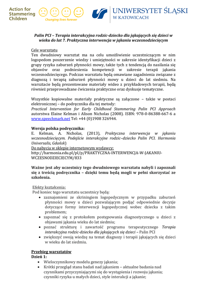 Palin PCI – Terapia interakcyjna rodzic-dziecko dla jąkających się dzieci w wieku do lat 7. Praktyczna interwencja w jąkaniu wczesnodziecięcym Cele warsztatu Ten dwudniowy warsztat ma na celu umożliwienie uczestniczącym w nim logopedom poszerzenie wiedzy i umiejętności w zakresie identyfikacji dzieci z grupy ryzyka zaburzeń płynności mowy, także tych z tendencją do nasilania się objawów oraz podniesienia kompetencji w zakresie terapii jąkania wczesnodziecięcego. Podczas warsztatu będą omawiane zagadnienia związane z diagnozą i terapią zaburzeń płynności mowy u dzieci do lat siedmiu. Na warsztacie będą prezentowane materiały wideo z przykładowych terapii, będą również przeprowadzane ćwiczenia praktyczne oraz dyskusje tematyczne. Wszystkie kopiowalne materiały praktyczne są załączone – także w postaci elektronicznej – do podręcznika dla tej metody: Practical Intervention for Early Childhood Stammering Palin PCI Approach autorstwa Elaine Kelman i Alison Nicholas (2008). ISBN: 978-0-86388-667-6 a www.speechmark.net Tel: +44 (0)1908 326944. Wersja polska podręcznika: E. Kelman, A. Nicholas, (2013), Praktyczna interwencja w jąkaniu wczesnodziecięcym. Podejście interakcyjne rodzic–dziecko Palin PCI. Harmonia Universalis, Gdańsk) Do nabycia w sklepie internetowym wydawcy: http://harmonia.edu.pl/pl/p/PRAKTYCZNA-INTERWENCJA-W-JAKANIUWCZESNODZIECIECYM/833 Ważne jest aby uczestnicy tego dwudniowego warsztatu nabyli i zapoznali się z treścią podręcznika – dzięki temu będą mogli w pełni skorzystać ze szkolenia. Efekty kształcenia: Pod koniec tego warsztatu uczestnicy będą: zaznajomieni ze skriningiem logopedycznym w przypadku zaburzeń płynności mowy u dzieci pozwalającym podjąć odpowiednie decyzje dotyczące formy interwencji logopedycznej wobec dziecka z takim problemem; zapoznać się z protokołem postępowania diagnostycznego u dzieci z objawami jąkania wieku do lat siedmiu; poznać strukturę i zawartość programu terapeutycznego Terapia interakcyjna rodzic-dziecko dla jąkających się dzieci – Palin PCI zwiększyć swoją wiedzę na temat diagnozy i terapii jąkających się dzieci w wieku do lat siedmiu. Przebieg warsztatów Dzień 1: Wieloczynnikowy modelu genezy jąkania; Krótki przegląd stanu badań nad jąkaniem – aktualne badania nad czynnikami przyczyniającymi się do wystąpienia i rozwoju jąkania; czynniki ryzyka u małych dzieci, style interakcji a jąkanie; Zastosowanie skriningu logopedycznego (przesiewu) w rozpoznaniu podatności dziecka na ustępowanie objawów, modele interwencji; Badanie dziecka – wraz z pomiarem objawów niepłynności w mowie; Wywiad z rodzicami oraz podsumowanie wyników badania, programowanie terapii, ze wskazaniem co może przyczyniać się do jąkania dziecka i jakie są indywidualne potrzeby dziecka; Zasady programu Palin PCI; Palin PCI – strategie interakcyjne: wykorzystanie nagrań wideo w terapii interakcyjnej rodzic-dziecko Dzień 2: Palin PCI – strategie rodzinne: budowanie u dziecka wiary w siebie; mówienie po kolei; wspieranie dziecka w radzeniu sobie z uczuciami; Doskonalenie umiejętności współpracy z rodzicami z wykorzystaniem zasobów rodziny; Krótkie podsumowanie wyników badań dotyczących skuteczności zastosowania programu Palin PCI; Palin PCI – strategie ukierunkowane na bezpośrednią pracę z dzieckiem nad poprawą płynności mówienia oraz dotyczące współistniejących innych problemów logopedycznych; Modele interwencji – wdrażanie terapii jąkania dla dzieci poniżej siedmiu w warunkach, które są typowe dla uczestników warsztatów. Trener: Dr Katarzyna Węsierska jest adiunktem na Uniwersytecie Śląskim , założyła i prowadzi Centrum Logopedyczne w Katowicach, gdzie pracuje także jako logopeda. Jej zainteresowania naukowe oraz praktyka kliniczna koncentrują się na zaburzeniach płynności mowy. Jest koordynatorką terapeutycznej grupy samopomocowej dla osób jąkających się działającej na Uniwersytecie Śląskim. Jest pierwszą polską absolwentką Europejskiej Klinicznej Specjalizacji Zaburzeń Płynności Mowy – ECSF (European Clinical Specialization in Fluency Disorders). Uczestniczyła w licznych stażach i szkoleniach z tego zakresu, w kraju i za granicą, w tym w wielu organizowanych przez the Michael Palin Centre for Stammering, w Londynie (Wielka Brytania). Obecnie uczestniczy w programie szkoleniowym dla trenerów metody Palin PCI w the Michael Palin Centre (www.stammeringcentre.org).