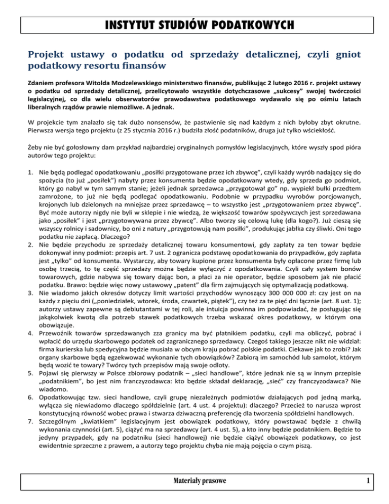 instytut studiów podatkowych Projekt ustawy o podatku od sprzedaży detalicznej, czyli gniot podatkowy resortu finansów Zdaniem profesora Witolda Modzelewskiego ministerstwo finansów, publikując 2 lutego 2016 r. projekt ustawy o podatku od sprzedaży detalicznej, przelicytowało wszystkie dotychczasowe „sukcesy” swojej twórczości legislacyjnej, co dla wielu obserwatorów prawodawstwa podatkowego wydawało się po ośmiu latach liberalnych rządów prawie niemożliwe. A jednak. W projekcie tym znalazło się tak dużo nonsensów, że pastwienie się nad każdym z nich byłoby zbyt okrutne. Pierwsza wersja tego projektu (z 25 stycznia 2016 r.) budziła złość podatników, druga już tylko wściekłość. Żeby nie być gołosłowny dam przykład najbardziej oryginalnych pomysłów legislacyjnych, które wyszły spod pióra autorów tego projektu: 1. Nie będą podlegać opodatkowaniu „posiłki przygotowane przez ich zbywcę”, czyli każdy wyrób nadający się do spożycia (to już „posiłek”) nabyty przez konsumenta będzie opodatkowany wtedy, gdy sprzeda go podmiot, który go nabył w tym samym stanie; jeżeli jednak sprzedawca „przygotował go” np. wypiekł bułki przedtem zamrożone, to już nie będą podlegać opodatkowaniu. Podobnie w przypadku wyrobów porcjowanych, krojonych lub dzielonych na mniejsze przez sprzedawcę – to wszystko jest „przygotowaniem przez zbywcę”. Być może autorzy nigdy nie byli w sklepie i nie wiedzą, że większość towarów spożywczych jest sprzedawana jako „posiłek” i jest „przygotowywana przez zbywcę”. Albo tworzy się celową lukę (dla kogo?). Już cieszą się wszyscy rolnicy i sadownicy, bo oni z natury „przygotowują nam posiłki”, produkując jabłka czy śliwki. Oni tego podatku nie zapłacą. Dlaczego? 2. Nie będzie przychodu ze sprzedaży detalicznej towaru konsumentowi, gdy zapłaty za ten towar będzie dokonywał inny podmiot: przepis art. 7 ust. 2 ogranicza podstawę opodatkowania do przypadków, gdy zapłata jest „tylko” od konsumenta. Wystarczy, aby towary kupione przez konsumenta były opłacone przez firmę lub osobę trzecią, to tę część sprzedaży można będzie wyłączyć z opodatkowania. Czyli cały system bonów towarowych, gdzie nabywa się towary dając bon, a płaci za nie operator, będzie sposobem jak nie płacić podatku. Brawo: będzie więc nowy ustawowy „patent” dla firm zajmujących się optymalizacją podatkową. 3. Nie wiadomo jakich okresów dotyczy limit wartości przychodów wynoszący 300 000 000 zł: czy jest on na każdy z pięciu dni („poniedziałek, wtorek, środa, czwartek, piątek”), czy też za te pięć dni łącznie (art. 8 ust. 1); autorzy ustawy zapewne są debiutantami w tej roli, ale intuicja powinna im podpowiadać, że posługując się jakąkolwiek kwotą dla potrzeb stawek podatkowych trzeba wskazać okres podatkowy, w którym ona obowiązuje. 4. Przewoźnik towarów sprzedawanych zza granicy ma być płatnikiem podatku, czyli ma obliczyć, pobrać i wpłacić do urzędu skarbowego podatek od zagranicznego sprzedawcy. Czegoś takiego jeszcze nikt nie widział: firma kurierska lub spedycyjna będzie musiała w obcym kraju pobrać polskie podatki. Ciekawe jak to zrobi? Jak organy skarbowe będą egzekwować wykonanie tych obowiązków? Zabiorą im samochód lub samolot, którym będą wozić te towary? Twórcy tych przepisów mają swoje odloty. 5. Pojawi się pierwszy w Polsce zbiorowy podatnik – „sieci handlowe”, które jednak nie są w innym przepisie „podatnikiem”, bo jest nim franczyzodawca: kto będzie składał deklarację, „sieć” czy franczyzodawca? Nie wiadomo. 6. Opodatkowując tzw. sieci handlowe, czyli grupę niezależnych podmiotów działających pod jedną marką, wyłącza się niewiadomo dlaczego spółdzielnie (art. 4 ust. 4 projektu): dlaczego? Przecież to narusza wprost konstytucyjną równość wobec prawa i stwarza dziwaczną preferencję dla tworzenia spółdzielni handlowych. 7. Szczególnym „kwiatkiem” legislacyjnym jest obowiązek podatkowy, który powstawać będzie z chwilą wykonania czynności (art. 5), ciążyć ma na sprzedawcy (art. 4 ust. 5), a kto inny będzie podatnikiem. Będzie to jedyny przypadek, gdy na podatniku (sieci handlowej) nie będzie ciążyć obowiązek podatkowy, co jest ewidentnie sprzeczne z prawem, a autorzy tego projektu chyba nie mają pojęcia o czym piszą. Materia³y prasowe instytut studiów podatkowych Nie chcę już pastwić się nad koncepcją wyższych stawek podatkowych z tytułu sprzedaży w soboty, niedziele i inne dni wolne od pracy: jest to przepis niekonstytucyjny, wręcz głupi, będący chyba prowokacją, ale powiedziano na ten temat dostatecznie dużo słów krytycznych więc szkoda czasu. Nie chcę już pastwić się nad koncepcją wyższych stawek podatkowych z tytułu sprzedaży w soboty, niedziele i inne dni wolne od pracy: jest to przepis niekonstytucyjny, wręcz głupi, będący chyba prowokacją, ale powiedziano na ten temat dostatecznie dużo słów krytycznych więc szkoda czasu. Najbardziej zastanawiająca jest lektura uzasadnienia tego projektu. Pojawiają się tam obszerne cytaty z raportu tzw. międzynarodowej firmy doradczej, którego opracowanie zleciła organizacja zrzeszająca zagraniczne sklepy wielkopowierzchniowe. Na tę firmę (podając jej nazwę!) często powołuje się urzędujący obecnie minister finansów. Co tu się dzieje? Czy dla twórców tego projektu, który przecież powstał już po zmianie rządu, najważniejsze są poglądy tych, którzy byli głównymi przeciwnikami opodatkowania sklepów wielkopowierzchniowych oraz tych, którzy reprezentują ich interesy? Czy jest to kolejny dowód na to, że Prawo i Sprawiedliwość wciąż jeszcze nie wygrało wyborów na ul. Świętokrzyskiej? Na koniec chcę przekazać publicznie pewną informację w związku z pytaniami ze strony przedsiębiorców i dziennikarzy: nie 