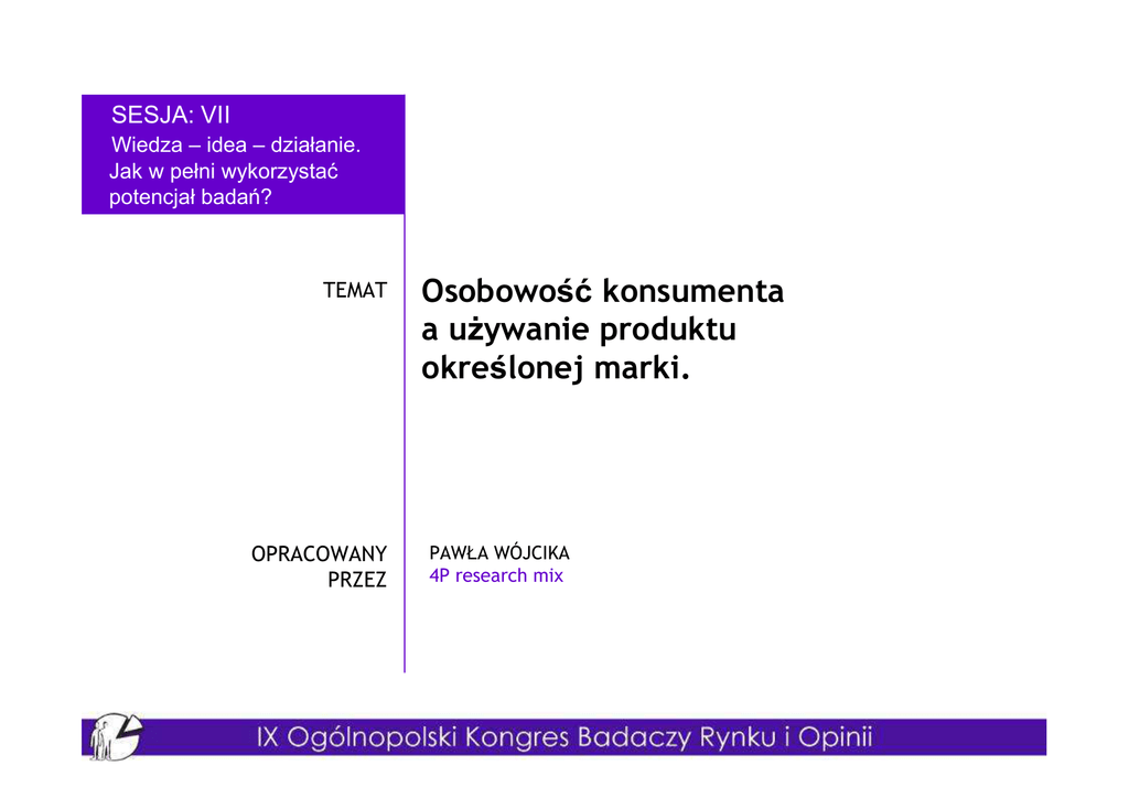 SESJA: VII Wiedza – idea – działanie. Jak w pełni wykorzystać potencjał badań? TEMAT OPRACOWANY PRZEZ Osobowość konsumenta a uŜywanie produktu określonej marki. PAWŁA WÓJCIKA 4P research mix Osobowość - definicja • Pojęcie „osobowość” pochodzi od łacińskiego słowa „persona”, które oznaczało maskę noszoną przez aktora. Poprzez wybór maski związanej z odgrywaną rolą chciał on wywrzeć określone wraŜenie na publiczności. • Istnieje wiele definicji tego czym jest „osobowość”. • W zaleŜności od kierunku teoretycznego postulowano zwracanie uwagi na róŜne aspekty funkcjonowania człowieka. • Wspólnym elementem tych definicji jest rozumienie osobowości jako wyjątkowego i niepowtarzalnego portretu psychologicznego danej osoby, który w znacznym stopniu wpływa na to jak reaguje ona na swoje otoczenie. 2 Osobowość według Freuda Teoria psychoanalityczna Zygmunta Freuda zakłada istnienie podstawowej struktury naszej osobowości „ego”. Szczególną role przypisywała nieświadomym, wypieranym lub społecznie nieakceptowanym motywom naszego zachowania. Ego świadome Superego nieświadome Id 3 Osobowość – „badania motywacyjne” • kawa jest kojarzona z towarzystwem • niektóre osoby mogą nie lubić suszonych śliwek, poniewaŜ przypominają one skórę starego człowieka • męŜczyźni są emocjonalnie przywiązani do swojego pierwszego samochodu, poniewaŜ utoŜsamiają go z wejściem w etap Ŝycia kojarzony ze swobodą seksualną 4 Osobowość – zespół cech Z punktu widzenia marketingu uŜyteczne są teorie, które definiują osobowość człowieka jako zespół cech W takim ujęciu mówimy o pewnych cechach, które są specyficzne dla danego typu osobowości (Teorie Cech) 5 Osobowość – współczesna psychologia „współczesna” definicja osobowości: za przejaw osobowości człowieka moŜna uznać jego określone zachowania, które spełniają poniŜsze warunki: • stałość – powtarzalność pewnych wzorów zachowań w podobnych sytuacjach. MoŜemy oczekiwać, Ŝe konsument o określonym profilu osobowości będzie reagował podobnie na określone akcje promocyjne, np. kupował przy obniŜkach ceny • zróŜnicowanie – wyodrębnienie, opisanie róŜnych profili konsumentów i połączenia je w większe segmenty. KaŜdy segment powinien reagować inaczej na zróŜnicowane działania marketingowe. Na przykład konsumenci o profilu osobowości „A” powinny częściej brać udział w promocjach „ dwa produkty w cenie jednego”, a konsumenci o profilu „B” powinni być bardziej podatni na promocję „obniŜka ceny o 50%” 6 NajwaŜniejsze Teorie Cech Eysenck (model PEN) Costa, McCrae Wielka Piątka (Big Five) Cattel teoria czynnikowa • psychotyczność • ekstrawersja • neurotyczność • ekstrawersja • neurotyczność • otwartość na doświadczenie • ugodowość • sumienność • ekstrawersja • stabilność – niepokój • otwartość – twardość myślenia • przychylność – niezaleŜność • samokontrola 7 Teorie cech: wymiary osobowości wg Eysencka Psychotyczność – osoba z duŜym nasileniem psychotyczności jest chłodna, egocentryczna, impulsywna, agresywna, bezosobowa, ale przy tym takŜe często twórcza i niekonwencjonalna. Ekstrawersja – typowy ekstrawertyk jest towarzyski, posiada wielu przyjaciół, odczuwa potrzebę prowadzenia rozmów z innymi ludźmi, nie lubi natomiast zajmować się czytaniem w samotności. Potrzebuje podniet z zewnątrz, działa bowiem pod wpływem sytuacji, w której się znajduje. Neurotyczność – inaczej niezrównowaŜenie emocjonalne. Osoba neurotyczna jest lękliwa, depresyjna, spięta, ma niską samoocenę i zwykle silne poczucie winy. 8 Profil osobowości a komunikacja marketingowa Opis typowego konsumenta z Twojej grupy docelowej: Młody męŜczyzna, impulsywny; o słabej zdolności do odroczenia gratyfikacji; ekstrawertyczny; o wysokim zapotrzebowaniu na stymulację; wysoka lecz niestabilna samoocena; silna potrzeba dominacji nad otoczeniem 9 Ale brak związków pomiędzy wymiarami/cechami osobowości a uŜywaniem marek… …czyli np. ekstrawertycy nie uŜywają częściej marek, które mają wizerunek z elementami tej cechy osobowości 10 Problemy z wykorzystaniem psychologicznych testów osobowości w badaniach marketingowych -Jak „przeciętny” respondent moŜe zareagować na takie stwierdzenia? -Ile czasu zajmie taki wywiad i czy respondent będzie miał ochotę w nim uczestniczyć? - Czy ankieter nie będzie się wstydził o to zapytać? 11 Minnesocki Wielowymiarowy Inwentarz Osobowości (MMPI) (566 stwierdzeń) Około 30 stwierdzeń dotyczących sfer intymnych, wstydliwych lub społecznie „draŜliwych„ Przykłady: (27) Czasem opanowują mnie złe duchy. (50) Moja dusza opuszcza czasem ciało. (85) Czasami tak pociągają mnie cudze części ubrania lub bielizny, Ŝe mam ochotę je zabrać lub dotykać ich, choć nie są mi potrzebne. (161) Czasem odczuwam szczególna wraŜliwość na szczycie głowy. (168) Coś jest źle z moim umysłem. (297) Chciałbym aby nie prześladowały mnie myśli o sprawach seksualnych. (519) Coś nie jest w porządku z moimi narządami płciowymi. 12 Przykładów ciąg dalszy (7) Moje ręce i nogi są zwykle ciepłe. (14) Mam biegunkę raz na miesiąc lub częściej. (18) Bardzo rzadko cierpię na zatwardzenia. (63) Nie miewam Ŝadnych trudności z oddawaniem lub wstrzymywaniem stolca. (266) Co najmniej raz w tygodniu jestem bardzo pobudzony. (519) Coś nie jest w porządku z moimi narządami płciowymi. (542) Nigdy nie miałem czarnego smolistego stolca. 13 Dlaczego trudno przewidzieć zachowania konsumentów wykorzystując standardowe podejście psychologiczne • testy osobowości w psychologii klinicznej • problem rzetelności i trafności testów klinicznych w populacjach konsumentów • twórcza adaptacja psychologicznych testów osobowości na potrzeby marketin