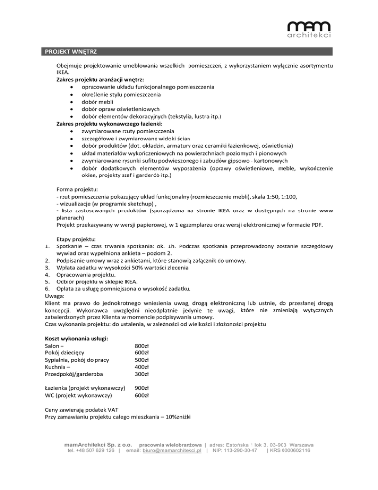 PROJEKT WNĘTRZ Obejmuje projektowanie umeblowania wszelkich pomieszczeń, z wykorzystaniem wyłącznie asortymentu IKEA. Zakres projektu aranżacji wnętrz: opracowanie układu funkcjonalnego pomieszczenia określenie stylu pomieszczenia dobór mebli dobór opraw oświetleniowych dobór elementów dekoracyjnych (tekstylia, lustra itp.) Zakres projektu wykonawczego łazienki: zwymiarowane rzuty pomieszczenia szczegółowe i zwymiarowane widoki ścian dobór produktów (dot. okładzin, armatury oraz ceramiki łazienkowej, oświetlenia) układ materiałów wykończeniowych na powierzchniach poziomych i pionowych zwymiarowane rysunki sufitu podwieszonego i zabudów gipsowo ‐ kartonowych dobór dodatkowych elementów wyposażenia (oprawy oświetleniowe, meble, wykończenie okien, projekty szaf i garderób itp.) Forma projektu: ‐ rzut pomieszczenia pokazujący układ funkcjonalny (rozmieszczenie mebli), skala 1:50, 1:100, ‐ wizualizacje (w programie sketchup) , ‐ lista zastosowanych produktów (sporządzona na stronie IKEA oraz w dostępnych na stronie www planerach) Projekt przekazywany w wersji papierowej, w 1 egzemplarzu oraz wersji elektronicznej w formacie PDF. Etapy projektu: 1. Spotkanie – czas trwania spotkania: ok. 1h. Podczas spotkania przeprowadzony zostanie szczegółowy wywiad oraz wypełniona ankieta – poziom 2. 2. Podpisanie umowy wraz z ankietami, które stanowią załącznik do umowy. 3. Wpłata zadatku w wysokości 50% wartości zlecenia 4. Opracowania projektu. 5. Odbiór projektu w sklepie IKEA. 6. Opłata za usługę pomniejszona o wysokość zadatku. Uwaga: Klient ma prawo do jednokrotnego wniesienia uwag, drogą elektroniczną lub ustnie, do przesłanej drogą koncepcji. Wykonawca uwzględni nieodpłatnie jedynie te uwagi, które nie zmieniają wytycznych zatwierdzonych przez Klienta w momencie podpisywania umowy. Czas wykonania projektu: do ustalenia, w zależności od wielkości i złożoności projektu Koszt wykonania usługi: Salon – 800zł Pokój dziecięcy 600zł Sypialnia, pokój do pracy 500zł Kuchnia – 400zł Przedpokój/garderoba 300zł Łazienka (projekt wykonawczy) 900zł WC (projekt wykonawczy) 600zł Ceny zawierają podatek VAT Przy zamawianiu projektu całego mieszkania – 10%zniżki mamArchitekci Sp. z o.o. tel. +48 507 629 126 | pracownia wielobranżowa | adres: Estońska 1 lok 3, 03-903 Warszawa email: [email protected] | NIP: 113-290-30-47 | KRS 0000602116 Usługi dodatkowe, nie ujęte w zakresie Usługi 3: Wizualizacja fotorealistyczna 3D wybranych pomieszczeń Szkic 3D Dobór konkretnych materiałów wykończeniowych w terenie (dotyczy okładzin ściennych i podłogowych, ceramiki sanitarnej, armatury) – odrębnie płatne Projekt budowlany do uzyskania pozwolenia na budowę lub wniosek do zgłoszenia robót budowlanych Projekty branżowe (konstrukcja, instalacja sanitarna, elektryczna, teletechniczna) ARANŻACJA – UKŁAD FUNKCJONALNY 25zł/m2 Projekt pozwala określić jakie jest najkorzystniejsze ustawienie mebli w pomieszczeniach. Dobór konkretnych produktów – poza zakresem. Układ funkcjonalny wnętrz w maksymalnie 2 wariantach, wykonany na podstawie dostarczonych przez Zleceniodawcę zwymiarowanych planów (najlepiej pliki autocad lub PDF lub wersja papierowa‐ w tym architektura, oraz branże: elektryka, CO, wentylacja, klimatyzacja, wod‐kan). Zawiera: proponowane ustawienie mebli, sanitariatów, głównych elementów wyposażenia wnętrz. propozycję układu materiałów wykończeniowych na powierzchniach poziomych. Rysunek nie posiada wymiarów KONSULTACJE PROJEKTOWE 80zł/h Konsultacje projektowe w sklepie IKEA Targówek Spotkanie projektowe, podczas którego zostają omówione zagadnienia wybrane przez klienta,. Przykładowe tematy spotkań: omówienie opracowanego przez klienta projektu kuchni kolorystyka i materiały wykończeniowe wnętrz pomieszczenia / mieszkania / domu układy funkcjonalne pomieszczeń Praca na szkicach odręcznych. Usługa wykonywana w dniu przyjęcia zlecenia od klienta Koszt usługi: 80zł/h KONSULT KONSULTACJE PROJEKTOWE U KLIENTA 200zł Spotkanie projektowe odbywające się u Klienta. Uwaga: Spotkanie nie obejmuje wykonania pomiarów pomieszczenia kuchennego. Koszt usługi: 200zł/2h, 80zł za każdą kolejną godzinę Dojazd do Klienta w granicach stref transportowych dla sklepu IKEA w Warszawie bezpłatny, poza strefami transportowymi płatny 0,84 zł za każdy kilometr (dojazd i powrót) USŁUGA „KUPUJĘ Z PROJEKTANTEM” 80zł/h Wsparcie projektanta w czasie doboru konkretnych produktów IKEA, na terenie sklepu Koszt usługi: 80zł/h Z poważaniem Małgorzata Borys Renata Pieńkowska Ewa Potapow Katarzyna Rokicka – Muller mamArchitekci Sp. z o.o. tel. +48 507 629 126 | pracownia wielobranżowa | adres: Estońska 1 lok 3, 03-903 Warszawa email: [email protected] | NIP: 113-290-30-47 | KRS 0000602116 mamArchitekci Sp. z o.o. tel. +48 507 629 126 | pracownia wielobranżowa | adres: Estońska 1 lok 3, 03-903 Warszawa email: [email protected] | NIP: 113-290-30-47 | KRS 0000602116