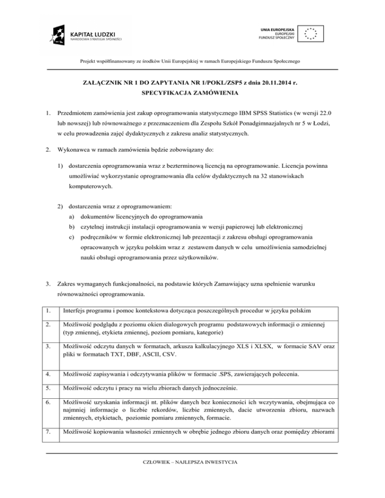 Projekt współfinansowany ze środków Unii Europejskiej w ramach Europejskiego Funduszu Społecznego ZAŁĄCZNIK NR 1 DO ZAPYTANIA NR 1/POKL/ZSP5 z dnia 20.11.2014 r. SPECYFIKACJA ZAMÓWIENIA 1. Przedmiotem zamówienia jest zakup oprogramowania statystycznego IBM SPSS Statistics (w wersji 22.0 lub nowszej) lub równoważnego z przeznaczeniem dla Zespołu Szkół Ponadgimnazjalnych nr 5 w Łodzi, w celu prowadzenia zajęć dydaktycznych z zakresu analiz statystycznych. 2. Wykonawca w ramach zamówienia będzie zobowiązany do: 1) dostarczenia oprogramowania wraz z bezterminową licencją na oprogramowanie. Licencja powinna umożliwiać wykorzystanie oprogramowania dla celów dydaktycznych na 32 stanowiskach komputerowych. 2) dostarczenia wraz z oprogramowaniem: a) dokumentów licencyjnych do oprogramowania b) czytelnej instrukcji instalacji oprogramowania w wersji papierowej lub elektronicznej c) podręczników w formie elektronicznej lub prezentacji z zakresu obsługi oprogramowania opracowanych w języku polskim wraz z zestawem danych w celu umożliwienia samodzielnej nauki obsługi oprogramowania przez użytkowników. 3. Zakres wymaganych funkcjonalności, na podstawie których Zamawiający uzna spełnienie warunku równoważności oprogramowania. 1. Interfejs programu i pomoc kontekstowa dotycząca poszczególnych procedur w języku polskim 2. Możliwość podglądu z poziomu okien dialogowych programu podstawowych informacji o zmiennej (typ zmiennej, etykieta zmiennej, poziom pomiaru, kategorie) 3. Możliwość odczytu danych w formatach, arkusza kalkulacyjnego XLS i XLSX, w formacie SAV oraz pliki w formatach TXT, DBF, ASCII, CSV. 4. Możliwość zapisywania i odczytywania plików w formacie .SPS, zawierających polecenia. 5. Możliwość odczytu i pracy na wielu zbiorach danych jednocześnie. 6. Możliwość uzyskania informacji nt. plików danych bez konieczności ich wczytywania, obejmująca co najmniej informacje o liczbie rekordów, liczbie zmiennych, dacie utworzenia zbioru, nazwach zmiennych, etykietach, poziomie pomiaru zmiennych, formacie. 7. Możliwość kopiowania własności zmiennych w obrębie jednego zbioru danych oraz pomiędzy zbiorami CZŁOWIEK – NAJLEPSZA INWESTYCJA Projekt współfinansowany ze środków Unii Europejskiej w ramach Europejskiego Funduszu Społecznego danych. 8. Możliwość przeszukiwania i zastępowania w zbiorze danych określonych wartości (i ciągów tekstowych). 9. Możliwość ochrony zbiorów danych przed niepowołanym dostępem za pomocą hasła 10. Możliwość definiowania przez użytkownika braków danych, w tym co najmniej trzech rodzajów braków odpowiadających odpowiedziom spotykanych w badaniach ankietowych: "nie wiem", "nie dotyczy" i "odmowa odpowiedzi"; 11. Podział zbioru danych na części, tak by analizy były automatycznie wykonywane dla różnych grup i jednostek analizy (np. jednostek terytorialnych). 12. Selekcja losowa i warunkowa obserwacji do analiz, permanentna lub tymczasowa - bez utraty zawartości zbioru danych (niewybrane obserwacje powinny być nieaktywne - nie brane pod uwagę podczas analiz). 13. Operacje wykonywane wg zmiennych takie jak: zliczanie wystąpień określonych wartości lub przedziałów wartości w zestawie zmiennych, sumowanie wartości po zmiennych, wyciąganie wartości maksymalnej i minimalnej z zestawu zmiennych, wyliczanie średniej, mediany, odchylenia standardowego dla grup zmiennych, funkcje typu lag. 14. Sortowanie obserwacji na podstawie jednej lub większej liczby zmiennych (sortowanie złożone). 15. Identyfikacja powtarzających się rekordów na podstawie zestawu wybranych zmiennych 16. Agregacja zbioru danych z użyciem co najmniej takich miar jak: suma, średnia, mediana, minimum, maksimum, odchylenie standardowe, liczba agregowanych obserwacji, pierwsza i ostatnia obserwacja w grupie wraz z możliwością przypisana jako nowych zmiennych do istniejącego zbioru danych miar wyliczonych podczas agregacji. 17. Rekodowanie zmiennych, w tym dychotomizacja zmiennych, umożliwiająca przekodowanie wartości dowolnej zmiennej nominalnej lub porządkowej na zestaw odpowiadających wartościom zmiennych dychotomicznych (0/1) 18. Kategoryzacja wizualna zmiennych ilościowych z możliwością automatycznego wyboru punktów podziału (w oparciu o wyznaczenie równolicznych kategorii, percentyli, punktów przedstawiających miary odchylenia standardowego) i możliwością tworzenia etykiet opisujących granice przedziałów dla utworzonych kategorii 19. Automatyczne przekształcanie zmiennych tekstowych w zmienne numeryczne, w taki sposób aby kolejnym wartościom tekstowym np. "Powiat A"," Powiat B", Powiat C" itd. przypisywane były kolejne wartości: 1,2,3 itd. Jednocześnie z wartości tekstowych automatycznie powinny być tworzone etykiety wartości 20. Kreator wyliczania nowych zmiennych przy użyciu funkcji: najmniej arytmetycznych, daty i czasu, CZŁOWIEK – NAJLEPSZA INWESTYCJA Projekt współfinansowany ze środków Unii Europejskiej w ramach Europejskiego Funduszu Społecznego tekstowych, ,atematycznych, logicznych prawdopodobieństwa 21. Operacje na datach wyciągnie z daty: dni, miesięcy, kwartałów, roku, dnia tygodnia, dnia w roku, tygodnia. Tworzenie daty z oddzielnych zmiennych reprezentujących dzień, miesiąc, rok. 22. Ważenie obserwacji wartościami wybranej zmiennej i rangowanie obserwacji na podstawie wybranych zmiennych 23. Możliwość statystycznej analizy danych z wykorzystaniem co najmniej następujących technik statystycznych: statystyki częstości, statystyki opisowe, tabele kontyngencji z możliwością prezentacji miar współzależności zmiennych (liczebności obserwowane i liczebności oczekiwane, test Chi kwadrat, proporcje kolumnowe), statystyki ilorazowe, porównywanie średnich, korelacja, t-studenta, jednoczynnikowa analiza wariancji, analiza czynnikowa i analiza składowych głównych, hierarchiczna analiza skupień i analiza skupień metod