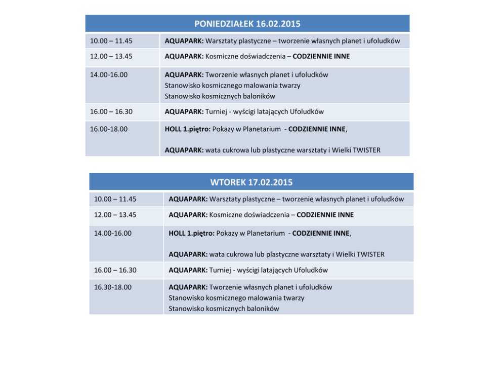 PONIEDZIAŁEK 16.02.2015 10.00 – 11.45 AQUAPARK: Warsztaty plastyczne – tworzenie własnych planet i ufoludków 12.00 – 13.45 AQUAPARK: Kosmiczne doświadczenia – CODZIENNIE INNE 14.00-16.00 AQUAPARK: Tworzenie własnych planet i ufoludków Stanowisko kosmicznego malowania twarzy Stanowisko kosmicznych baloników 16.00 – 16.30 AQUAPARK: Turniej - wyścigi latających Ufoludków 16.00-18.00 HOLL 1.piętro: Pokazy w Planetarium - CODZIENNIE INNE, AQUAPARK: wata cukrowa lub plastyczne warsztaty i Wielki TWISTER WTOREK 17.02.2015 10.00 – 11.45 AQUAPARK: Warsztaty plastyczne – tworzenie własnych planet i ufoludków 12.00 – 13.45 AQUAPARK: Kosmiczne doświadczenia – CODZIENNIE INNE 14.00-16.00 HOLL 1.piętro: Pokazy w Planetarium - CODZIENNIE INNE, AQUAPARK: wata cukrowa lub plastyczne warsztaty i Wielki TWISTER 16.00 – 16.30 AQUAPARK: Turniej - wyścigi latających Ufoludków 16.30-18.00 AQUAPARK: Tworzenie własnych planet i ufoludków Stanowisko kosmicznego malowania twarzy Stanowisko kosmicznych baloników ŚRODA 18.02.2015 10.00 – 11.45 AQUAPARK: Warsztaty plastyczne – tworzenie własnych planet i ufoludków 12.00 – 13.45 AQUAPARK: Kosmiczne doświadczenia – CODZIENNIE INNE 14.00-16.00 AQUAPARK: Tworzenie własnych planet i ufoludków Stanowisko kosmicznego malowania twarzy Stanowisko kosmicznych baloników 16.00 – 16.30 AQUAPARK: Turniej - wyścigi latających Ufoludków 16.00-18.00 HOLL 1.piętro: Pokazy w Planetarium - CODZIENNIE INNE, AQUAPARK: wata cukrowa lub plastyczne warsztaty i Wielki TWISTER CZWARTEK 19.02.2015 10.00 – 11.45 AQUAPARK: Warsztaty plastyczne – tworzenie własnych planet i ufoludków 12.00 – 13.45 AQUAPARK: Kosmiczne doświadczenia – CODZIENNIE INNE 14.00-16.00 AQUAPARK: ZABAWY KOSMICZNE Z DZIEĆMI Z MUZYKĄ 16.00 – 16.30 AQUAPARK: Turniej - wyścigi latających Ufoludków 16.30-18.00 AQUAPARK: Tworzenie własnych planet i ufoludków Stanowisko kosmicznego malowania twarzy Stanowisko kosmicznych baloników PIĄTEK 20.02.2015 10.00 – 11.45 AQUAPARK: Warsztaty plastyczne – tworzenie własnych planet i ufoludków 12.00 – 13.45 AQUAPARK: Kosmiczne doświadczenia – CODZIENNIE INNE 14.00-16.00 HOLL 1.piętro: Pokazy w Planetarium - CODZIENNIE INNE, AQUAPARK: wata cukrowa lub plastyczne warsztaty i Wielki TWISTER 16.00 – 16.30 AQUAPARK: Turniej - wyścigi latających Ufoludków 16.30-18.00 AQUAPARK: Tworzenie własnych planet i ufoludków Stanowisko kosmicznego malowania twarzy Stanowisko kosmicznych baloników SOBOTA 21.02.2015 10.00 – 11.45 AQUAPARK: Warsztaty plastyczne – tworzenie własnych planet i ufoludków 12.00 – 13.45 AQUAPARK: Kosmiczne doświadczenia – CODZIENNIE INNE 14.00-16.00 AQUAPARK: Tworzenie własnych planet i ufoludków Stanowisko kosmicznego malowania twarzy Stanowisko kosmicznych baloników 16.00-16.10 AQUAPARK: Rozbijanie piniaty w kształcie planety 16.10 – 16.30 AQUAPARK: Turniej - wyścigi latających Ufoludków 16.00-18.00 HOLL 1.piętro: Pokazy w Planetarium - CODZIENNIE INNE, AQUAPARK: plastyczne warsztaty i Wielki TWISTER WATA CUKROWA 10.00-18.00 NIEDZIELA 22.02.2015 10.00 – 11.45 AQUAPARK: Warsztaty plastyczne – tworzenie własnych planet i ufoludków 12.00 – 13.45 AQUAPARK: Kosmiczne doświadczenia – CODZIENNIE INNE 14.00-16.00 HOLL 1.piętro: Pokazy w Planetarium - CODZIENNIE INNE, AQUAPARK: plastyczne warsztaty i Wielki TWISTER 16.00-16.10 AQUAPARK: Rozbijanie piniaty w kształcie planety 16.10 – 16.30 AQUAPARK: Turniej - wyścigi latających Ufoludków 16.30-18.00 AQUAPARK: Tworzenie własnych planet i ufoludków Stanowisko kosmicznego malowania twarzy Stanowisko kosmicznych baloników WATA CUKROWA 10.00-18.00 PONIEDZIAŁEK 23.02.2015 10.00 – 11.45 AQUAPARK: Warsztaty plastyczne – tworzenie własnych planet i ufoludków 12.00 – 13.45 AQUAPARK: Kosmiczne doświadczenia – CODZIENNIE INNE 14.00-16.00 HOLL 1.piętro: Pokazy w Planetarium - CODZIENNIE INNE, AQUAPARK: wata cukrowa lub plastyczne warsztaty i Wielki TWISTER 16.00 – 16.30 AQUAPARK: Turniej - wyścigi latających Ufoludków 16.30-18.00 AQUAPARK: Tworzenie własnych planet i ufoludków Stanowisko kosmicznego malowania twarzy Stanowisko kosmicznych baloników WTOREK 24.02.2015 10.00 – 11.45 AQUAPARK: Warsztaty plastyczne – tworzenie własnych planet i ufoludków 12.00 – 13.45 AQUAPARK: Kosmiczne doświadczenia – CODZIENNIE INNE 14.00-16.00 AQUAPARK: Tworzenie własnych planet i ufoludków Stanowisko kosmicznego malowania twarzy Stanowisko kosmicznych baloników 16.00 – 16.30 AQUAPARK: Turniej - wyścigi latających Ufoludków 16.00-18.00 HOLL 1.piętro: Pokazy w Planetarium - CODZIENNIE INNE, AQUAPARK: wata cukrowa lub plastyczne warsztaty i Wielki TWISTER ŚRODA 25.02.2015 10.00 – 11.45 AQUAPARK: Warsztaty plastyczne – tworzenie własnych planet i ufoludków 12.00 – 13.45 AQUAPARK: Kosmiczne doświadczenia – CODZIENNIE INNE 14.00-16.00 HOLL 1.piętro: Pokazy w Planetarium - CODZIENNIE INNE, AQUAPARK: wata cukrowa lub plastyczne warsztaty i Wielki TWISTER 16.00 – 16.30 AQUAPARK: Turniej - wyścigi latających Ufoludków 16.30-18.00 AQUAPARK: Tworzenie własnych planet i ufoludków Stanowisko kosmicznego malowania twarzy Stanowisko kosmicznych baloników CZWARTEK 26.02.2015 10.00 – 11.45 AQUAPARK: Warsztaty plastyczne – tworzenie własnych planet i ufoludków 12.00 – 13.45 AQUAPARK: Kosmiczne doświadczenia – CODZIENNIE INNE 14.00-16.00 AQUAPARK: ZABAWY KOSMICZNE Z DZIEĆMI Z MUZYKĄ 16.00 – 16.30 AQUAPARK: Turniej - wyścigi latających Ufoludków 16.30-18.00 AQUAPARK: Tworzenie własnych planet i ufoludków Stanowisko kosmicznego malowania twarzy Stanowisko kosmicznych baloników PIĄTEK 27.02.2015 10.00 – 11.45 AQUAPARK: Warsztaty plastyczne – tworzenie własnych planet i ufoludków 12.00 – 13.45 AQUAPARK: Kosmiczne doświadczenia – CODZIENNIE INNE 14.00-16.00 AQUAPARK: Tworzenie własnych planet i ufoludków Stanowisko kosmicznego malowania twarzy Stanowisko kos