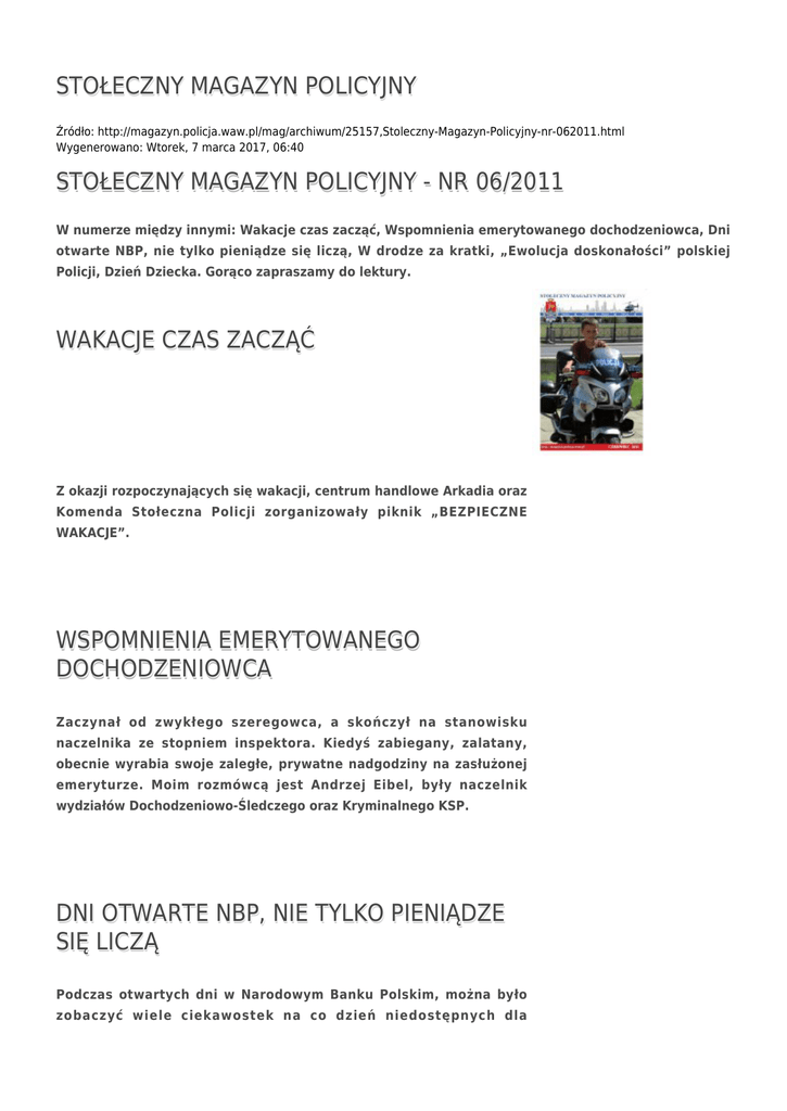 STOŁECZNY MAGAZYN POLICYJNY Źródło: http://magazyn.policja.waw.pl/mag/archiwum/25157,Stoleczny-Magazyn-Policyjny-nr-062011.html Wygenerowano: Wtorek, 7 marca 2017, 06:40 STOŁECZNY MAGAZYN POLICYJNY - NR 06/2011 W numerze między innymi: Wakacje czas zacząć, Wspomnienia emerytowanego dochodzeniowca, Dni otwarte NBP, nie tylko pieniądze się liczą, W drodze za kratki, „Ewolucja doskonałości” polskiej Policji, Dzień Dziecka. Gorąco zapraszamy do lektury. WAKACJE CZAS ZACZĄĆ Z okazji rozpoczynających się wakacji, centrum handlowe Arkadia oraz Komenda Stołeczna Policji zorganizowały piknik „BEZPIECZNE WAKACJE”. WSPOMNIENIA EMERYTOWANEGO DOCHODZENIOWCA Zaczynał od zwykłego szeregowca, a skończył na stanowisku naczelnika ze stopniem inspektora. Kiedyś zabiegany, zalatany, obecnie wyrabia swoje zaległe, prywatne nadgodziny na zasłużonej emeryturze. Moim rozmówcą jest Andrzej Eibel, były naczelnik wydziałów Dochodzeniowo-Śledczego oraz Kryminalnego KSP. DNI OTWARTE NBP, NIE TYLKO PIENIĄDZE SIĘ LICZĄ Podczas otwartych dni w Narodowym Banku Polskim, można było zobaczyć wiele ciekawostek na co dzień niedostępnych dla mieszkańców Warszawy. W DRODZE ZA KRATKI Każdego dnia stołeczni funkcjonariusze Wydziału Konwojowego KSP dokonują około 200 konwojów i doprowadzeń. Coraz większa liczba procesów sądowych przyciągających uwagę mediów wymaga od policjantów dodatkowych zabezpieczeń. „EWOLUCJA DOSKONAŁOŚCI” POLSKIEJ POLICJI Zastępca Komendanta Stołecznego Policji insp. Robert Kukiełka, delegowany przez Komendanta Głównego Policji, po raz pierwszy w historii reprezentował polską Policję na prestiżowej dorocznej VII Konferencji Kanadyjskiej Królewskiej Policji Konnej w miejscowości Kelowna w prowincji Kolumbia Brytyjska. Polska prezentacja zatytułowana „Lekcja dowodzenia” wzbudziła ogromne zainteresowanie, z doświadczeń stołecznej Policji chcą czerpać nie tylko kanadyjscy stróże prawa. DZIEŃ DZIECKA Ale się działo! Tegoroczny Dzień Dziecka można zaliczyć do jak najbardziej udanych. Nie zabrakło atrakcji, o co zresztą postarał się Wojewódzki Urząd Mazowiecki wraz z Komendą Stołeczną Policji. ZAŁĄCZNIKI DO STRONY Stołeczny Magazyn Policyjny - nr 06/2011 2.28 MB Ocena: 0/5 (0) Tweetnij