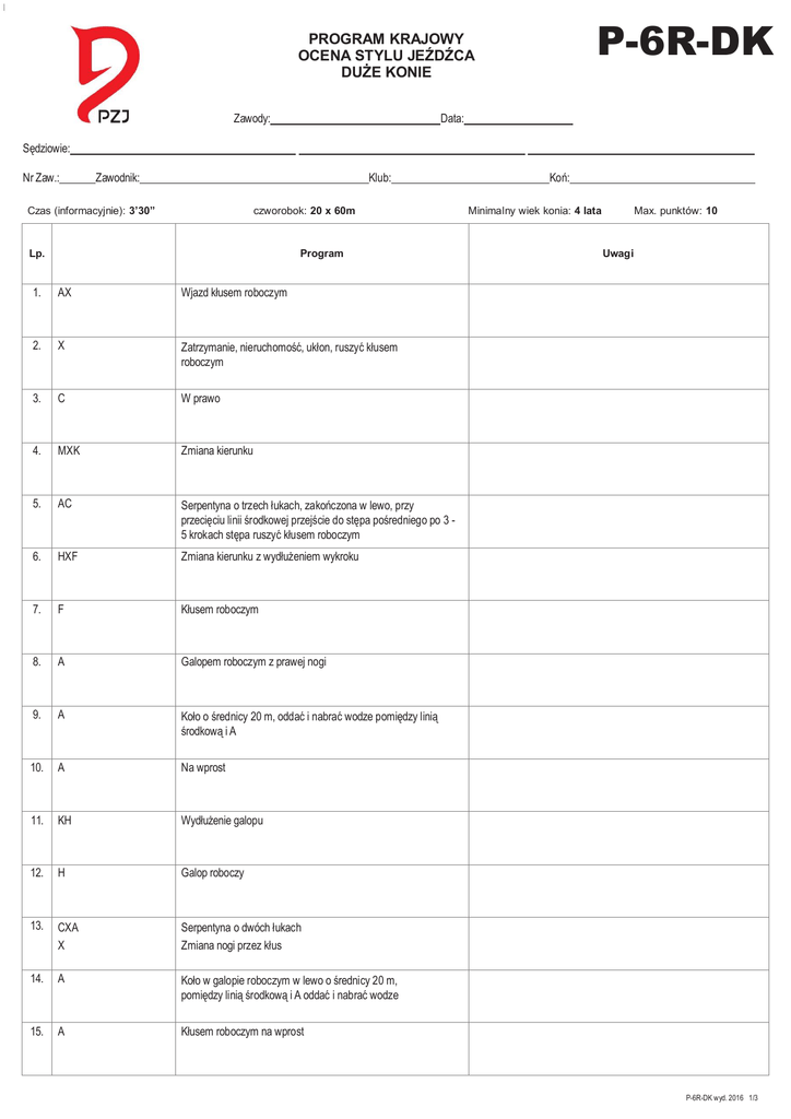 P-6R-DK PROGRAM KRAJOWY OCENA STYLU JEŹDŹCA DUŻE KONIE Zawody: Data: Sędziowie: Nr Zaw.: Zawodnik: Klub: Czas (informacyjnie): 3’30” czworobok: 20 x 60m Lp. Program 1. AX Wjazd kłusem roboczym 2. X Zatrzymanie, nieruchomość, ukłon, ruszyć kłusem roboczym 3. C W prawo 4. MXK Zmiana kierunku 5. AC Serpentyna o trzech łukach, zakończona w lewo, przy przecięciu linii środkowej przejście do stępa pośredniego po 3 5 krokach stępa ruszyć kłusem roboczym 6. HXF Zmiana kierunku z wydłużeniem wykroku 7. F Kłusem roboczym 8. A Galopem roboczym z prawej nogi 9. A Koło o średnicy 20 m, oddać i nabrać wodze pomiędzy linią środkową i A 10. A Na wprost 11. KH Wydłużenie galopu 12. H Galop roboczy 13. CXA X Serpentyna o dwóch łukach Zmiana nogi przez kłus 14. A Koło w galopie roboczym w lewo o średnicy 20 m, pomiędzy linią środkową i A oddać i nabrać wodze 15. A Kłusem roboczym na wprost Koń: Max. punktów: 10 Minimalny wiek konia: 4 lata Uwagi P-6R-DK wyd. 2016 1/3 16. B W lewo 17. X Zatrzymanie 5 sek., ruszyć kłusem roboczym 18. E W lewo 19. A Stępem pośrednim 20. F do linii ćwiartkowej ustępowanie od łydki w lewo 21. od linni ćwiartkowej do M C ustępowanie od łydki w prawo Kłusem roboczym 22. EBE Koło o średnicy 20 m w lewo, w B kłus anglezowany i żucie z ręki 23. Przed E Nabranie wodzy 24. E Kłusem ćwiczebnym 25. A Na linię środkową 26. X Zatrzymanie, nieruchomość, ukłon Opuścić czworobok stępem pośrednim na długiej wodzy w A Pomyłki: 1-sza 2-ga 3-cia 0,2 pkt. 0,4 pkt. eliminacja UWAGA: * w kłusie, o ile nie wskazano w danym ruchu, dosiad ćwiczebny P-6R-DK wyd. 2016 2/3 KRYTERIA ZASADNICZE UWAGI równowaga, rozluźnienie, elastyczność – ze szczególnym zwróceniem uwagi na elastyczność stawów biodrowych, pozycję głowy, ramion, rąk (dłoni), nóg 1. DOSIAD - 2. POMOCE - wyczucie i skuteczność oddziaływania (połączenie i skuteczność pomocy – ciężaru, nóg (łydek) i wodzy 3. WPŁYW JEŹDŹCA - na sposób poruszania się konia i na sposób wykonania programu jako całości i poszczególnych lekcji 4. PODSUMOWANIE KRYTERIA RYTM – jak jeździec wyczuwa rytm; czy występują zakłócenia w rytmie spowodowane przez jeźdźca ROZLUŹNIENIE – czy jeździec podąża za rytmem; czy koń wykazuje zaufanie do jeźdźca i jest rozluźniony KONTAKT – czy jeździec wykazuje znajomość poprawnego sposobu trzymania wodzy; czy koń wykazuje zaufanie do rąk jeźdźca z aktywnym pyskiem IMPULS – czy jeździec wyczuwa różne chody; czy jeździec pokazuje jazdę bez obawy do przodu, czy wykazuje obawy WYPROSTOWANIE - czy jeździec pomaga dosiadem w utrzymaniu konia prostego; czy skrzywienie w biodrach jeźdźca powoduje skrzywienie konia ZEBRANIE - czy jeździec wykazuje wyczucie względem aktywnego zebrania; czy jeździec zwalnia zamiast utrzymywać aktywną jazdę z impulsem POSŁUSZEŃSTWO – czy wykonanie programu było płynne i w harmonii; czy jeździec pomaga czy przeszkadza w wykonaniu programu OCENA KOŃCOWA (z dokładnością do jednej dziesiątej punktu) Podpisy Komisji Sędziowskiej WYDANIE PZJ 2015 P-6R-DK wyd. 2016 3/3