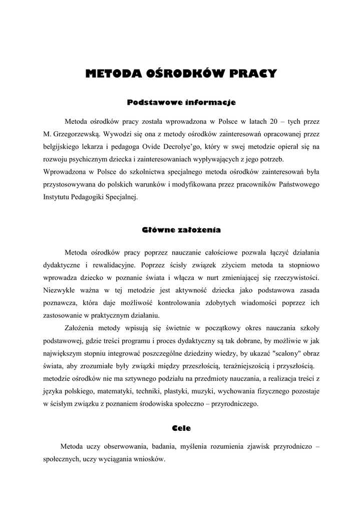 METODA OŚRODKÓW PRACY Podstawowe informacje Metoda ośrodków pracy została wprowadzona w Polsce w latach 20 – tych przez M. Grzegorzewską. Wywodzi się ona z metody ośrodków zainteresowań opracowanej przez belgijskiego lekarza i pedagoga Ovide Decrolye’go, który w swej metodzie opierał się na rozwoju psychicznym dziecka i zainteresowaniach wypływających z jego potrzeb. Wprowadzona w Polsce do szkolnictwa specjalnego metoda ośrodków zainteresowań była przystosowywana do polskich warunków i modyfikowana przez pracowników Państwowego Instytutu Pedagogiki Specjalnej. Główne założenia Metoda ośrodków pracy poprzez nauczanie całościowe pozwala łączyć działania dydaktyczne i rewalidacyjne. Poprzez ścisły związek zżyciem metoda ta stopniowo wprowadza dziecko w poznanie świata i włącza w nurt zmieniającej się rzeczywistości. Niezwykle ważna w tej metodzie jest aktywność dziecka jako podstawowa zasada poznawcza, która daje możliwość kontrolowania zdobytych wiadomości poprzez ich zastosowanie w praktycznym działaniu. Założenia metody wpisują się świetnie w początkowy okres nauczania szkoły podstawowej, gdzie treści programu i proces dydaktyczny są tak dobrane, by możliwie w jak największym stopniu integrować poszczególne dziedziny wiedzy, by ukazać "scalony" obraz świata, aby zrozumiałe były związki między przeszłością, teraźniejszością i przyszłością. metodzie ośrodków nie ma sztywnego podziału na przedmioty nauczania, a realizacja treści z języka polskiego, matematyki, techniki, plastyki, muzyki, wychowania fizycznego pozostaje w ścisłym związku z poznaniem środowiska społeczno – przyrodniczego. Cele Metoda uczy obserwowania, badania, myślenia rozumienia zjawisk przyrodniczo – społecznych, uczy wyciągania wniosków. Praca metodą ośrodków pracy sprzyja rozwijaniu mechanizmów poznawczych dzięki ciągłości, systematyczności i logice w układzie materiału oraz uaktywnieniu wszystkich analizatorów w naturalnych warunkach. Dla kogo W pedagogice specjalnej metoda świetnie odpowiada potrzebom edukacyjnym i psychofizycznym uczniów z upośledzeniem umysłowym, którzy mają duże trudności w różnicowaniu, uogólnianiu, abstrahowaniu, wiązaniu logicznych całości, tworzeniu nowych pojęć, wnioskowaniu samodzielnym myśleniu, orientacji w nowej sytuacji. Metoda ośrodków pracy oparta na zainteresowaniach dziecka, dostosowana jest do jego charakterystycznych potrzeb i skłonności, uwzględnia wszystkie właściwości psychiczne ucznia, a także wymagania zawarte w programie nauczania i dlatego stanowi inspirację dla kształcenia zintegrowanego szkoły podstawowej. Stosowanie /Wykorzystanie /Charakterystyka Metoda ośrodków pracy posiada specjalną konstrukcję systemu lekcyjnego. Lekcje jednego dnia stanowią podstawową jednostkę dydaktyczną, tzw. dzienny ośrodek pracy. Nauczyciel wychodzi z jednego zagadnienia, wokół którego grupują się inne, bezpośrednio wiążące się z nim tematy. Dzienne ośrodki pracy składają się na ośrodki tygodniowe, a te z kolei na ośrodki okresowe i roczne. Nauczyciel wychodzi z jednego zagadnienia, stanowiącego centrum, wokół którego grupuje się inne, bezpośrednio z nim wiążące się problemy. Planując ośrodek pracy nauczyciel określa cele, jakie zamierza osiągnąć oraz formy i metody, jakie chce zastosować do ich osiągnięcia. Należy przy tym uwzględnić cechy indywidualne uczniów, ich zainteresowania, tempo pracy oraz przeplatanie wysiłek umysłowego z fizycznym. W dziennym ośrodku pracy wyróżnia się następujące etapy: zajęcia wstępne; praca poznawcza – obserwacja i kojarzenie; ekspresja; zajęcia końcowe. Zajęcia wstępne stanowią pierwszy etap dziennego ośrodka pracy. Tworzy się wówczas odpowiednie warunki dalszej pracy, atmosferę przygotowującą do wysiłku poznawczego i działań praktycznych w ciągu dnia. W zajęciach wstępnych realizowane są treści z różnych przedmiotów. Obejmują one następuje czynności: zajęcia porządkowe (przywitanie z uczniami, lista obecności, ustalenie daty); analizę zmian przyrodniczych i stanu pogody; ćwiczenia ruchowe związane z tematyką dnia; ustalenie celu i tematu zajęć. Obserwacja jest kolejnym etapem metody ośrodków pracy, który ma na celu poznanie nowego materiału, dostarczenie potrzebnej ilości materiału do stworzenia systemu wiedzy o danym zjawisku. Obserwowanie polega na celowym, planowym i świadomym spostrzeganiu przedmiotów i zjawisk. W zależności od kryteriów, jakie przyjmiemy obserwację możemy podzielić na bezpośrednią i pośrednią, dowolną i kierowaną, planową i przypadkową. Obserwacja bezpośrednia, to poznanie przedmiotu, sytuacji, zjawiska przyrodniczego w naturalnych warunkach. Proces poznawczy powinien przebiegać tam, gdzie wymaga tego omawiany temat, np. w parku, na poczcie, w klasie. Czynności planowane są tak, aby uczeń czynnie uczestniczył w obserwacji i samodzielnie dochodził do wniosków. Podczas obserwacji, dziecko ma możliwość dotykania, wąchania, smakowania, przekształcania, manipulowania. Na zakończenie obserwacji prowadzonej w naturalnym środowisku nauczyciel powtarza z uczniami zgromadzone wiadomości. Obserwacja ściśle związana jest z kolejnym etapem pracy poznawczej zwanym kojarzeniem, podczas którego następuje wiązanie tego, co działo się w czasie obserwacji z tym, co działo się wcześniej i w innej sytuacji. Zgromadzoną wiedzę weryfikuje się, łączy w logiczną całość i wiąże z materiałem poprzednio opracowanym w zwarty system. Ma to na celu uświadomienie uczniom rozmaitego rodzaju związków i zależności między faktami, skutkami i przyczynami. W tym celu wykorzystuje się przyniesione ze spaceru eksponaty i wspomaga pamięć uczniów odpowiednio dobranymi środkami dydaktycznymi. Dzięki temu dziecko uświadamia sobie i łączy w całość istotne cechy poznawanego 
