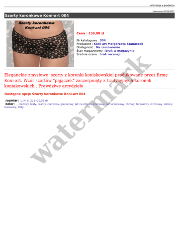 Informacje o produkcie Utworzono 07-03-2017 Szorty koronkowe Koni-art 004 Cena : 159,00 zł er m ar k Nr katalogowy : 004 Producent : Koni-art Małgorzata Stanaszek Dostępność : Na zamówienie Stan magazynowy : brak w magazynie Średnia ocena : brak recenzji Eleganckie zmysłowe szorty z koronki koniskowskiej produkowane przez firmę Koni-art. Wzór szortów "pajączek" zaczerpnięty z tradycyjnych koronek koniakowskich . Prawdziwe arcydzieło Dostępne opcje Szorty koronkowe Koni-art 004 rozmiar: L, M, S, XL (+20,00 zł). kolor: , , beżowy, biały, czarny, czerwony, granatowy, jak na zdjęciu, kremowy, pomarańczowy, różowy, turkusowy, wrzosowy, zielony, w at łososiowy, żółty.