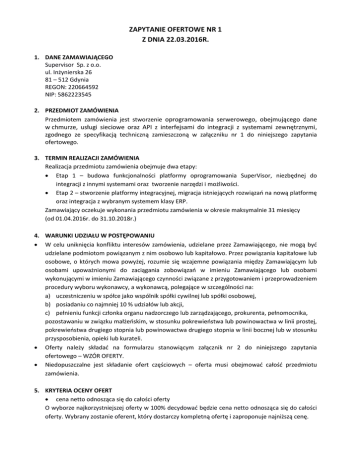 ZAPYTANIE OFERTOWE NR 1 Z DNIA 22.03.2016R. 1. DANE ZAMAWIAJĄCEGO Supervisor Sp. z o.o. ul. Inżynierska 26 81 – 512 Gdynia REGON: 220664592 NIP: 5862223545 2. PRZEDMIOT ZAMÓWIENIA Przedmiotem zamówienia jest stworzenie oprogramowania serwerowego, obejmującego dane w chmurze, usługi sieciowe oraz API z interfejsami do integracji z systemami zewnętrznymi , zgodnego ze specyfikacją techniczną zamieszczoną w załączniku nr 1 do niniejszego zapytania ofertowego. 3. TERMIN REALIZACJI ZAMÓWIENIA Realizacja przedmiotu zamówienia obejmuje dwa etapy: Etap 1 – budowa funkcjonalności platformy oprogramowania SuperVisor, niezbędnej do integracji z innymi systemami oraz tworzenie narzędzi i możliwości. Etap 2 – stworzenie platformy integracyjnej, migracja istniejących rozwiązań na nową platformę oraz integracja z wybranym systemem klasy ERP. Zamawiający oczekuje wykonania przedmiotu zamówienia w okresie maksymalnie 31 miesięcy (od 01.04.2016r. do 31.10.2018r.) 4. WARUNKI UDZIAŁU W POSTĘPOWANIU W celu uniknięcia konfliktu interesów zamówienia, udzielane przez Zamawiającego, nie mogą być udzielane podmiotom powiązanym z nim osobowo lub kapitałowo. Przez powiązania kapitałowe lub osobowe, o których mowa powyżej, rozumie się wzajemne powiązania między Zamawiającym lub osobami upoważnionymi do zaciągania zobowiązań w imieniu Zamawiającego lub osobami wykonującymi w imieniu Zamawiającego czynności związane z przygotowaniem i przeprowadzeniem procedury wyboru wykonawcy, a wykonawcą, polegające w szczególności na: a) uczestniczeniu w spółce jako wspólnik spółki cywilnej lub spółki osobowej, b) posiadaniu co najmniej 10 % udziałów lub akcji, c) pełnieniu funkcji członka organu nadzorczego lub zarządzającego, prokurenta, pełnomocnika, pozostawaniu w związku małżeńskim, w stosunku pokrewieństwa lub powinowactwa w linii prostej, pokrewieństwa drugiego stopnia lub powinowactwa drugiego stopnia w linii bocznej lub w stosunku przysposobienia, opieki lub kurateli. Oferty należy składać na formularzu stanowiącym załącznik nr 2 do niniejszego zapytania ofertowego – WZÓR OFERTY. Niedopuszczalne jest składanie ofert częściowych – oferta musi obejmować całość przedmiotu zamówienia. 5. KRYTERIA OCENY OFERT cena netto odnosząca się do całości oferty O wyborze najkorzystniejszej oferty w 100% decydować będzie cena netto odnosząca się do całości oferty. Wybrany zostanie oferent, który dostarczy kompletną ofertę i zaproponuje najniższą cenę. 6. ZMIANA UMOWY Nie przewiduje się wprowadzania zmian w umowie o udzielenie zamówienia, za wyjątkiem zmian nieistotnych, tzn. nie wpływających na kryteria oceny ofert (np. zmiana dotycząca danych adresowych stron umowy). 7. TERMIN I MIEJSCE SKŁADANIA OFERT: Oferty należy przesyłać w formie pisemnej lub elektronicznej. Oferty należy składać do 30.03.2016r. do godziny 15.00. Oferty pisemne należy kierować na adres: Supervisor Sp. z o.o. ul. Inżynierska 26 81 – 512 Gdynia Oferty elektroniczne należy przesyłać na adres: [email protected] Oferty, które wpłyną po terminie nie zostaną uwzględnione. 8. TERMIN ZWIĄZANIA OFERTĄ Złożone oferty powinny posiadać datę ważności do 30 kwietnia 2016r. 9. OSOBY WYZNACZONE DO KONTAKTU Z WYKONAWCAMI: Wszelkie informacje związane z zapytaniem ofertowym można otrzymać od: Robert Pietrzak e-mail: [email protected] tel. 604 185 996 Załącznik nr 1 do zapytania ofertowego nr 1 z dnia 22.03.2016r. SPECYFIKACJA TECHNICZNA do stworzenia programowania serwerowego, obejmującego dane w chmurze, usługi sieciowe oraz API z interfejsami do integracji z systemami zewnętrznymi Zamawiający oczekuje wykonania przedmiotu zamówienia w okresie maksymalnie 31 miesięcy (01.04.2016 do 31.10.2018r.). Sposób nabycia/rozliczania: 31 faktur częściowych (faktury wystawiane miesięcznie). Etap 1 – Budowa funkcjonalności platformy oprogramowania SuperVisor, niezbędnej do integracji z innymi systemami oraz tworzenie narzędzi i możliwości. L.p. Zakres prac: Czas realizacji (mc): 1 Stworzenie funkcjonalności aplikacji mobilnej (terminalowej) na platformę mobilną, obejmującej: a) przyjmowanie zleceń transportowych, b) realizację zleceń transportowych z uwzględnieniem pełnej i szczegółowej informacji zwrotnej z realizacji. 2 2 Stworzenie funkcjonalności wspierającej aplikację mobilną w aplikacji SuperVisor WEB, obejmującej: a) przesyłanie zleceń transportowych na wybrane urządzenie mobilne, b) przesyłanie pozostałych danych konfiguracyjnych wspierających wymianę danych z terminalem mobilnym (m.in. szablony komunikatów), c) odbieranie z terminali danych o realizacji zleceń oraz ich wizualizacja w interfejsach systemu SuperVisor WEB. 1 3 Budowa funkcjonalności wspierającej monitorowanie poprawności działania rejestratorów oraz infrastruktury firmy, obejmującej: a) wykonanie modułów agregujących dane o błędach zbierane w rejestratorach oraz wynikające z przetwarzania danych z rejestratorów, b) stworzenie narzędzi analitycznych wspierających diagnostykę poprawności działania urządzeń oraz procesów przetwarzania danych. 1 4 Budowa modułu planowania tras i wizyt, zawiera: a) budowę interfejsu użytkownika w aplikacji SuperVisor WEB, b) budowę modułu planowania z wykorzystaniem bibliotek rozwiązujących problemy planowania tras (vehicle routing problems). 1 5 Stworzenie modułu ewidencji czasu pracy 1 Etap 2 – stworzenie platformy integracyjnej, migracja istniejących rozwiązań na nową platformę oraz integracja z wybranym systemem klasy ERP. L.p. Zakres prac: Czas realizacji (mc) 1 Stworzenie technicznej platformy integracyjnej umożliwiającej migrację techniczną i technologiczną aktualnego systemu SuperVisor WEB do uniwersalnej biznesowej platformy integracyjnej. 3 2 Migracja istniejących rozwiązań na nową platformę obejmująca: 14 a) Budowa modułu pozycjonowania po