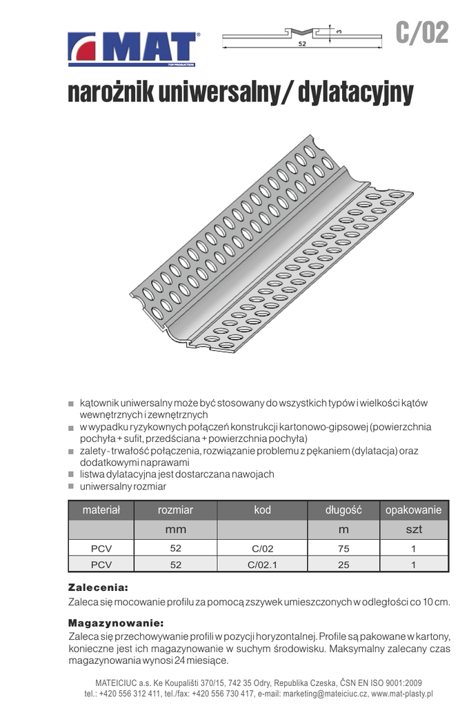 C/02 narożnik uniwersalny/ dylatacyjny kątownik uniwersalny może być stosowany do wszystkich typów i wielkości kątów wewnętrznych i zewnętrznych w wypadku ryzykownych połączeń konstrukcji kartonowo-gipsowej (powierzchnia pochyła + sufit, przedściana + powierzchnia pochyła) zalety - trwałość połączenia, rozwiązanie problemu z pękaniem (dylatacja) oraz dodatkowymi naprawami listwa dylatacyjna jest dostarczana nawojach uniwersalny rozmiar materiał rozmiar kod mm długość opakowanie m szt PCV 52 C/02 75 1 PCV 52 C/02.1 25 1 Zalecenia: Zaleca się mocowanie profilu za pomocą zszywek umieszczonych w odległości co 10 cm. Magazynowanie: Zaleca się przechowywanie profili w pozycji horyzontalnej. Profile są pakowane w kartony, konieczne jest ich magazynowanie w suchym środowisku. Maksymalny zalecany czas magazynowania wynosi 24 miesiące. MATEICIUC a.s. Ke Koupališti 370/15, 742 35 Odry, Republika Czeska, ČSN EN ISO 9001:2009 tel.: +420 556 312 411, tel./fax: +420 556 730 417, e-mail: [email protected], www.mat-plasty.pl
