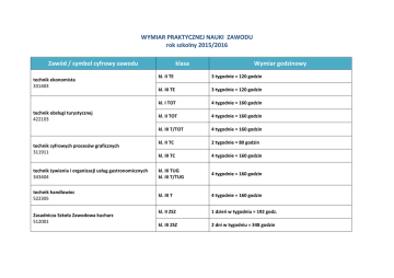 WYMIAR PRAKTYCZNEJ NAUKI ZAWODU rok szkolny 2015/2016 Zawód / symbol cyfrowy zawodu klasa Wymiar godzinowy kl. II TE 3 tygodnie = 120 godzin kl. III TE 3 tygodnie = 120 godzin kl. I TOT 4 tygodnie = 160 godzin kl. II TOT 4 tygodnie = 160 godzin kl. III T/TOT 4 tygodnie = 160 godzin kl. II TC 2 tygodnie = 80 godzin kl. III TC 4 tygodnie = 160 godzin technik żywienia i organizacji usług gastronomicznych 343404 kl. III TUG kl. III T/TUG 4 tygodnie = 160 godzin technik handlowiec 522305 kl. III T 4 tygodnie = 160 godzin kl. II ZSZ 1 dzień w tygodniu = 192 godz. kl. III ZSZ 2 dni w tygodniu = 348 godzin technik ekonomista 331403 technik obsługi turystycznej 422103 technik cyfrowych procesów graficznych 311911 Zasadnicza Szkoła Zawodowa kucharz 512001