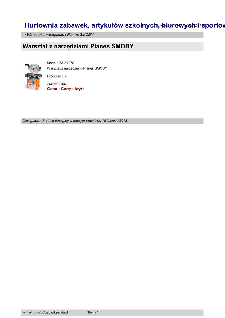 : 07 marzec 2017 Hurtownia zabawek, artykułów szkolnych,Utworzono biurowych i sportow > Warsztat z narzędziami Planes SMOBY Warsztat z narzędziami Planes SMOBY Model : ZA-67978 Warsztat z narzędziami Planes SMOBY Producent : 7600500255 Cena : Ceny ukryte Dostępność: Produkt dostępny w naszym sklepie od 15 listopad 2013 kontakt : - [email protected] Strona 1