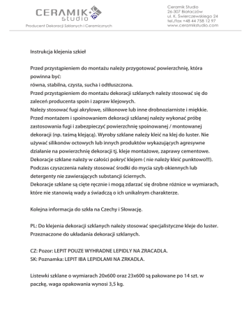 Ceramik Studio 26-307 Białaczów ul. K. Świerczewskiego 24 tel./fax +48 44 758 12 97 www.ceramikstudio.com Producent Dekoracji Szklanych i Ceramicznych Instrukcja klejenia szkie Przed przyst pieniem do monta u nale y przygotowa powierzchni , która powinna by : równa, stabilna, czysta, sucha i odt uszczona. Przed przyst pieniem do monta u dekoracji szklanych nale y stosowa si do zalece producenta spoin i zapraw klejowych. Nale y stosowa fugi akrylowe, silikonowe lub inne drobnoziarniste i mi kkie. Przed monta em i spoinowaniem dekoracji szklanej nale y wykona prób zastosowania fugi i zabezpieczy powierzchni spoinowanej / montowanej dekoracji (np. ta m klej c ). Wyroby szklane nale y klei na klej do luster. Nie u ywa silikonów octowych lub innych produktów wykazuj cych agresywne dzia anie na powierzchni dekoracji tj. kleje monta owe, zaprawy cementowe. Dekoracje szklane nale y w ca o ci pokry klejem ( nie nale y klei punktowo!!!). Podczas czyszczenia nale y stosowa rodki do mycia szyb okiennych lub detergenty nie zawieraj cych substancji ciernych. Dekoracje szklane s ci te r cznie i mog zdarza si drobne ró nice w wymiarach, które nie stanowi wady a wiadcz o ich unikalnym charakterze. Kolejna informacja do szk a na Czechy i S owacj . PL: Do klejenia dekoracji szklanych nale y stosowa specjalistyczne kleje do luster. Przeznaczone do uk adania dekoracji szklanych. CZ: Pozor: LEPIT POUZE WYHRADNE LEPIDLY NA ZRACADLA. SK: Poznamka: LEPIT IBA LEPIDLAMI NA ZRKADLA. Listewki szklane o wymiarach 20x600 oraz 23x600 s pakowane po 14 szt. w paczk , waga opakowania wynosi 3,5 kg.