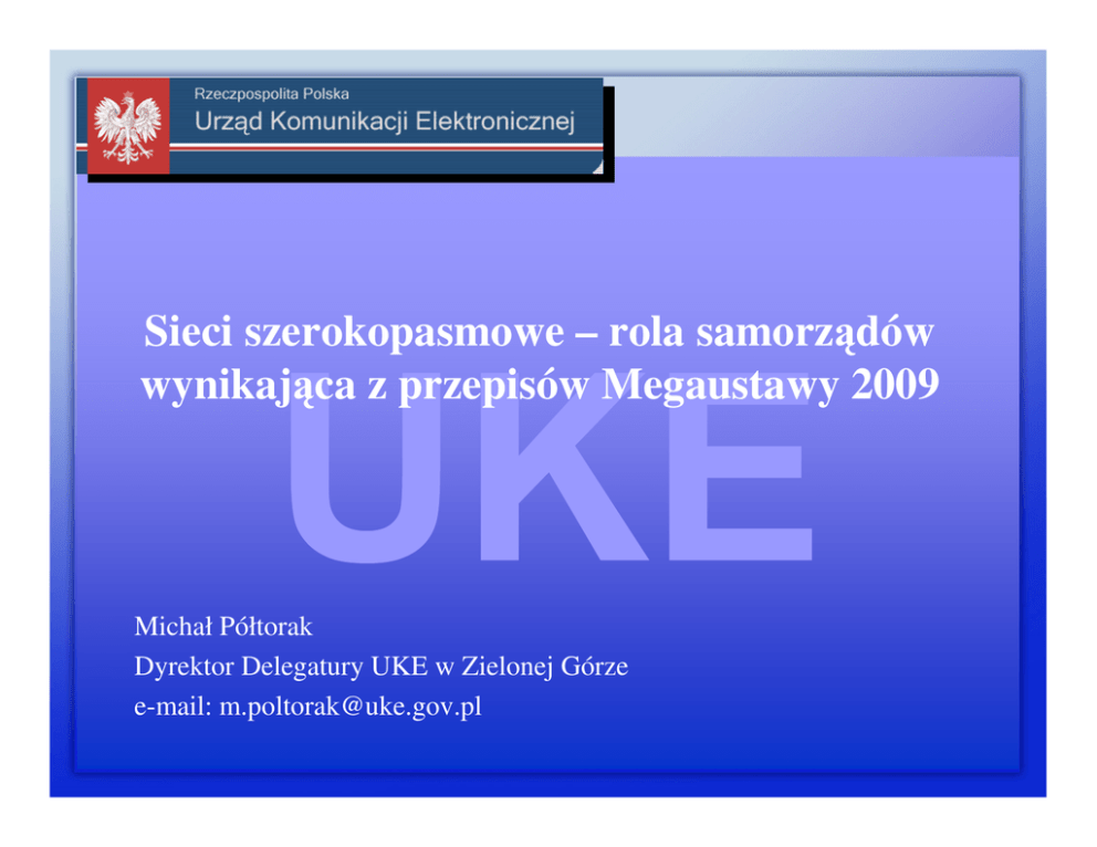Sieci szerokopasmowe – rola samorządów wynikająca z przepisów Megaustawy 2009 Michał Półtorak Dyrektor Delegatury UKE w Zielonej Górze e-mail: [email protected] 1. Wstęp Sieci szerokopasmowe stanowią fundament społeczeństwa informacyjnego XXI wieku. Możliwość dostępu, przetwarzania i przesyłania wszelkich informacji w postaci cyfrowej, 24 godziny na dobę stanowi siłę napędową umożliwiającą dynamiczny rozwój gospodarczy każdego kraju. Zgodnie z definicją Komisji Europejskiej za sieć szerokopasmową uważa się łącze o przepustowości 144 kbit/s wzwyż. Z pozycji użytkownika końcowego pojęcie „ dostęp szerokopasmowy” oznacza komunikację, która pozwala na szybki dostęp i wymianę aplikacji biznesowych, usług społecznych oraz treści medialnych przy użyciu szerokiej gamy przewodowych i bezprzewodowych sieci dostępu. Usługi dostępne dzięki sieciom szerokopasmowym 2. Technologie dostępu szerokopasmowego Z punktu widzenia zapewnienia dostępu szerokopasmowego technologie dostępu można podzielić na dwie kategorie: Technologie przewodowe: • kabel telekomunikacyjny; • światłowód; • komunikacja przez linie energetyczne; Technologie bezprzewodowe: • technologia satelitarna; • technologia 3G; • technologia WLAN; • technologia WiMAX; Podział ten nie jest podziałem wyczerpującym wszystkie spotykane technologie, wskazuje jednak na główne cechy każdej z nich w celu ułatwienia oceny przydatności technologii na potrzeby lokalnego lub regionalnego projektu wdrażania dostępu szerokopasmowego. 3. Dostępność usług szerokopasmowych w Polsce Na tle innych państw członkowskich Unii Europejskiej jeszcze na koniec roku 2007 Polska plasowała się na przedostatnim miejscu, ze wskaźnikiem penetracji o wartości zaledwie 8,4%, tj. niemal dwuipółkrotnie niższym niż średnia dla UE. W wyniku podejmowanych dotychczas działań, w roku 2008 doszło do poprawy omawianych wskaźników. Średnia wartość wskaźnika penetracji usług szerokopasmowych w UE w styczniu 2009 r. wzrosła do 22,9%. Wskaźnik penetracji dla Polski wzrósł w tym samym okresie do 13,2%, co zmieniło również pozycję Polski względem pozostałych państw członkowskich UE (z 26-tego na 24-te miejsce). Europejskim liderem pozostaje Dania, z penetracją na poziomie 37,3%. 4. Ustawa o wspieraniu rozwoju usług i sieci telekomunikacyjnych – Megaustawa 2009 Istotnym elementem „Planu stabilności i rozwoju – wzmocnienie gospodarki Polski wobec światowego kryzysu finansowego” jest zwiększenie popytu inwestycyjnego w sektorze telekomunikacji, w szczególności poprzez działania mające na celu przyśpieszenie inwestycji współfinansowanych ze środków UE oraz zniesienie barier dla inwestycji w infrastrukturę teleinformatyczną, by zapewnić ogólnopolski dostęp do Internetu szerokopasmowego. Celowi temu ma służyć przyjęta przez Sejm w dniu 7 maja 2010 r. ustawa o wspieraniu rozwoju usług i sieci telekomunikacyjnych – Megaustawa 2009. 5. Cel ustawy Celem ustawy jest unowocześnienie gospodarki poprzez rozwój usług i sieci szerokopasmowych, a w szczególności: • wspieranie równoprawnej i skutecznej konkurencji w zakresie budowy i dostępu do infrastruktury telekomunikacyjnej; • stworzenie warunków rozwoju i wykorzystania nowoczesnej infrastruktury telekomunikacyjnej, w tym poprzez likwidację barier w procesie inwestycyjnym, poprawę dostępu do gruntów, budynków na potrzeby inwestycji telekomunikacyjnych oraz wykorzystanie istniejącej infrastruktury; • zaspokojenie potrzeb rozwoju telekomunikacji w procesie budowlanym i planowania przestrzennego; • aktywizacja jednostek samorządu terytorialnego, a także podmiotów wykonujących zadania z zakresu użyteczności publicznej w zakresie inwestycji związanych z telekomunikacją. 6. Zadania i rola jednostek samorządu terytorialnego Jednostka samorządu terytorialnego może w celu zaspokajania zbiorowych potrzeb wspólnoty samorządowej: 1) budować lub eksploatować infrastrukturę telekomunikacyjną i sieci telekomunikacyjne oraz nabywać prawa do infrastruktury telekomunikacyjnej i sieci telekomunikacyjnych; 2) dostarczać sieci telekomunikacyjne lub zapewniać dostęp do infrastruktury telekomunikacyjnej; 3) świadczyć, z wykorzystaniem posiadanej infrastruktury telekomunikacyjnej i sieci telekomunikacyjnych, usługi na rzecz: • przedsiębiorców telekomunikacyjnych; • podmiotów wykonujących zadania z zakresu obronności i bezpieczeństwa państwa; • użytkowników końcowych - w zakresie i na warunkach określonych w ustawie; 7. Warunki prowadzenia działalności telekomunikacyjnej przez jednostki samorządu terytorialnego (1) Jednostki samorządu terytorialnego wykonują działalność telekomunikacyjną: • przy zachowaniu spójności z innymi sieciami telekomunikacyjnymi; • w sposób przejrzysty i nie zakłócający rozwoju równoprawnej i skutecznej konkurencji na rynkach telekomunikacyjnych; • przy uwzględnieniu, w możliwie najszerszym zakresie, Komunikatu Komisji - Wytyczne wspólnotowe w sprawie stosowania przepisów dotyczących pomocy państwa w odniesieniu do szybkiego wdrażania sieci szerokopasmowych (Dz.Urz. UE C Nr 235 z 30.09.2009, str. 7). Warunki prowadzenia działalności telekomunikacyjnej przez jednostki samorządu terytorialnego (2) • przy wykonywaniu przez JST działalności w zakresie telekomunikacji mają zastosowanie przepisy o pomocy publicznej; • działalność w zakresie telekomunikacji należy do zadań własnych jednostki samorządu terytorialnego; • JST wykonuje działalność w zakresie telekomunikacji na podstawie uchwały organu stanowiącego; • informację o podjęciu działalności w zakresie telekomunikacji ogłasza się na stronie internetowej jednostki samorządu terytorialnego i w siedzibie tej jednostki oraz przekazuje Prezesowi UKE; Dziękuję za uwagę Gorzów Wlkp., dnia 26.05.2010 r.