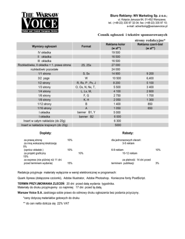 Biuro Reklamy: WV Marketing Sp. z o.o.; ul. Księcia Janusza 64, 01-452 Warszawa; tel.: (+48-22) 335 97 32-34; fax: (+48-22) 335 97 10; e-mail: [email protected] Cennik ogłoszeń i tekstów sponsorowanych strony redakcyjne* Wymiary ogłoszeń Format IV okładka II okładka III okładka Rozkładówka, II okładka + 1. prawa strona rozkładówki pozostałe 1/1 strona 3/2 page 1/2 strony 1/3 strony 1/4 strony 1/6 strony 1/8 strony 1/12 strony 1/16 strony I okładka I okładka Insert w całym nakładzie (do 20g) Insert w nakładzie krajowym (do 20g) 2S, 2Sx S, Sx W R, Rx, P , Px, J O, Ox, N, Nx, T, L, Lx, M, F, G K, H B A banner B1, Y banner B2 Reklama kolor (w zł**) 19 500 16 500 16 500 27 000 24 000 14 900 10 500 8 200 5 500 4 100 2 750 2 050 1 400 1 050 5 000 6 000 6 300 5000 Dopłaty: za prawą stronę za inną wskazaną lokalizację 5% (oprócz okładek ) za projekt graficzny 15% za express (nie później niż 11 dni przed terminem wydania) Reklama czerń-biel (w zł**) 9 200 6,400 5 100 3 400 2 600 1 700 1 300 850 650 Rabaty: 10% dla jednorazowych zleceń: 3-5 reklam 10% 10% 15% 6-9 reklam 10-12 reklam za płatność 14 dni przed terminem publikacji Redakcja przyjmuje materiały wyłącznie w wersji elektronicznej w programach: Quark Xpress (dołączone czcionki), Adobe Illustrator, Adobe Photoshop. Konieczne fonty PostScript. TERMIN PRZYJMOWANIA ZLECEŃ: 20 dni przed datą wydania tygodnika. Materiały do druku przyjmujemy co najmniej 17 dni przed tą datą. Warsaw Voice S.A. zastrzega sobie prawo do odmowy druku ogłoszenia bez podania przyczyny. *ceny dotyczą materiałów gotowych do druku ** do cen netto dolicza się 22% VAT 10% 3%