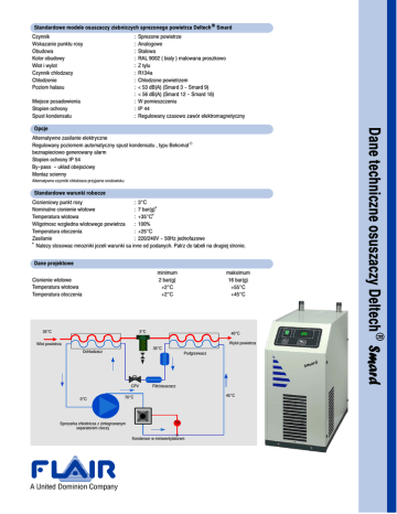 Standardowe modele osuszaczy ziebniczych sprezonego powietrza DeltechR Smard Czynnik Wskazanie punktu rosy Obudowa Kolor obudowy Wlot i wylot Czynnik chlodzacy Chlodzenie Poziom halasu : : : : : : : : : : : : Miejsce posadowienia Stopien ochrony Spust kondensatu Sprezone powietrze Analogowe Stalowa RAL 9002 ( bialy ) malowana proszkowo Z tylu R134a Chlodzone powietrzem < 53 dB(A) (Smard 3 -- Smard 9) < 56 dB(A) (Smard 12 -- Smard 18) W pomieszczeniu IP 44 Regulowany czasowo zawór elektromagnetyczny Alternatywne zasilanie elektryczne Regulowany poziomem automatyczny spust kondensatu , typu BekomatR beznapieciowo generowany alarm Stopien ochrony IP 54 By--pass -- uklad obejsciowy Montaz scienny Alternatywne czynniki chlodzace przyjazne srodowisku Standardowe warunki robocze Cisnieniowy punkt rosy : 3°C Nominalne cisnienie wlotowe : 7 bar(g)* Temperatura wlotowa : +35°C* Wilgotnosc wzgledna wlotowego powietrza : 100% Temperatura otoczenia : +25°C Zasilanie : 220/240V -- 50Hz jednofazowe * Nalezy stosowac mnozniki jezeli warunki sa inne od podanych. Patrz do tabeli na drugiej stronie. Dane projektowe minimum 2 bar(g) +2°C +2°C Cisnienie wlotowe Temperatura wlotowa Temperatura otoczenia 35°C maksimum 16 bar(g) +55°C +45°C 3°C 40°C Wylot powietrza Wlot powietrza 35°C Ochladzacz CPV 0°C Podgrzewacz Filtr/osuszacz 45°C 70°C Sprezarka chlodnicza z zintegrowanym separatorem cieczy TS Kondenser w miniwentylatorem Dane techniczne osuszaczy DeltechR Smard Opcje Model Smard Smard Smard Smard Smard 3 6 9 12 18 Wydajnosc Wymiary Ciezar * ** A B C m3/h m3/h mm mm mm kg 24 40 54 72 108 22 35 46 66 90 504 504 504 504 504 261 261 261 261 261 553 553 553 553 553 26 27 27 30 32 Przylacza Spadek cisnienia Chlodzenie pow bar m3/h kW G 3/4 G 3/4 G 3/4 G 3/4 G 3/4 0.12 0.20 0.26 0.22 0.22 140 140 150 200 200 0.16 0.25 0.32 0.47 0.52 Pobór mocy * Zalecana wydajnosc osuszacza zgodnie z DIN ISO 7183 (kiedy jest montowany za zbiornikiem). Jakosc sprezonego powietrza za osuszaczem : wolna od kondensatu , wilgotnosc wzgledna <40%. ** Nominalna wydajnosc osuszacza zgodnie z DIN ISO 7183 , cisnieniowy punkt rosy +3°C C Dane techniczne osuszaczy DeltechR Smard Wydajnosc osuszacza oparta jest na poborze objetosciowym sprezonego powietrza sprezarki przy 20°C , 1 bar (a) Nastepujace dane moga byc stosowane do zmiany warunków powietrza wlotowego na wymagana wydajnosc osuszacza. B A Mnoznik (FP) dla róznych cisnien wlotowych w bar (g) bar(g) Mnoznik 2 0.70 3 0.80 4 0.87 5 0.92 6 0.96 7 1.00 8 1.03 9 1.05 10 1.07 11 1.08 12 1.10 13 1.11 14 1.12 15 1.13 16 1.14 Mnoznik dla róznych temperatur otaczajacego powietrza Wydajnosc osuszacza Smard jest zalezna od temperatury otoczenia pomiedzy +2° i +45°C Mnoznik (FTI) dla róznych temperatur wlotowych w °C °C Mnoznik +25 1.60 +30 1.24 +35 1.00 Przyklad: Wydajnosc Cisnienie wlotowe Temperatura wlotowa V1 V2 +40 0.82 +45 0.69 +50 0.59 +55 0.50 Obliczenia: 45 m3/h : : 10 bar(g) : +40°C : Rzeczywista wydajnosc przy poprawionych : Wydajnosc zadana 20°C, 1 bar(a) V2 45 V1 = ———— = —————— = 51.3 m3/h FP * FTI 11.07 07 * 0.82 0 82 Osuszacz Smard 9 jest wystarczajacy Prosimy o kontakt: Dane moga ulec zmianie bez wczesniejszego powiadomienia Flair Filtration & Drying BV DS- SMA- 0012- PL http://www.flairbv.nl Heistraat 1 4878 AJ Etten--Leur the Netherlands Tel.: (+31) 076 -- 5085800 Fax: (+31) 076 -- 5085590 email: [email protected] ART NR. 865xxxx Flair Limited Hazleton Interchange Lakesmere Road, Horndean, Hants PO8 9JU, United Kingdom Tel.: (+44) 023 -- 92591021 Fax: (+44) 023 -- 92596799 email: [email protected] Flair Filter-- und Trocknertechnik GmbH Martener Hellweg 29 D--44379 Dortmund Germany Tel.: (+49) 0231 -- 917 32 30 Fax: (+49) 0231 -- 917 32 33