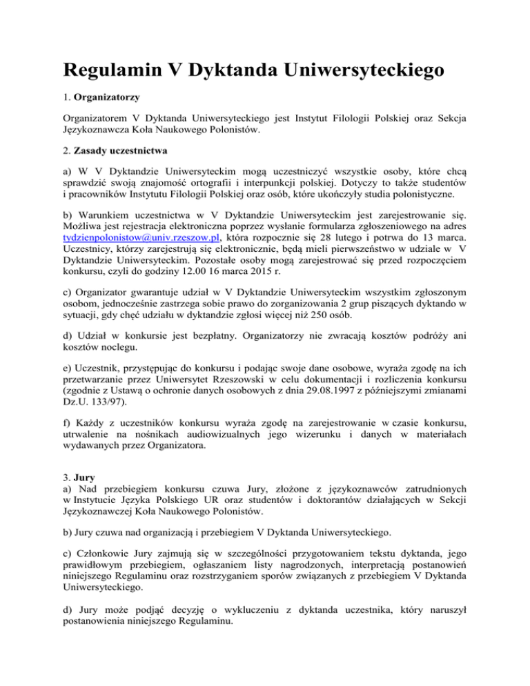Regulamin V Dyktanda Uniwersyteckiego 1. Organizatorzy Organizatorem V Dyktanda Uniwersyteckiego jest Instytut Filologii Polskiej oraz Sekcja Językoznawcza Koła Naukowego Polonistów. 2. Zasady uczestnictwa a) W V Dyktandzie Uniwersyteckim mogą uczestniczyć wszystkie osoby, które chcą sprawdzić swoją znajomość ortografii i interpunkcji polskiej. Dotyczy to także studentów i pracowników Instytutu Filologii Polskiej oraz osób, które ukończyły studia polonistyczne. b) Warunkiem uczestnictwa w V Dyktandzie Uniwersyteckim jest zarejestrowanie się. Możliwa jest rejestracja elektroniczna poprzez wysłanie formularza zgłoszeniowego na adres [email protected], która rozpocznie się 28 lutego i potrwa do 13 marca. Uczestnicy, którzy zarejestrują się elektronicznie, będą mieli pierwszeństwo w udziale w V Dyktandzie Uniwersyteckim. Pozostałe osoby mogą zarejestrować się przed rozpoczęciem konkursu, czyli do godziny 12.00 16 marca 2015 r. c) Organizator gwarantuje udział w V Dyktandzie Uniwersyteckim wszystkim zgłoszonym osobom, jednocześnie zastrzega sobie prawo do zorganizowania 2 grup piszących dyktando w sytuacji, gdy chęć udziału w dyktandzie zgłosi więcej niż 250 osób. d) Udział w konkursie jest bezpłatny. Organizatorzy nie zwracają kosztów podróży ani kosztów noclegu. e) Uczestnik, przystępując do konkursu i podając swoje dane osobowe, wyraża zgodę na ich przetwarzanie przez Uniwersytet Rzeszowski w celu dokumentacji i rozliczenia konkursu (zgodnie z Ustawą o ochronie danych osobowych z dnia 29.08.1997 z późniejszymi zmianami Dz.U. 133/97). f) Każdy z uczestników konkursu wyraża zgodę na zarejestrowanie w czasie konkursu, utrwalenie na nośnikach audiowizualnych jego wizerunku i danych w materiałach wydawanych przez Organizatora. 3. Jury a) Nad przebiegiem konkursu czuwa Jury, złożone z językoznawców zatrudnionych w Instytucie Języka Polskiego UR oraz studentów i doktorantów działających w Sekcji Językoznawczej Koła Naukowego Polonistów. b) Jury czuwa nad organizacją i przebiegiem V Dyktanda Uniwersyteckiego. c) Członkowie Jury zajmują się w szczególności przygotowaniem tekstu dyktanda, jego prawidłowym przebiegiem, ogłaszaniem listy nagrodzonych, interpretacją postanowień niniejszego Regulaminu oraz rozstrzyganiem sporów związanych z przebiegiem V Dyktanda Uniwersyteckiego. d) Jury może podjąć decyzję o wykluczeniu z dyktanda uczestnika, który naruszył postanowienia niniejszego Regulaminu. e) Jury zobowiązane jest do zachowania bezstronności podczas oceny poszczególnych prac. 4. Przebieg V Dyktanda Uniwersyteckiego a) Dyktando odbędzie się w dużej auli w budynku A0 przy ul. Pigonia 1 w Rzeszowie 16 marca 2015 roku o godzinie 12.30. b) Podczas pisania tekstu dyktanda uczestnikom nie wolno korzystać z żadnych pomocy naukowych, porozumiewać się między sobą, opuszczać sali przed zebraniem prac, korzystać z wszelkich urządzeń elektronicznych (telefonów komórkowych, notesów, laptopów, słowników itp.). c) Tekstu dyktanda nie należy pisać wersalikami, czyli wielkimi literami drukowanymi. d) Dyktowanego tekstu nie wolno pisać przez kalkę lub kopiować w inny sposób. e) Ocenie podlegać będzie zarówno poprawność ortograficzna, jak i interpunkcyjna. f) Wszelkie nieczytelne i niejednoznaczne zapisy wyrazów, grup wyrazowych i znaków interpunkcyjnych będą interpretowane na niekorzyść piszącego. Ewentualne poprawki należy nanieść przez skreślenie wyrazu błędnego i napisanie powyżej wersji poprawnej. Skreślenia muszą być wyraźnie zaznaczone. Również w poprawkach nie wolno używać wersalików, czyli wielkich liter drukowanych. g) Jeśli będzie kilka prac bezbłędnych lub prac z tą samą liczbą błędów, organizatorzy zastrzegają sobie prawo do przyznania równorzędnych miejsc. i) Teksty dyktanda zostaną sprawdzone najpóźniej do 18 marca 2015 roku. j) Ogłoszenie wyników odbędzie się 20 marca 2015 roku około godziny 10.00 w dużej auli w budynku A0 przy ul. Pigonia 1, w Rzeszowie. Do wiadomości publicznej zostaną podane jedynie nazwiska laureatów. k) Wgląd do napisanej i poprawionej pracy będzie możliwy w terminie późniejszym, podanym przez organizatorów. l) Tekst dyktanda jest opracowany na podstawie zasad pisowni i interpunkcji zawartych w Wielkim słowniku ortograficznym PWN pod red. E. Polańskiego, Wydawnictwo Naukowe PWN, Warszawa 2010. 5. Nagrody i dyplomy a) Nagrody zostaną przyznane zwycięzcy (zwycięzcom) V Dyktanda Uniwersyteckiego i osobom wyróżnionym po ogłoszeniu wyników. b) Nagrodami są słowniki lub inne publikacje z zakresu poprawności językowej. c) Laureaci, którzy nie będą obecni na rozdaniu nagród, zostaną poinformowani telefonicznie bądź poprzez pocztę elektroniczną o możliwościach odbioru nagrody. 6. Postanowienia końcowe a) Udział w konkursie jest dobrowolny i oznacza przyjęcie w pełni postanowień niniejszego Regulaminu. b) Uczestnicy nierespektujący zasad określonych w niniejszym Regulaminie zostaną wykluczeni z udziału w konkursie. W trakcie konkursu decyzję o wykluczeniu podejmować będą osoby pilnujące przestrzegania przez piszących dyktando postanowień Regulaminu. c) Niniejszy Regulamin dostępny jest w Instytucie Filologii Polskiej oraz na stronie internetowej http://ifp.univ.rzeszow.pl.