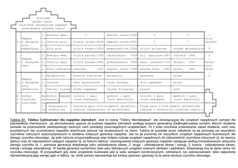 ╔══╗ ╔══╝ ╚══╗ ╔═══╝ ╚═══╗ ╔═══╝ Kierunek ╚═══╗ ╔═══╝ upływu czasu ╚═══╗ ╔══╝ (kierunek udoskonaleń napędów ╚══╗ ╚══╗ spowodowany upływem czasu) ╔══╝ ╠══╤═══════════╤══╤══════════════╬═══════════════════╤═══════════════════╦═══════════════════╤═══════════════════╗ ║ │ │3.│Energia wewn. ║ ? │ wehikuł czasu:2300║ ? │ ? ║ | ║ │Napędy ├──┼──────────────╫───────────────────┼───────────────────╫───────────────────┼───────────────────╢Przy║3.│z obiegiem │2.│Inercja pola ║ silnik teleki:2036│ magnokr.telek:2200║ ? │ ? ║szłośźć ║ │pola ├──┼──────────────╫───────────────────┼───────────────────╫───────────────────┼───────────────────╢ | ║ │magnetyczn.│1.│Siła pola ║ silnik elektr:1836│ magnokraft:ok.2036║ silnik pulsarowy │ statek gwiaździsty║ V ╠══╪═══════════╪══╪══════════════╬═══════════════════╪═══════════════════╬═══════════════════╪═══════════════════╣═════ ║ │ │3.│Energia wewn. ║ silnik parowy:1769│ odrzutowiec: 1939║ sil. spalinow:1867│ rakieta: 1942 ║ Λ ║ │Napędy ├──┼──────────────╫───────────────────┼───────────────────╫───────────────────┼───────────────────╢ | ║2.│z obiegiem │2.│Inercja masy ║ silnik pneuma:1860│ poduszkowiec: 1959║ masz. atmosfe:1712│ śmigło: 1903 ║Teraź║ │masy ├──┼──────────────╫───────────────────┼───────────────────╫───────────────────┼───────────────────╢niej║ │ │1.│Siła ciśnienia║ wiatrak: 1191│ żagiel: około 1390║ puszka Vidi: 1860│ balon: 1863 ║szość ╠══╪═══════════╪══╪══════════════╬═══════════════════╪═══════════════════╬═══════════════════╪═══════════════════╣ | ║ │ │3.│Sprężystość ║ wiertło inercyjne │ katapulta ║ sprężyna │ piłka ║ V ║ │Napędy ├──┼──────────────╫───────────────────┼───────────────────╫───────────────────┼───────────────────╢ ║1.│z obiegiem │2.│Inercja ║ koło garncarskie │ taran bitewny ║ koło zamchowe │ proca ║ ║ │siły ├──┼──────────────╫───────────────────┼───────────────────╫───────────────────┼───────────────────╢ ║ │mechaniczn.│1.│Odział. siłowe║ korba napędowa │ tyczka flisarska ║ kierat │ koło ║╔═╗ ╟──┼───────────┼──┼───────╔══════╩═══════════════════╪═══════════════════╬═══════════════════╪═══════════════════╬╝ ╚═╗ ║E │Rodzaj │Ge│Nośnik ║Napędy│ silniki 1 pary │ pędniki 1 pary ║ silniki 2 pary │ pędniki 2 pary ║ ║ ║r │czynnika │ne│energii║ │ (ruch względny) │ (ruch absolutny) ║ (ruch względny) │ (ruch absolutny) ║ ╚═╗ ║a │roboczego │ra╔═══════╝──────┼───────────────────┴───────────────────╫───────────────────┴───────────────────╢Postęp║ ║ │ │c ║ Rozwiązania │ Pierwsza para silnik-pędnik (przestrz.║ Druga para silnik-pędnik (przestrzeń ║ ╔═╝ ║ │ │ja║ techniczne │ robocza odzdzielona od wytwornika) ║ robocza w wytworniku czynnika robocz.)║ ║ ╚══╧═══════════╧══╩══════════════╧═══════════════════════════════════════╩═══════════════════════════════════════╩╗ ╔═╝ ╚═╝ Tablica B1. Tablica Cykliczności dla napędów ziemskich. Jest to rodzaj "Tablicy Mendelejewa", ale obowiązującej dla urządzeń napędowych zamiast dla pierwiastków chemicznych. Jej sformułowanie ujawnia że budowa napędów 