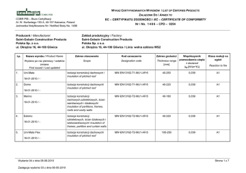 WYKAZ CERTYFIKOWANYCH WYROBÓW / LIST OF CERTIFIED PRODUCTS ZAŁĄCZNIK DO / ANNEX TO COBR PIB – Biuro Certyfikacji Al. W. Korfantego 193 A, 40-157 Katowice, Poland Jednostka Notyfikowana Nr / Notified Body No. 1486 Producent / Manufacturer: Saint-Gobain Construction Products Polska Sp. z o.o. ul. OkręŜna 16, 44-100 Gliwice Lp. 1. Kod oznaczenia Zakres grubości Wydano po raz pierwszy / ostatnia zmiana First issued / Last updated Scope Designation code Uni-Mata Domo Merino 18-01-2010 / - 4. Eskimo 18-01-2010 / - 5. Zakład produkcyjny / Factory: Saint-Gobain Construction Products Polska Sp. z o.o. ul. OkręŜna 16, 44-100 Gliwice / Linia: wełna szklana WS2 Zakres stosowania 18-01-2010 / 3. Nr / No. 1 4 8 6 – CPD – 0254 Nazwa wyrobu / Product Name 18-01-2010 / 2. EC – CERTYFIKATU ZGODNOŚCI / EC – CERTIFICATE OF CONFORMITY Uni-Mata Flex 18-01-2010 / - Wydanie 04 z dnia 08-06-2010 Zastępuje wydanie 03 z dnia 06-05-2010 Thickness range [mm] Współczynnik przewodzenia ciepła λ declared λD [W/(m*K)] Klasa reakcji na ogień Reaction to fire Izolacja konstrukcji dachowych / Insulation of pitched roof MW-EN13162-T1-MU1-AFr5 40-250 0,039 A1 Izolacja konstrukcji dachowych/ Insulation of pitched roof MW-EN13162-T1-MU1-AFr5 40-220 0,039 A1 Izolacja konstrukcji dachowych,szkieletowych, ścian warstwowych i działowych/ Insulation of partitions, frames, roofs and cavity walls MW-EN13162-T2-MU1-AFr5 40-180 0,039 A1 Izolacja konstrukcji szkieletowych, ścian działowych i wielowarstwowych/ Insulation of frames, partition and curtain walls MW-EN13162-T2-MU1-AFr5 40-220 0,039 A1 Izolacja konstrukcji dachowych/ Insulation of pitched roof MW-EN13162-T2-MU1-AFr5 100-250 0,039 A1 Strona 1 z 7 WYKAZ CERTYFIKOWANYCH WYROBÓW / LIST OF CERTIFIED PRODUCTS ZAŁĄCZNIK DO / ANNEX TO COBR PIB – Biuro Certyfikacji Al. W. Korfantego 193 A, 40-157 Katowice, Poland Jednostka Notyfikowana Nr / Notified Body No. 1486 Lp. 6. Zakres grubości Wydano po raz pierwszy / ostatnia zmiana First issued / Last updated Scope Designation code Domo Flex Uni-Mata Komfort Domo Comfort Akusto 18-01-2010 / - 10. Akuplat 18-01-2010 / - 11. Aku-Płyta 18-01-2010 / - 12. Klasa reakcji na ogień Kod oznaczenia 18-01-2010 / 9. Thickness range [mm] Współczynnik przewodzenia ciepła λ declared λD [W/(m*K)] Zakres stosowania 18-01-2010 / 8. Nr / No. 1 4 8 6 – CPD – 0254 Nazwa wyrobu / Product Name 18-01-2010 / 7. EC – CERTYFIKATU ZGODNOŚCI / EC – CERTIFICATE OF CONFORMITY KL 37 18-01-2010 / - Wydanie 04 z dnia 08-06-2010 Zastępuje wydanie 03 z dnia 06-05-2010 Reaction to fire Izolacja konstrukcji dachowych/ Insulation of pitched roof MW-EN13162-T2-MU1-AFr5 100-250 0,039 A1 Izolacja konstrukcji dachowych/ Insulation of pitched roof MW-EN13162-T2-MU1- AFr5 100-200 0,039 A2-s1,d0 Izolacja konstrukcji dachowych/ Insulation of pitched roof MW-EN13162-T2-MU1- AFr5 100-200 0,039 A2-s1,d0 Izolacja konstrukcji dachowych/ Insulation of pitched roof MW-EN13162-T1-MU1-AFr5 40-220 0,039 A1 Izolacja konstrukcji dachowych, ścian działowych i obudów hal/ Insulation for roofs, partitions and industrial claddings MW-EN13162-T2-MU1- AFr5 40-180 0,037 A1 Izolacja konstrukcji dachowych, ścian działowych i obudów hal/ Insulation for roofs, partitions & industrial claddings MW-EN13162-T2-MU1-AW0,90-AFr5 50 - 74 0,037 A1 Izolacja konstrukcji dachowych, ścian działowych i obudów hal/ Insulation for roofs, partitions & industrial claddings MW-EN13162-T2-MU1-AW0,90-AFr5 50 - 74 0,037 A1 Strona 2 z 7 WYKAZ CERTYFIKOWANYCH WYROBÓW / LIST OF CERTIFIED PRODUCTS ZAŁĄCZNIK DO / ANNEX TO COBR PIB – Biuro Certyfikacji Al. W. Korfantego 193 A, 40-157 Katowice, Poland Jednostka Notyfikowana Nr / Notified Body No. 1486 Lp. 13. Nr / No. 1 4 8 6 – CPD – 0254 Nazwa wyrobu / Product Name Zakres stosowania Kod oznaczenia Zakres grubości Wydano po raz pierwszy / ostatnia zmiana First issued / Last updated Scope Designation code Aku-Płyta 18-01-2010 / - 14. EC – CERTYFIKATU ZGODNOŚCI / EC – CERTIFICATE OF CONFORMITY KL 37 18-01-2010 / - Thickness range [mm] Współczynnik przewodzenia ciepła λ declared λD [W/(m*K)] Klasa reakcji na ogień Reaction to fire Izolacja konstrukcji dachowych, ścian działowych i obudów hal / Insulation for roofs, partitions & industrial claddings MW-EN13162-T2-MU1-AW1-AFr5 75 - 180 0,037 A1 Izolacja konstrukcji dachowych, ścian działowych i obudów hal / Insulation for roofs, partitions & industrial claddings MW-EN13162-T2-MU1-AW1-AFr5 75 -180 0,037 A1 15. Piano 08-06-2010 / - Lekkie konstrukcje szkieletowe, ściany działowe, ściany wielowarstwowe / Frames, partition&curtain walls MW-EN13162-T2-MU1 -AFr5 40 - 200 0,037 A1 16. Isophen 08-06-2010 / - Lekkie konstrukcje szkieletowe, ściany działowe, ściany wielowarstwowe / Frames, partition&curtain walls MW-EN13162-T2-MU1-AFr5 40 - 200 0,037 A1 17. Uniroll Classic 08-06-2010 / - Lekkie konstrukcje szkieletowe, ściany działowe, ściany wielowarstwowe / Frames, partition&curtain walls MW-EN13162-T2-MU1-AFr5 40 - 200 0,037 A1 18. Super-Mata Izolacja konstrukcji dachowych i szkieletowych/ Insulation of pitched roof and frames MW-EN13162-T2-MU1-AFr5 50-180 0,033 A1 18-01-2010 / - Wydanie 04 z dnia 08-06-2010 Zastępuje wydanie 03 z dnia 06-05-2010 Strona 3 z 7 WYKAZ CERTYFIKOWANYCH WYROBÓW / LIST OF CERTIFIED PRODUCTS ZAŁĄCZNIK DO / ANNEX TO COBR PIB – Biuro Certyfikacji Al. W. Korfantego 193 A, 40-157 Katowice, Poland Jednostka Notyfikowana Nr / Notified Body No. 1486 Lp. 19. Zakres grubości Wydano po raz pierwszy / ostatnia zmiana First issued / Last updated Scope Designation code Unirol Profi Sonic-Mata Deska Dachowa Twist 18-01-2010 / - 23. Twist 18-01-2010 / - 24. Klasa reakcji na ogień Kod oznaczenia 18-01-2010 / 22. Thickness range [mm] Współczynnik przewodzenia ciepła λ declared λD [W/(m*K)] Zakres stosowania 18-01-2010 / 21. Nr / No. 1 4 8 6 – CPD – 0254 Nazwa wyrobu / Product Name 18-01-2010 / 20. EC – CERTYFIKATU ZGODNO