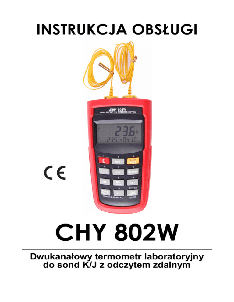INSTRUKCJA OBSŁUGI CHY 802W Dwukanałowy termometr laboratoryjny do sond K/J z odczytem zdalnym WPROWADZENIE CHY802W to 5-cyfrowy, kompaktowy, przenośny przyrząd pomiarowy przeznaczony do współpracy z zewnętrznymi czujnikami temperatury - termoparami typu K i J. Wskazania temperatury są zgodne z tabelą charakterystyk temperaturowych Temperatura/Napięcie (zgodną z ITS-90) dla termopar typu K i J. Urządzenie dostarczane jest w komplecie z dwoma sondami typu K. INFORMACJE DOTYCZĄCE BEZPIECZEŃSTWA Przed użyciem termometru należy przeczytać poniższe informacje. OSTRZEŻENIE ! Aby uniknąć porażenia prądem nie należy używać miernika, jeżeli napięcie pracy występujące na mierzonej powierzchni przekracza 24V AC/DC. OSTRZEŻENIE ! Aby uniknąć zniszczenia lub zapłonu nie wolno dokonywać pomiarów w kuchenkach mikrofalowych. UWAGA ! Częste zaginanie przewodów sond może doprowadzić do przerwania ich ciągłości – sonda stanie się bezużyteczna. Należy zatem unikać zaginania przewodów zwłaszcza w pobliżu wtyku sondy. UWAGA ! Ponieważ urządzenie to generuje i odbiera energię o częstotliwości radiowej, jeśli stosowane niezgodnie z instrukcją, może powodować znaczne zakłócenia sygnałów o częstotliwościach radiowych. Istnieje prawdopodobieństwo, że urządzenie to może powodować zakłócanie pracy odbiorników RTV, co może być spowodowane włączaniem i wyłączaniem miernika – użytkownik powinien powziąć działania jak poniżej: przestawić lub zmienić położenie anteny odbiorczej zwiększyć odległość między urządzeniem a zakłócanym sprzętem sprawdzić ekranowanie anten urządzeń RTV Minimalna odległość między miernikiem a odbiornikiem podłączonym do komputera powinna wynosić przynajmniej 40cm. -2- SPECYFIKACJA ELEKTRYCZNA Skala temperatury: Zakres pomiarowy: Celsjusza lub Fahrenheita – wybierana Typ J: -200°C ÷ 1050°C, (-328°F ÷ 1922°F) Typ K: -200°C ÷ 1370°C, (-328°F ÷ 2498°F) Rozdzielczość: 0,1°C lub 0,2°F Dokładność: jest określona dla temperatury pracy 18°C ÷ 28°C (64°F ÷ 82°F) na okres 1 roku wyłączając błędu termopary i wynosi: ±( 0,05% wart. wskaz. + 0,3°C) dla -50°C ÷ 1370°C ±( 0,05% wart. wskaz. + 0,7°C) dla -200°C ÷ -50°C ±( 0,05% wart. wskaz. + 0,6°F) dla -58°F ÷ 2498°F ±( 0,05% wart. wskaz. + 0,7°F) dla -328°F ÷ -58°F Współczynnik temp.: 0,1 x odpowiednia dokładność zgodnie ze specyfikacją na °C dla 0°C ÷ 18°C oraz 28°C ÷ 50°C (32°F ÷ 64°F oraz 82°F ÷ 122°F). Zabezpieczenia wejść: 24V DC lub 24V AC RMS – maksymalne napięcie wejściowe w dowolnej kombinacji gniazd wejściowych. Maksymalne napięcie różnicowe napięcie wspólne (Napięcie pomiędzy T1 i T2 podczas pomiarów:1V Gniazdo wejściowe: Dostosowane do standardowych wtyków stosowanych przy miniaturowych termoparach (płaskie konektory w odległości między ich środkami 7,9mm). SPECYFIKACJA OGÓLNA I ŚRODOWISKOWA Wyświetlacz: LCD - główny 5 cyfr + drugi 5 cyfr + trzeci MM:SS z podświetleniem Próbkowanie: 1 raz /s Sygnalizacja przekroczenia zakresu: wyświetlane wskazanie: ‘’----.-‘’ lub ‘’OL’’ Zasilanie: 6V DC: 4x bateria 1,5V LR03 (AAA) Żywotność baterii: średnio 190 godzin Automatyczne wył.: po 30 min bezczynności. Powrót do pomiarów po wciśnięciu „POWER” Wymiary (szer x gł x wys): 83 x 38 x 160 [mm] Masa: ok.270g (z bateriami) Dołączona sonda: Typ K, ok.1,2m długości, w izolacji teflonowej. Max temp. izolacji 260ºC (500 ºF). Dokładność dla sondy: ±2,2°C lub ±0,75% wart. wskaz. (w zależności, która wartość jest większa) w zakresie 0°C ÷ 1050°C Temperatura pracy: 0°C ÷ 50°C, (32°F ÷ 122°F), <80% wilg.wzgl.(R.H) Temperatura przechowywania: -20°C ÷ 60°C, (-4°F ÷ 140°F), <70% wilg.wzgl.(R.H.) Komunikacja bezprzewodowa: Zakres częstotliwości: 910~920MHz -3- WIDOK OGÓLNY MIERNIKA OBSLUGA MIERNIKA 1. Przycisk WŁĄCZENIA - WYŁĄCZENIA Przycisk ten włącza oraz wyłącza miernik. Jeżeli termometr znajduje się w trybie SET nie jest możliwe wyłączenie miernika. Aby wyłączyć termometr należy opuścić tryb SET. Funkcja APO: Nacisnąć i przytrzymać przycisk przez więcej niż 6s w celu zignorowania funkcji autowyłączenia. Na LCD pojawi się APO-OFF 2.‘’°C/°F’’ Wybór skali temperatury Odczyt z wyświetlacza jest możliwy zarówno w stopniach Celsjusza (°C) jak i Fahrenheita (°F). Po włączeniu miernika wyświetlana jest automatycznie skala, która była ustawiona przy poprzednim użytkowaniu termometru. Aby zmienić skalę nalezy naciskąć przycisk ‘’°C/°F’’. 3. „ ” Tryb HOLD (tylko główny wyświetlacz) Aby uaktywnić lub deaktywować funkcję HOLD należy nacisnąć przycisk „ ”. W tym trybie miernik zatrzymuje na wyświetlaczu bieżący wynik i wstrzymuje wykonywanie pomiarów. W trybie rejestrowania MAX/MIN wciśnięcie przycisku „HOLD” spowoduje -4- zatrzymanie rejestracji – aby powrócić do trybu rejestracji należy ponownie nacisnąć „ ” (poprzednie odczyty nie zostaną skasowane). Podświetlenie Wciśnięcie przycisku „ ” przez ponad 2s włącza lub wyłącza podświetlenie wyświetlacza. Podświetlenie wyłącza się automatycznie po ok.30s. 4. ‘’T1 T2/T1-T2’’, (wyświetlacz główny - selekcja gniazd wejściowych) Selekcja wejść wskazuje, z którego wejścia (z której sondy) dokonywany jest odczyt temperatury na wyświetlaczu głównym: T1, T2 czy pomiar różnicowy (T1-T2). Po włączeniu miernik automatycznie dokonuje odczytu z wejścia T1. 5. ‘’K/J’’ wybór typu sondy – wskazania głównego wyświetlacza Przycisk „K/J” służy do wyboru typu sondy K lub J podłączonej do wejścia T1, gdy główny wyświetlacz wskazuje odczyt z tego wejścia. Gdy włączymy termometer ustawiony jest on na typie sondy, która została wybrana przed wyłączeniem miernika. 6. ‘’MAX/MIN’’ z rejestracją czasu wystąpi