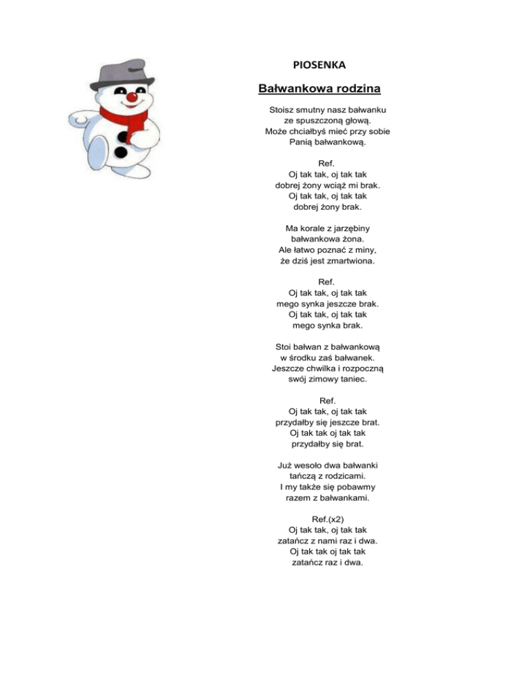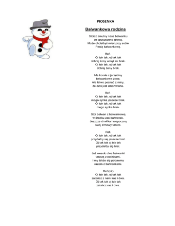 PIOSENKA Bałwankowa rodzina Stoisz smutny nasz bałwanku ze spuszczoną głową. Może chciałbyś mieć przy sobie Panią bałwankową. Ref. Oj tak tak, oj tak tak dobrej żony wciąż mi brak. Oj tak tak, oj tak tak dobrej żony brak. Ma korale z jarzębiny bałwankowa żona. Ale łatwo poznać z miny, że dziś jest zmartwiona. Ref. Oj tak tak, oj tak tak mego synka jeszcze brak. Oj tak tak, oj tak tak mego synka brak. Stoi bałwan z bałwankową w środku zaś bałwanek. Jeszcze chwilka i rozpoczną swój zimowy taniec. Ref. Oj tak tak, oj tak tak przydałby się jeszcze brat. Oj tak tak oj tak tak przydałby się brat. Już wesoło dwa bałwanki tańczą z rodzicami. I my także się pobawmy razem z bałwankami. Ref.(x2) Oj tak tak, oj tak tak zatańcz z nami raz i dwa. Oj tak tak oj tak tak zatańcz raz i dwa.
