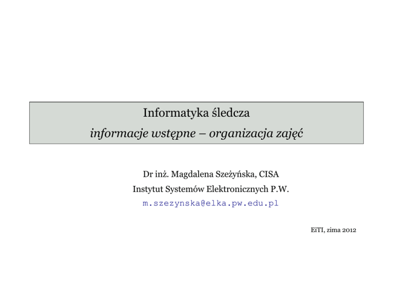 Informatyka śledcza informacje wstępne – organizacja zajęć Dr inż. Magdalena Szeżyńska, CISA Instytut Systemów Elektronicznych P.W. [email protected] EiTI, zima 2012 Informatyka śledcza ● ● ● Zajęcia prowadzone w formie wykładu połączonego z laboratorium poświęcone są informatyce śledczej, tzn. procesowi identyfikowania, zabezpieczania, analizowania i prezentowania dowodów elektronicznych w sposób umożliwiający dopuszczenie ich w postępowaniu sądowym. Celem zajęć jest dostarczenie słuchaczom podstawowej wiedzy niezbędnej do realizacji rzetelnych praktyk informatyki śledczej. Zajęcia laboratoryjne wykorzystują umiejętności techniczne nabyte w toku przedmiotów zalecanych jako poprzedniki i rozwijają je w kontekście informatyki śledczej, a dobre rozumienie możliwości technik śledczych zwiększa świadomość zagrożeń bezpieczeństwa systemów informatycznych. Informatyka śledcza - w01a - informacje wstępne 2 Program przedmiotu ● ● ● Wprowadzenie podstawowych koncepcji informatyki śledczej - definicje, potrzeby, wymagania, podstawy prawne, aspekty etyczne; główne fazy śledztwa informatycznego – przygotowanie przypadku, rozpoczęcie śledztwa, przeprowadzenie przykładowego badania, analiza przypadku, sporządzanie dokumentacji. Informatyka śledcza a bezpieczeństwo informacji (bezpieczeństwo systemów informatycznych) – reakcja na incydenty z zakresu bezpieczeństwa informacji, aspekty prawne i regulacyjne, skuteczność dochodzenia, analiza dowodów. Identyfikacja elektronicznych dowodów winy, zabezpieczanie dowodów na miejscu przestępstwa i w laboratorium badawczym, katalogowanie i przechowywanie dowodów, zabezpieczanie dowodów (zapewnienie ich integralności, wiarygodności poufności itp.) oraz prezentacja wniosków z informatycznego śledztwa. Informatyka śledcza - w01a - informacje wstępne 3 Program przedmiotu ● ● ● Narzędzia pracy informatycznego śledczego (TCT, Sleuthkit, Autopsy, specjalizowane dystrybucje Linuxa, rozwiązania przeznaczone na inne platformy i komercyjne, techniki eDiscovery). Wirtualizacja w służbie informatyki śledczej. Procesy uruchamiania (booting) systemów, dyski startowe, partycje rozruchowe, sektory i programy ładujące, tworzenie obrazów uruchomieniowych CD/DVD i USB oraz wykorzystywanie płyt CD/DVD i dysków USB w celu nieinwazyjnego dostępu do badanego systemu. Informatyka śledcza - w01a - informacje wstępne 4 Program przedmiotu ● ● ● ● ● Systemy plików FAT, NTFS/NTFS5, EXT2/EXT3, USF1/USF2 itp.specyfikacje, struktury danych, specyficzne techniki badania. Rozpoznawanie typów, rekonstrukcja i analiza zawartości plików zawierających potencjalne dowody, interpretacja dzienników zdarzeń aplikacji i logów systemowych, dowodzenie zaistnienia włamania. Pozyskiwanie i analiza dowodów z urządzeń mobilnych. Badanie systemów czynnych (live systems: Windows, Unix/Linux) oraz ruchu sieciowego, poszukiwanie dowodów w Internecie, techniki eDiscovery. Przypadki prawdziwe - case studies. Informatyka śledcza - w01a - informacje wstępne 5 Program przedmiotu - laboratoria ● ● ● Zapoznanie się ze stacją roboczą i oprogramowaniem informatycznego śledczego, analiza obrazu dysku typu pendrive, odzyskiwanie skasowanych i nadpisanych plików – tutorial. Zabezpieczanie dowodów, tj. samodzielne wykonywanie obrazów dysków z zapewnieniem ich integralności poprzez obliczanie skrótów przy wykorzystaniu dedykowanej dystrybucji Linuxa, tworzenie i analiza obrazów zawierających system plików FAT i poszukiwanie ukrytych w nich dowodów. Tworzenie obrazu systemu plików NTFS, jego analiza i poszukiwanie ukrytych w nim dowodów przy pomocy narzędzi dostępnych w środowiskach Linux i Windows, odtwarzanie sekwencji zdarzeń – timelines. Informatyka śledcza - w01a - informacje wstępne 6 Program przedmiotu - laboratoria Wariantowo (2 z 4) ● ● ● ● Przeprowadzenie analizy powłamaniowej systemu Linux (na podstawie dostarczonego obrazu systemu). Analiza materiału dowodowego pochodzącego z telefonu komórkowego (na podstawie dostarczonego obrazu karty). Wstęp do analizy Windows (czyli wszystko jest w rejestrze). Prowadzenie śledztwa w sieci – poszukiwanie źródeł dowodów dot. funkcjonowania grup przestępczych np. na przykładzie internetowego serwisu inwestycyjnego typu HYIP. Informatyka śledcza - w01a - informacje wstępne 7 Narzędzia i literatura ● Polecane narzędzia: http://studia.elka.pw.edu.pl/pub/12Z/ISL.A/tools.html ● Literatura: http://studia.elka.pw.edu.pl/pub/12Z/ISL.A/books.html Informatyka śledcza - w01a - informacje wstępne 8 Computer Forensic Analysis Class W sierpniu 1999r. w IBM T.J. Watson Research Center (Yorktown Heights, NY, USA) odbyło się seminarium , podczas którego Dan Farmer (Earthlink) i Wietse Venema (IBM) poprowadzili całodniowe warsztaty poświęcone analizie powłamaniowej systemów uniksowych. Na stronie http://www.porcupine.org/forensics/ dostępne są: ● materiały wykładowe z 1999r., ● podręcznik „Forensic Discovery” oraz ● Informatyka śledcza - w01a - informacje wstępne The Coroner's Toolkit (TCT) – zestaw narzędzi prezentowany na seminarium i wykorzystywany w ćwiczeniach opisanych w podręczniku. 9 Organizacja zajęć ● Szczegółowy harmonogram zajęć (terminy wykładów i laboratoriów, terminy kolokwiów) będzie dostępny na stronie przedmiotu http://studia.elka.pw.edu.pl/pub/12Z/ISL.A/ ● Na stronie przedmiotu będą sukcesywnie udostępniane materiały dydaktyczne (materiały wykładowe, instrukcje laboratoryjne, kryteria ocen, niezbędne formularze – po zalogowaniu na https://studia.elka.pw.edu.pl/priv/12Z/ISL.A/) oraz inne ważne informacje, w tym bieżące komunikaty. Informatyka śledcza - w01a - informacje wstępne 10 Regulamin zaliczenia przedmiotu ● ● ● ● Wykłady: Dwa testy (bez notatek) w połowie i na koniec semestru (po 25 punktów). 3 dodatkowe 
