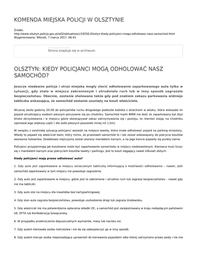 KOMENDA MIEJSKA POLICJI W OLSZTYNIE Źródło: http://www.olsztyn.policja.gov.pl/o02/aktualnosci/19250,Olsztyn-Kiedy-policjanci-moga-odholowac-nasz-samochod.html Wygenerowano: Wtorek, 7 marca 2017, 06:41 Strona znajduje się w archiwum. OLSZTYN: KIEDY POLICJANCI MOGĄ ODHOLOWAĆ NASZ SAMOCHÓD? Jeszcze niedawno policja i straż miejska mogły zlecić odholowanie zaparkowanego auta tylko w sytuacji, gdy stało w miejscu zabronionym i utrudniało ruch lub w inny sposób zagrażało bezpieczeństwu. Obecnie, zostanie sholowane także gdy pod znakiem zakazu parkowania widnieje tabliczka wskazująca, że samochód zostanie usunięty na koszt właściciela. Wczoraj około godziny 20.00 do policjantów ruchu drogowego podeszła kobieta z dzieckiem w wózku, która wskazała im pojazd utrudniajacy osobom pieszym poruszanie się po chodniku. Samochód marki BMW nie dość że zaparkowany był zbyt blisko skrzyżowania i w miejscu gdzie obowiązywał zakaz zatrzymywania się i postoju, to również stojąc na chodniku zajmował jego większą część ( dla osób pieszych pozostało mniej niż 1,5m). W związku z zaistniałą sytuacją policjanci wezwali na miejsce lawetę, która miała odholować pojazd na parking strzeżony. Wtedy to pojawił się właściciel bwm, który mimo, że przestawił samochód to i tak został zobowiązany do pokrycia kosztów wezwania holownika. Dodatkowo mężczyzna został ukarany mandatem karnym, a na jego koncie pojawiły się punkty karne. Policjanci przypaminają jak kosztowne może być zaparkowanie samochodu w miejscu niedozwolonym. Kierowca musi liczyc się z mandatem karnym oraz pokryciem kosztów lawety i parkingu. Jest to koszt sięgający nawet kilkuset złotych. Kiedy policjanci mają prawo odholować auto? 1. Gdy auto jest zaparkowane w miejscu oznaczonym tabliczką informującą o możliwości odholowania – nawet, jeśli samochód zaparkowany w tym miejscu nie powoduje zagrożenia. 2. Gdy auto jest zaparkowane w miejscu, gdzie jest to zabronione i utrudnia ruch lub zagraża bezpieczeństwu – nawet gdy nie ma tabliczki. 3. Gdy auto stoi na miejscu dla inwalidów bez kartyparkingowej. 4. Gdy stan auta zagraża bezpieczeństwu, powoduje uszkodzenie drogi lub zagraża środowisku. 5. Gdy właściciel nie ma potwierdzenia opłacenia składki OC, a samochód jest zarejestrowany w kraju niebędącym państwem UE, EFTA lub Konfederacją Szwajcarską. 6. W przypadku przekroczenia dopuszczalnych wymiarów, masy lub nacisku osi. 7. Gdy autem kierowała osoba nietrzeźwa i nie da się zabezpieczyć go w inny sposób. 8. Gdy autem kieruje osoba nieposiadająca uprawnień do kierowania pojazdami albo której zatrzymano prawo jazdy i nie ma możliwości zabezpieczenia pojazdu poprzez przekazanie go innej osobie. mp Ocena: 0/5 (0) Tweetnij