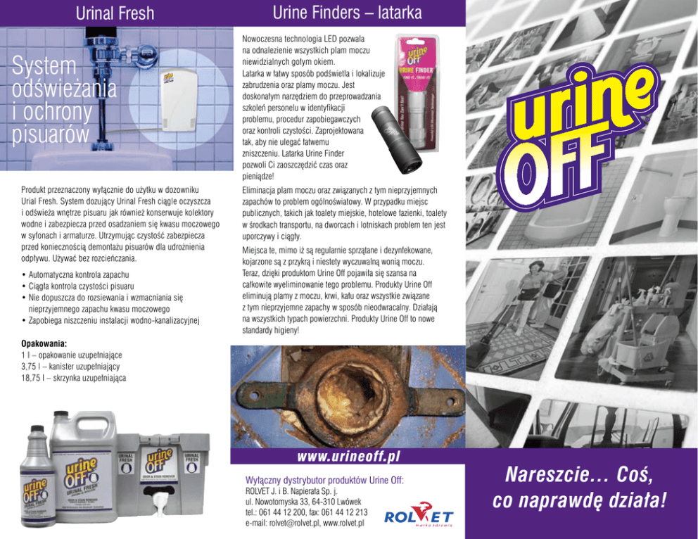 Urinal Fresh System odświeżania i ochrony pisuarów Produkt przeznaczony wyłącznie do użytku w dozowniku Urial Fresh. System dozujący Urinal Fresh ciągle oczyszcza i odświeża wnętrze pisuaru jak również konserwuje kolektory wodne i zabezpiecza przed osadzaniem się kwasu moczowego w syfonach i armaturze. Utrzymując czystość zabezpiecza przed koniecznością demontażu pisuarów dla udrożnienia odpływu. Używać bez rozcieńczania. • Automatyczna kontrola zapachu • Ciągła kontrola czystości pisuaru • Nie dopuszcza do rozsiewania i wzmacniania się nieprzyjemnego zapachu kwasu moczowego • Zapobiega niszczeniu instalacji wodno-kanalizacyjnej Urine Finders – latarka Nowoczesna technologia LED pozwala na odnalezienie wszystkich plam moczu niewidzialnych gołym okiem. Latarka w łatwy sposób podświetla i lokalizuje zabrudzenia oraz plamy moczu. Jest doskonałym narzędziem do przeprowadzania szkoleń personelu w identyfikacji problemu, procedur zapobiegawczych oraz kontroli czystości. Zaprojektowana tak, aby nie ulegać łatwemu zniszczeniu. Latarka Urine Finder pozwoli Ci zaoszczędzić czas oraz pieniądze! Eliminacja plam moczu oraz związanych z tym nieprzyjemnych zapachów to problem ogólnoświatowy. W przypadku miejsc publicznych, takich jak toalety miejskie, hotelowe łazienki, toalety w środkach transportu, na dworcach i lotniskach problem ten jest uporczywy i ciągły. Miejsca te, mimo iż są regularnie sprzątane i dezynfekowane, kojarzone są z przykrą i niestety wyczuwalną wonią moczu. Teraz, dzięki produktom Urine Off pojawiła się szansa na całkowite wyeliminowanie tego problemu. Produkty Urine Off eliminują plamy z moczu, krwi, kału oraz wszystkie związane z tym nieprzyjemne zapachy w sposób nieodwracalny. Działają na wszystkich typach powierzchni. Produkty Urine Off to nowe standardy higieny! Opakowania: 1 l – opakowanie uzupełniające 3,75 l – kanister uzupełniający 18,75 l – skrzynka uzupełniająca www.urineoff.pl Wyłączny dystrybutor produktów Urine Off: ROLVET J. i B. Napierała Sp. j. ul. Nowotomyska 33, 64-310 Lwówek tel.: 061 44 12 200, fax: 061 44 12 213 e-mail: [email protected], www.rolvet.pl Nareszcie… Coś, co naprawdę działa! Linia do czyszczenia łazienek i toalet Urine Off działa na wszystkich powierzchniach w łazience. Dzięki wykorzystaniu specjalnych enzymów i bakterii rozkłada składniki moczu i innych wydalin ciała, które powodują powstawanie nieprzyjemnego zapachu i trwałych plam. Powoduje rozkład białek, które stanowią pożywkę dla rozwoju niepożądanych mikroorganizmów. Usuwa skutecznie również i inne brudy występujące w łazience. Produkt przeznaczony do profesjonalnego stosowania. Używać bez rozcieńczania. Linia wielozadaniowa Linia do tkanin przed praniem Wielozadaniowy Urine Off działa na gładkich i porowatych powierzchniach. Dzięki wykorzystaniu specjalnych enzymów i bakterii rozkłada składniki moczu i innych wydalin ciała, które powodują powstawanie nieprzyjemnego zapachu i trwałych plam. Powoduje rozkład białek, które stanowią pożywkę dla rozwoju niepożądanych mikroorganizmów. Poprzez eliminację przy pomocy produktów Urine Off plam i zabrudzeń moczu oraz innych wydzielin pochodzenia organicznego z bielizny pościelowej, koców bądź narzut w znacznym stopniu przyczyniamy się do kreowania pozytywnego wizerunku oraz w widoczny sposób poprawiamy samopoczucie klientów. Produkt przeznaczony do profesjonalnego stosowania. Używać bez rozcieńczania. Urine Off do tkanin przed praniem, przeznaczony jest do stosowania na wszystkich rodzajach włókien. Dzięki wykorzystaniu specjalnych enzymów i bakterii rozkłada składniki moczu i innych wydalin ciała, które powodują powstawanie nieprzyjemnego zapachu i trwałych plam. Powoduje też rozkład białek, które stanowią pożywkę dla rozwoju niepożądanych mikroorganizmów. • Jeden produkt zastępuje wszystkie inne preparaty • Rzeczywiście eliminuje plamy moczu oraz nieprzyjemne zapachy • Działa doskonale również na wszystkich powierzchniach • Działa na wszystkich powierzchniach • Doskonale usuwa plamy i nieprzyjemne zapachy pochodzenia organicznego z dywanów i wykładzin • Posiada certyfikat Amerykańskiego Instytutu Koców i Dywanów Opakowania: 1 l – butelka 3,75 l – kanister uzupełniający 18,75 l – skrzynka uzupełniająca Opakowania: 1 l – butelka 3,75 l – kanister uzupełniający 18,75 l – skrzynka uzupełniająca Produkt przeznaczony do profesjonalnego stosowania. Używać bez rozcieńczania. • Usuwa większość plam i nieprzyjemnych zapachów pochodzenia organicznego •R edukuje konieczność dodatkowego użycia silnych środków piorących Opakowania: 1 l – butelka 3,75 l – kanister uzupełniający 18,75 l – skrzynka uzupełniająca Więcej informacji o produktach na stronie: www.urineoff.pl Produkty Urine-Off stosują wysoko zaawansowaną technologię bioenzymatyczną, która całkowicie eliminuje plamy i zapachy moczu