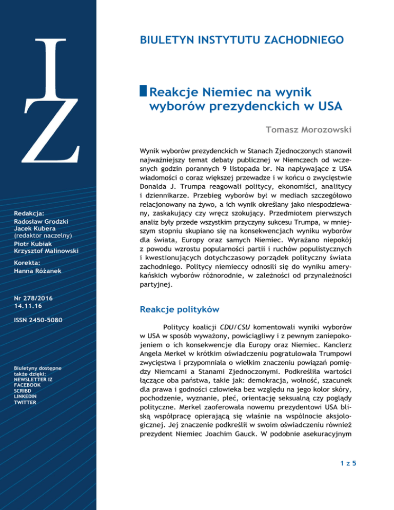 BIULETYN INSTYTUTU ZACHODNIEGO Reakcje Niemiec na wynik wyborów prezydenckich w USA Tomasz Morozowski Redakcja: Radosław Grodzki Jacek Kubera (redaktor naczelny) Piotr Kubiak Krzysztof Malinowski Korekta: Hanna Różanek Nr 278/2016 14.11.16 ISSN 2450-5080 Biuletyny dostępne także dzięki: NEWSLETTER IZ FACEBOOK SCRIBD LINKEDIN TWITTER Wynik wyborów prezydenckich w Stanach Zjednoczonych stanowił najważniejszy temat debaty publicznej w Niemczech od wczesnych godzin porannych 9 listopada br. Na napływające z USA wiadomości o coraz większej przewadze i w końcu o zwycięstwie Donalda J. Trumpa reagowali politycy, ekonomiści, analitycy i dziennikarze. Przebieg wyborów był w mediach szczegółowo relacjonowany na żywo, a ich wynik określany jako niespodziewany, zaskakujący czy wręcz szokujący. Przedmiotem pierwszych analiz były przede wszystkim przyczyny sukcesu Trumpa, w mniejszym stopniu skupiano się na konsekwencjach wyniku wyborów dla świata, Europy oraz samych Niemiec. Wyrażano niepokój z powodu wzrostu popularności partii i ruchów populistycznych i kwestionujących dotychczasowy porządek polityczny świata zachodniego. Politycy niemieccy odnosili się do wyniku amerykańskich wyborów różnorodnie, w zależności od przynależności partyjnej. Reakcje polityków Politycy koalicji CDU/CSU komentowali wyniki wyborów w USA w sposób wyważony, powściągliwy i z pewnym zaniepokojeniem o ich konsekwencje dla Europy oraz Niemiec. Kanclerz Angela Merkel w krótkim oświadczeniu pogratulowała Trumpowi zwycięstwa i przypomniała o wielkim znaczeniu powiązań pomiędzy Niemcami a Stanami Zjednoczonymi. Podkreśliła wartości łączące oba państwa, takie jak: demokracja, wolność, szacunek dla prawa i godności człowieka bez względu na jego kolor skóry, pochodzenie, wyznanie, płeć, orientację seksualną czy poglądy polityczne. Merkel zaoferowała nowemu prezydentowi USA bliską współpracę opierającą się właśnie na wspólnocie aksjologicznej. Jej znaczenie podkreślił w swoim oświadczeniu również prezydent Niemiec Joachim Gauck. W podobnie asekuracyjnym 1z5 tonie wypowiadali się inni politycy frakcji CDU/CSU. Jej przewodniczący, Volker Kauder, podkreślił wagę partnerstwa transatlantyckiego dla Niemiec i Europy oraz wyraził nadzieję na dalsze wypełnianie przez USA swojej kluczowej dla świata roli. Peter Tauber i Jürgen Hardt (CDU) deklarowali nastawienie Niemiec na dalszą partnerską współpracę transatlantycką. Przewodniczący CSU Horst Seehofer pokreślił odpowiedzialność spoczywającą w dobie współczesnych globalnych wyzwań i zagrożeń na nowym prezydencie USA. Minister finansów Wolfgang Schäuble (CDU) wyraził dodatkowo zaniepokojenie ogólnym kierunkiem debaty politycznej w świecie zachodnim, również w Niemczech. Obawy przed dalszym wzrostem populizmu, czyli „efektem Trumpa”, także w RFN, przedstawił Hans-Peter Friedrich (CSU). W sposób bardziej bezpośredni wyniki wyborów skomentowała minister obrony Ursula von der Leyen (CDU), która przyznała, że po ich ogłoszeniu była „w ciężkim szoku”, a ich rezultat uznała bardziej za wybór przeciwko Waszyngtonowi i establishmentowi niż za kandydatem Partii Republikańskiej. Jak zauważyła, w nowych okolicznościach Europa będzie musiała nastawić się na większą samodzielność w kwestii bezpieczeństwa. Politycy partii koalicyjnej SPD reagowali w sposób mniej wyważony, nie kryjąc zaskoczenia i rozczarowania wynikiem amerykańskich wyborów. Minister spraw zagranicznych Frank-Walter Steinmeier przyznał, że Niemcy w większości życzyliby sobie innego rezultatu, jednak należy uszanować decyzję Amerykanów. Ze względu na treść kampanii wyborczej Trumpa, Steinmeier wyraził niepewność co do dalszego kierunku polityki zagranicznej USA, którego zmiana może prowadzić do zawirowań w stosunkach międzynarodowych. Przewodniczący SPD Sigmar Gabriel w ostrych słowach określił przyszłego prezydenta USA jako „pioniera nowych, autorytarnych i szowinistycznych przywódców międzynarodowych”. Wymieniając również europejskich polityków populistycznych, zarzucił im wykorzystywanie do celów wyborczych nierówności społecznych, obaw przed imigracją oraz dystansu dzielącego społeczeństwa od elit politycznych. Inni politycy SPD opisywali wynik wyborów jako szok i sygnał alarmowy dla świata (Heiko Maas, Hannelore Kraft) i wyrażali zaniepokojenie ich konsekwencjami dla Europy i Niemiec (Niels Annen). Członkowie koalicji rządzącej CDU/CSU i SPD krytykowali samą kampanię wyborczą w Stanach Zjednoczonych. Ze względu na jej zaciekłość i gwałtowność przestrzegali przed przeniesieniem podobnych praktyk na grunt europejski oraz niemiecki, szczególnie w obliczu przyszłorocznych wyborów w Niemczech oraz we Francji. Wśród najważniejszych wyzwań stojących przed prezydentem-elektem wymieniali konieczność ponownego zjednoczenia głęboko podzielonego społeczeństwa amerykańskiego oraz uszanowanie partnerstwa transatlantyckiego jako filaru międzynarodowego systemu bezpieczeństwa. W ich komentarzach wyraźna była niepewność co do przyszłego kształtu relacji niemiecko-amerykańskich ze względu na treść kampanii wyborczej i brak dokładnego programu polityki zagranicznej przyszłego prezydenta USA. Politycy opozycyjnych partii Die Linke oraz Sojuszu’90/Zielonych reagowali na zwycięstwo Trumpa negatywnie i w sposób emocjonalny. Wśród ich wypowiedzi i komentarzy w mediach społecznościowych powtarzały się określenia takie, jak „szok”, „czarny dzień dla Ameryki i świata” czy „wyłom w tradycji oparcia Zachodu na liberalnych wartościach”. Według przewodniczącego Die Linke Bernda Riexingera, USA po wyborach znalazły się „na drodze do społeczeństwa autorytarnego”. 2z5 Członkowie pozaparlamentarnej, jednak zyskującej na poparciu partii Alternatywa dla Niemiec (Alternative für D