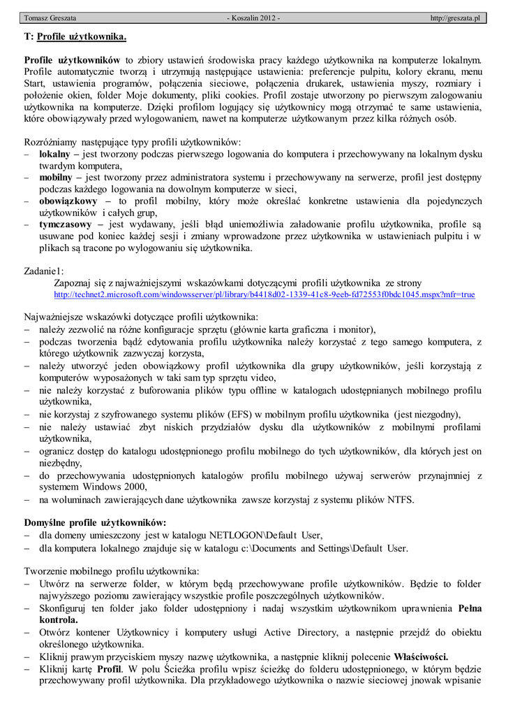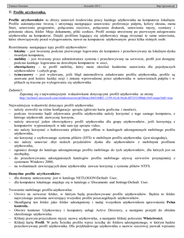 Tomasz Greszata - Koszalin 2012 - http://greszata.pl T: Profile użytkownika. Profile użytkowników to zbiory ustawień środowiska pracy każdego użytkownika na komputerze lokalnym. Profile automatycznie tworzą i utrzymują następujące ustawienia: preferencje pulpitu, kolory ekranu, menu Start, ustawienia programów, połączenia sieciowe, połączenia drukarek, ustawienia myszy, rozmiary i położenie okien, folder Moje dokumenty, pliki cookies. Profil zostaje utworzony po pierwszym zalogowaniu użytkownika na komputerze. Dzięki profilom logujący się użytkownicy mogą otrzymać te same ustawienia, które obowiązywały przed wylogowaniem, nawet na komputerze użytkowanym przez kilka różnych osób. Rozróżniamy następujące typy profili użytkowników: lokalny – jest tworzony podczas pierwszego logowania do komputera i przechowywany na lokalnym dysku twardym komputera, mobilny – jest tworzony przez administratora systemu i przechowywany na serwerze, profil jest dostępny podczas każdego logowania na dowolnym komputerze w sieci, obowiązkowy – to profil mobilny, który może określać konkretne ustawienia dla pojedynczych użytkowników i całych grup, tymczasowy – jest wydawany, jeśli błąd uniemożliwia załadowanie profilu użytkownika, profile są usuwane pod koniec każdej sesji i zmiany wprowadzone przez użytkownika w ustawieniach pulpitu i w plikach są tracone po wylogowaniu się użytkownika. Zadanie1: Zapoznaj się z najważniejszymi wskazówkami dotyczącymi profili użytkownika ze strony http://technet2.microsoft.com/windowsserver/pl/library/b4418d02-1339-41c8-9eeb-fd72553f0bdc1045.mspx?mfr=true Najważniejsze wskazówki dotyczące profili użytkownika: należy zezwolić na różne konfiguracje sprzętu (głównie karta graficzna i monitor), podczas tworzenia bądź edytowania profilu użytkownika należy korzystać z tego samego komputera, z którego użytkownik zazwyczaj korzysta, należy utworzyć jeden obowiązkowy profil użytkownika dla grupy użytkowników, jeśli korzystają z komputerów wyposażonych w taki sam typ sprzętu video, nie należy korzystać z buforowania plików typu offline w katalogach udostępnianych mobilnego profilu użytkownika, nie korzystaj z szyfrowanego systemu plików (EFS) w mobilnym profilu użytkownika (jest niezgodny), nie należy ustawiać zbyt niskich przydziałów dysku dla użytkowników z mobilnymi profilami użytkownika, ogranicz dostęp do katalogu udostępnionego profilu mobilnego do tych użytkowników, dla których jest on niezbędny, do przechowywania udostępnionych katalogów profilu mobilnego używaj serwerów przynajmniej z systemem Windows 2000, na woluminach zawierających dane użytkownika zawsze korzystaj z systemu plików NTFS. Domyślne profile użytkowników: dla domeny umieszczony jest w katalogu NETLOGON\Default User, dla komputera lokalnego znajduje się w katalogu c:\Documents and Settings\Default User. Tworzenie mobilnego profilu użytkownika: Utwórz na serwerze folder, w którym będą przechowywane profile użytkowników. Będzie to folder najwyższego poziomu zawierający wszystkie profile poszczególnych użytkowników. Skonfiguruj ten folder jako folder udostępniony i nadaj wszystkim użytkownikom uprawnienia Pełna kontrola. Otwórz kontener Użytkownicy i komputery usługi Active Directory, a następnie przejdź do obiektu określonego użytkownika. Kliknij prawym przyciskiem myszy nazwę użytkownika, a następnie kliknij polecenie Właściwości. Kliknij kartę Profil. W polu Ścieżka profilu wpisz ścieżkę do folderu udostępnionego, w którym będzie przechowywany profil użytkownika. Dla przykładowego użytkownika o nazwie sieciowej jnowak wpisanie Tomasz Greszata - Koszalin 2012 - http://greszata.pl ścieżki \\udział_sieciowy\profile\%username% spowoduje utworzenie katalogu o nazwie jnowak w folderze Profile na serwerze, na którym są przechowywane profile użytkowników. Zadanie2: Założyć konto lokalne o nazwie tomek. Sprawdzić czy jest katalog z profilem dla tego użytkownika. Zalogować się na to konto. Dokonać konfiguracji Ekranu. Wylogować się. Z konta administratora sprawdzić, czy jest katalog z profilem użytkownika tomek. Usunąć katalog z profilem i zalogować się na konto tomek. Dokonać konfiguracji Ekranu. Zalogować się na konto administratora i skopiować profil tomek do katalogu Default User. Założyć nowe konto o nazwie adam. Zalogować się na nie. Jaki profil został załadowany? Zadanie3: Założyć konto użytkownika o nazwie adam w dowolnej jednostce Active Directory. Sprawdzić, czy został założony katalog z profilem dla tego użytkownika. Zalogować się na dowolnym komputerze na konto adam i wylogować. Jakie ustawienia Ekranu zastały załadowane dla tego użytkownika? Czy został utworzony na serwerze katalog z profilem tego użytkownika? Zalogować się ponownie na konto użytkownika adam, dokonać zmian w ustawieniach Ekranu i wylogować się. Skopiować na kontrolerze domeny profil użytkownika adam do katalogu NETLOGON\Default User. Usunąć katalog z profilem użytkownika adam. Zalogować się na komputerze na konto adam. Jakie ustawienia zostały załadowane? Zadanie4: Sprawdzić, czy możliwe jest zalogowanie się na konto użytkownika, który ma prawa tylko do odczytu do własnego profilu (zabezpieczenia NTFS). Zadanie5: Profile użytkownika stają się obowiązkowe, kiedy nazwa pliku NTuser.dat na serwerze zostanie zmieniona na NTuser.man. To rozszerzenie powoduje, że profil użytkownika jest dostępny tylko do odczytu (po wylogowaniu użytkownika zmiany dokonane w profilu nie są zapisywane na serwerze). Sprawdź tę zasadę na przykładzie utworzonych wcześniej kont. Zadanie6: W jaki sposób ustawić sieciową ścieżkę do profili (jednakową dla każdego konta) dla lokalnych użytkowników asso na komputerach w pracowni szkolnej? Uwaga: Udostępniony zasób należy skonfigurować przed konfiguracją profili 
