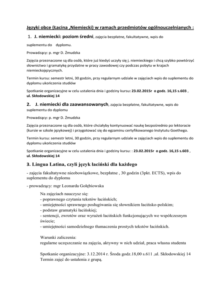 Języki obce (Łacina ,Niemiecki) w ramach przedmiotów ogólnouczelnianych : 1. J. niemiecki: poziom średni, zajęcia bezpłatne, fakultatywne, wpis do suplementu do dyplomu. Prowadzący: p. mgr D. Żmudzka Zajęcia przeznaczone są dla osób, które już kiedyś uczyły się j. niemieckiego i chcą szybko powtórzyd słownictwo i gramatykę przydatne w pracy zawodowej czy podczas pobytu w krajach niemieckojęzycznych. Termin kursu: semestr letni, 30 godzin, przy regularnym udziale w zajęciach wpis do suplementu do dyplomu ukooczenia studiów Spotkanie organizacyjne w celu ustalenia dnia i godziny kursu: 23.02.2015r o godz. 16,15 s.603 , ul. Skłodowskiej 14 2. J. niemiecki dla zaawansowanych, zajęcia bezpłatne, fakultatywne, wpis do suplementu do dyplomu Prowadzący: p. mgr D. Żmudzka Zajęcia przeznaczone są dla osób, które chciałyby kontynuowad naukę bezpośrednio po lektoracie (kursie w szkole językowej) i przygotowad się do egzaminu certyfikowanego Instytutu Goethego. Termin kursu: semestr letni, 30 godzin, przy regularnym udziale w zajęciach wpis do suplementu do dyplomu ukooczenia studiów Spotkanie organizacyjne w celu ustalenia dnia i godziny kursu: : 23.02.2015r o godz. 16,15 s.603 , ul. Skłodowskiej 14 3. Lingua Latina, czyli język łaciński dla każdego - zajęcia fakultatywne nieobowiązkowe, bezpłatne , 30 godzin (3pkt. ECTS), wpis do suplementu do dyplomu - prowadzący: mgr Leonarda Gołębiowska Na zajęciach nauczysz się: - poprawnego czytania tekstów łacińskich; - umiejętności sprawnego posługiwania się słownikiem łacińsko-polskim; - podstaw gramatyki łacińskiej; - sentencji, zwrotów oraz wyrażeń łacińskich funkcjonujących we współczesnym świecie; - umiejętności samodzielnego tłumaczenia prostych tekstów łacińskich. Warunki zaliczenia: regularne uczęszczanie na zajęcia, aktywny w nich udział, praca własna studenta Spotkanie organizacyjne: 3.12.2014 r. Środa godz.18,00 s.611 ,ul. Skłodowskiej 14 Termin zajęć do ustalenia z grupą. Studium Praktycznej Nauki Języków Obcych proponuje studentom UwB bezpłatne dodatkowe zajęcia językowe poza programem studiów. Warunki zaliczenia: regularne uczęszczanie na zajęcia, aktywny udział, praca własna studenta. Po otrzymaniu zaliczenia istnieje możliwość - na wniosek uczestnika kursu - wpisu do suplementu do dyplomu w rubryce inne osiągnięcia, ilość punktów ECTS – 2 . Rejestracja w Usosweb od 23.02 do 6.03.2015 r. "Sapere aude", czyli język łacioski dla średniozaawansowanych, to propozycja powstała z myślą o studentach, którzy uczyli się języka łacioskiego w szkole ponadgimnazjalnej lub przeszli krótki kurs tego języka podczas studiów. Celem zajęd jest pogłębienie znajomości fleksji i składni łacioskiej, kształcenie umiejętności posługiwania się słownikiem łaciosko - polskim oraz polsko - łacioskim, a także doskonalenie umiejętności translatorskich. Podczas zajęd student będzie miał możliwośd poszerzenia zasobu słownictwa oraz zwrotów i sentencji łacioskich. Prowadzący: mgr Urszula Tylicka Termin kursu : semestr letni , 30 godzin . Spotkanie organizacyjne w celu ustalenia terminu zajęć odbędzie się 9 marca o godz.18,00 w s.611 ul. M.C.Skłodowskiej 14 p.VI (budynek Rektoratu UwB) Kontakt mailowy : [email protected]