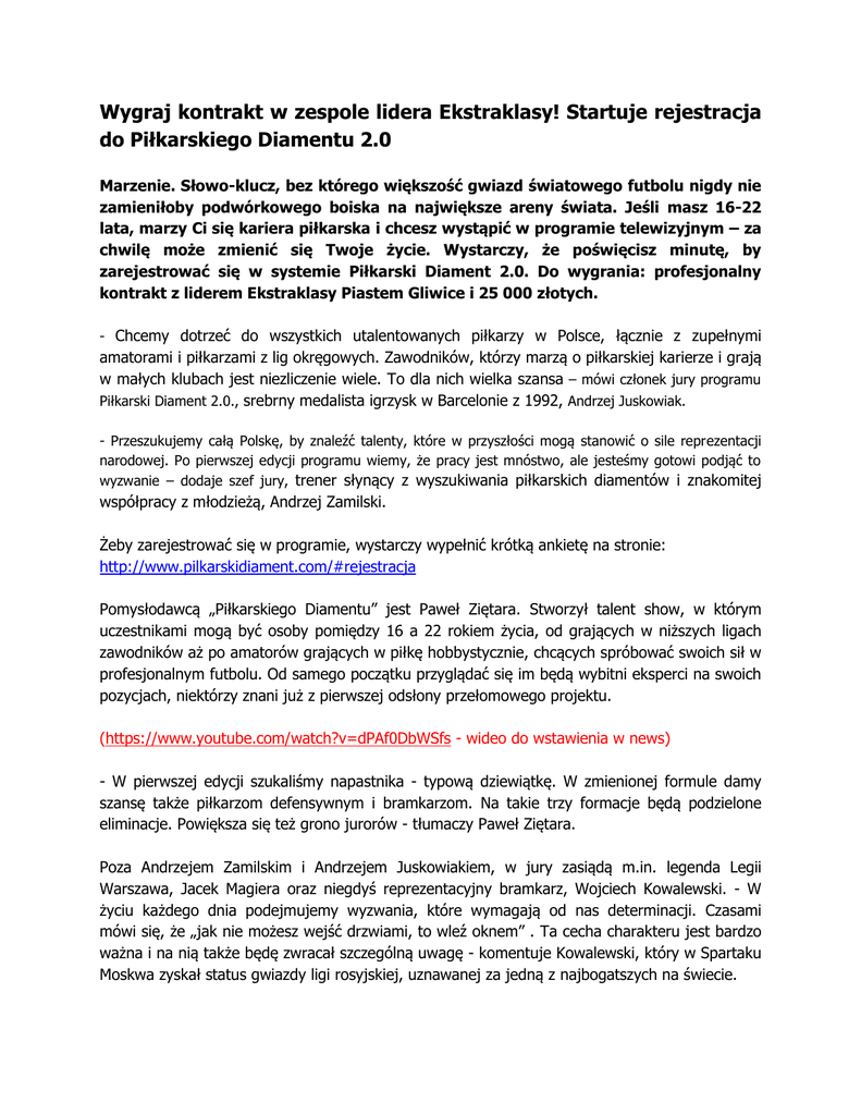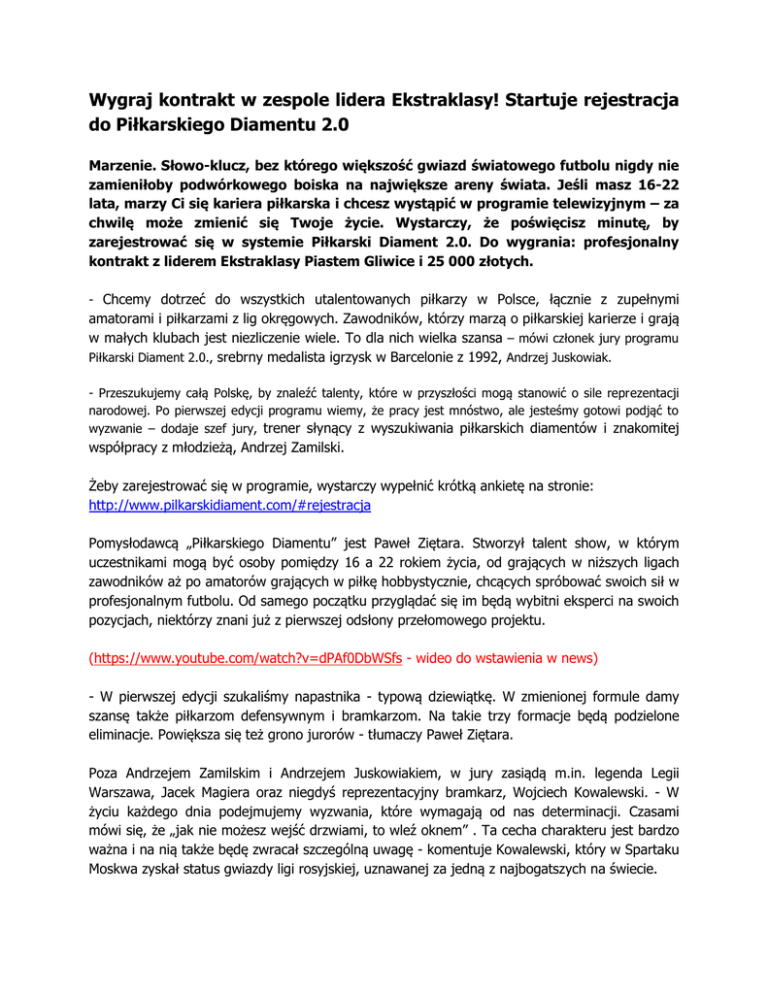 Wygraj kontrakt w zespole lidera Ekstraklasy! Startuje rejestracja do Piłkarskiego Diamentu 2.0 Marzenie. Słowo-klucz, bez którego większość gwiazd światowego futbolu nigdy nie zamieniłoby podwórkowego boiska na największe areny świata. Jeśli masz 16-22 lata, marzy Ci się kariera piłkarska i chcesz wystąpić w programie telewizyjnym – za chwilę może zmienić się Twoje życie. Wystarczy, że poświęcisz minutę, by zarejestrować się w systemie Piłkarski Diament 2.0. Do wygrania: profesjonalny kontrakt z liderem Ekstraklasy Piastem Gliwice i 25 000 złotych. - Chcemy dotrzeć do wszystkich utalentowanych piłkarzy w Polsce, łącznie z zupełnymi amatorami i piłkarzami z lig okręgowych. Zawodników, którzy marzą o piłkarskiej karierze i grają w małych klubach jest niezliczenie wiele. To dla nich wielka szansa – mówi członek jury programu Piłkarski Diament 2.0., srebrny medalista igrzysk w Barcelonie z 1992, Andrzej Juskowiak. - Przeszukujemy całą Polskę, by znaleźć talenty, które w przyszłości mogą stanowić o sile reprezentacji narodowej. Po pierwszej edycji programu wiemy, że pracy jest mnóstwo, ale jesteśmy gotowi podjąć to wyzwanie – dodaje szef jury, trener słynący z wyszukiwania piłkarskich diamentów i znakomitej współpracy z młodzieżą, Andrzej Zamilski. Żeby zarejestrować się w programie, wystarczy wypełnić krótką ankietę na stronie: http://www.pilkarskidiament.com/#rejestracja Pomysłodawcą „Piłkarskiego Diamentu” jest Paweł Ziętara. Stworzył talent show, w którym uczestnikami mogą być osoby pomiędzy 16 a 22 rokiem życia, od grających w niższych ligach zawodników aż po amatorów grających w piłkę hobbystycznie, chcących spróbować swoich sił w profesjonalnym futbolu. Od samego początku przyglądać się im będą wybitni eksperci na swoich pozycjach, niektórzy znani już z pierwszej odsłony przełomowego projektu. (https://www.youtube.com/watch?v=dPAf0DbWSfs - wideo do wstawienia w news) - W pierwszej edycji szukaliśmy napastnika - typową dziewiątkę. W zmienionej formule damy szansę także piłkarzom defensywnym i bramkarzom. Na takie trzy formacje będą podzielone eliminacje. Powiększa się też grono jurorów - tłumaczy Paweł Ziętara. Poza Andrzejem Zamilskim i Andrzejem Juskowiakiem, w jury zasiądą m.in. legenda Legii Warszawa, Jacek Magiera oraz niegdyś reprezentacyjny bramkarz, Wojciech Kowalewski. - W życiu każdego dnia podejmujemy wyzwania, które wymagają od nas determinacji. Czasami mówi się, że „jak nie możesz wejść drzwiami, to wleź oknem” . Ta cecha charakteru jest bardzo ważna i na nią także będę zwracał szczególną uwagę - komentuje Kowalewski, który w Spartaku Moskwa zyskał status gwiazdy ligi rosyjskiej, uznawanej za jedną z najbogatszych na świecie. Stawka „Piłkarskiego Diamentu" jest wielka. Tym razem główną nagrodą będzie podpisanie kontraktu z Piastem Gliwice - drużyną, która idzie jak burza w Ekstraklasie i zajmuje pierwsze miejsce w tabeli. – Seria meczów sparingowych pozwoli sprawdzić, kto jest godny otrzymania głównej nagrody w programie. Pozostali zawodnicy, którzy wpadną w oko skautom Piasta, również mogą dostać propozycję umowy - zapowiada Paweł Ziętara, pomysłodawca całego projektu. Niezwykle ważnym elementem projektu jest aspekt naukowy. Odpowiadają za niego prof. nadzw. dr hab. Zbigniew Jastrzębski (współpracujący z większością klubów Ekstraklasy i wcześniej z reprezentacją), Marcin Kwiatkowski (specjalista od psychomotoryki) oraz Paweł Habrat (ceniony psycholog sportu). - Stawiamy na nowoczesne technologię. Jednym z badanych elementów będzie analiza ruchu gałki ocznej - zapowiada Marcin Kwiatkowski. Grono specjalistów zamykają: Marek Szutowicz (trener od przygotowania fizycznego), Jakub Drwal (skaut) i Łukasz Masłowski (skaut). Żeby wziąć udział w programie, należy zarejestrować się na stronie http://www.pilkarskidiament.com/#rejestracja. W swoim profilu każdy z zawodników będzie mógł uzupełniać dane na temat swoich występów ligowych, a także o własnej charakterystyce piłkarskiej, która stworzy pierwszy obraz uczestników w głowie jurorów. Pośród etapów rejestracji uwzględniono także testy psychologiczne i psychomotoryczne - za oba przydzielane są punkty. Pierwsza runda eliminacji rozpocznie się na początku nowego roku w Gliwicach: 4-5 stycznia - spośród 150 piłkarzy defensywnych zostanie wyselekcjonowanych 25 najlepszych. 6-7 stycznia - spośród 150 piłkarzy ofensywnych zostanie wybranych 25 najzdolniejszych. 8 stycznia – na placu boju pozostanie 10 spośród 50 największych talentów bramkarskich. Wielki finał przewidziano na 17 lutego 2016 roku. Głównymi partnerami projektu są: firma Nice, Miasto Gliwice i klub Piast Gliwice. (https://www.youtube.com/watch?v=Oy2XJBJAxJE - drugie wideo do wstawienia w news) Piłkarski Diament 2.0 w pigułce: Wygraj zawodowy kontrakt piłkarski w Piaście Gliwice i 25 000 złotych na start kariery! Wystąp w telewizji i poznaj wybitnych ekspertów piłkarskich! Przejdź profesjonalne testy i otrzymaj gotowe wyniki! Wejdź na stronę projektu i wypełnij formularz: http://www.pilkarskidiament.com/#rejestracja