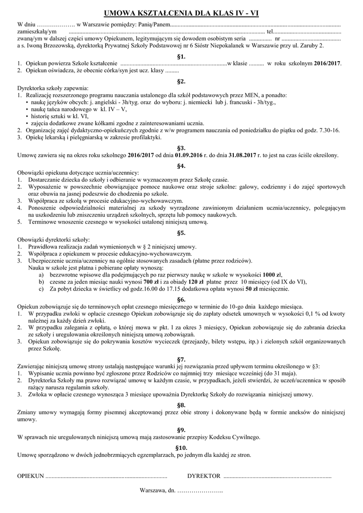 UMOWA KSZTAŁCENIA DLA KLAS IV - VI W dniu ………………. w Warszawie pomiędzy: Panią/Panem................................................................................................................ zamieszkałą/ym ................................................................................................................................. tel............................................. zwaną/ym w dalszej części umowy Opiekunem, legitymującym się dowodem osobistym seria ............... nr ....................................... a s. Iwoną Brzozowską, dyrektorką Prywatnej Szkoły Podstawowej nr 6 Sióstr Niepokalanek w Warszawie przy ul. Zaruby 2. §1. 1. Opiekun powierza Szkole kształcenie ......................................................................w klasie .......... w roku szkolnym 2016/2017. 2. Opiekun oświadcza, że obecnie córka/syn jest ucz. klasy ......... §2. Dyrektorka szkoły zapewnia: 1. Realizację rozszerzonego programu nauczania ustalonego dla szkół podstawowych przez MEN, a ponadto: • naukę języków obcych: j. angielski - 3h/tyg. oraz do wyboru: j. niemiecki lub j. francuski - 3h/tyg., • naukę tańca narodowego w kl. IV – V, • historię sztuki w kl. VI, • zajęcia dodatkowe zwane kółkami zgodne z zainteresowaniami ucznia. 2. Organizację zajęć dydaktyczno-opiekuńczych zgodnie z w/w programem nauczania od poniedziałku do piątku od godz. 7.30-16. 3. Opiekę lekarską i pielęgniarską w zakresie profilaktyki. §3. Umowę zawiera się na okres roku szkolnego 2016/2017 od dnia 01.09.2016 r. do dnia 31.08.2017 r. to jest na czas ściśle określony. §4. Obowiązki opiekuna dotyczące ucznia/uczennicy: 1. Dostarczanie dziecka do szkoły i odbieranie w wyznaczonym przez Szkołę czasie. 2. Wyposażenie w powszechnie obowiązujące pomoce naukowe oraz stroje szkolne: galowy, codzienny i do zajęć sportowych oraz obuwia na jasnej podeszwie do chodzenia po szkole. 3. Współpraca ze szkołą w procesie edukacyjno-wychowawczym. 4. Ponoszenie odpowiedzialności materialnej za szkody wyrządzone zawinionym działaniem ucznia/uczennicy, polegającym na uszkodzeniu lub zniszczeniu urządzeń szkolnych, sprzętu lub pomocy naukowych. 5. Terminowe wnoszenie czesnego w wysokości ustalonej niniejszą umową. §5. Obowiązki dyrektorki szkoły: 1. Prawidłowa realizacja zadań wymienionych w § 2 niniejszej umowy. 2. Współpraca z opiekunem w procesie edukacyjno-wychowawczym. 3. Ubezpieczenie ucznia/uczennicy na ogólnie stosowanych zasadach (płatne przez rodziców). Nauka w szkole jest płatna i pobierane opłaty wynoszą: a) bezzwrotne wpisowe dla podejmujących po raz pierwszy naukę w szkole w wysokości 1000 zł, b) czesne za jeden miesiąc nauki wynosi 700 zł i za obiady 120 zł płatne przez 10 miesięcy (od IX do VI), c) Za pobyt dziecka w świetlicy od godz.16.00 do 17.15 dodatkowa opłata wynosi 50 zł miesięcznie. §6. Opiekun zobowiązuje się do terminowych opłat czesnego miesięcznego w terminie do 10-go dnia każdego miesiąca. 1. W przypadku zwłoki w opłacie czesnego Opiekun zobowiązuje się do zapłaty odsetek umownych w wysokości 0,1 % od kwoty należnej za każdy dzień zwłoki. 2. W przypadku zalegania z opłatą, o której mowa w pkt. l za okres 3 miesięcy, Opiekun zobowiązuje się do zabrania dziecka ze szkoły i uregulowania określonych niniejszą umową zobowiązań. 3. Opiekun zobowiązuje się do pokrywania kosztów wycieczek (przejazdy, bilety wstępu, itp.) i zielonych szkół organizowanych przez Szkołę. §7. Zawierając niniejszą umowę strony ustalają następujące warunki jej rozwiązania przed upływem terminu określonego w §3: 1. Wypisanie ucznia powinno być zgłoszone przez Rodziców co najmniej trzy miesiące wcześniej (do 31 maja). 2. Dyrektorka Szkoły ma prawo rozwiązać umowę w każdym czasie, w przypadkach, jeżeli stwierdzi, że uczeń/uczennica w sposób rażący narusza regulamin szkoły. 3. Zwłoka w opłacie czesnego wynosząca 3 miesiące upoważnia Dyrektorkę Szkoły do rozwiązania niniejszej umowy. §8. Zmiany umowy wymagają formy pisemnej akceptowanej przez obie strony i dokonywane będą w formie aneksów do niniejszej umowy. §9. W sprawach nie uregulowanych niniejszą umową mają zastosowanie przepisy Kodeksu Cywilnego. §10. Umowę sporządzono w dwóch jednobrzmiących egzemplarzach, po jednym dla każdej ze stron. OPIEKUN ................................................................................ DYREKTOR ....................................................................... Warszawa, dn. …………………..