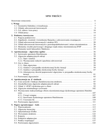 SPIS TREŚCI Stosowane oznaczenia . . . . . . . . . . . . . . . . . . . . . . . . . . . . . . . . . . . . . . . . . . . . . . . . . . . . . . . . . . 6 1. Wstęp. . . . . . . . . . . . . . . . . . . . . . . . . . . . . . . . . . . . . . . . . . . . . . . . . . . . . . . . . . . . . . . . . . . . . 7 1.1. Geometria fraktalna a wizualizacja . . . . . . . . . . . . . . . . . . . . . . . . . . . . . . . . . . . . . . . . . . 7 1.2. Układy odwzorowań iterowanych. . . . . . . . . . . . . . . . . . . . . . . . . . . . . . . . . . . . . . . . . . . 9 1.3. Cel, zakres i teza pracy . . . . . . . . . . . . . . . . . . . . . . . . . . . . . . . . . . . . . . . . . . . . . . . . . . . 10 1.4. Układ pracy . . . . . . . . . . . . . . . . . . . . . . . . . . . . . . . . . . . . . . . . . . . . . . . . . . . . . . . . . . . . 14 2. Podstawy teoretyczne . . . . . . . . . . . . . . . . . . . . . . . . . . . . . . . . . . . . . . . . . . . . . . . . . . . . . . . 2.1. Pojęcia podstawowe . . . . . . . . . . . . . . . . . . . . . . . . . . . . . . . . . . . . . . . . . . . . . . . . . . . . . 2.2. Zupełność, zwartość i twierdzenie Banacha o odwzorowaniu zwężającym . . . . . . . . . . . 2.3. Układ odwzorowań iterowanych i atraktor IFS. . . . . . . . . . . . . . . . . . . . . . . . . . . . . . . . . 2.4. Układ odwzorowań iterowanych z prawdopodobieństwami i miara niezmiennicza . . . . 2.5. Momenty zwykłe pierwszego i drugiego rzędu miary niezmienniczej IFSP . . . . . . . . . . 2.6. Elementy teorii łańcuchów Markowa . . . . . . . . . . . . . . . . . . . . . . . . . . . . . . . . . . . . . . . . 15 15 17 20 26 29 32 3. Aproksymacja – algorytmy ogólne . . . . . . . . . . . . . . . . . . . . . . . . . . . . . . . . . . . . . . . . . . . . 3.1. Iterowanie operatora Hutchinsona. . . . . . . . . . . . . . . . . . . . . . . . . . . . . . . . . . . . . . . . . . . 3.2. Algorytm adaptacyjnych odcięć . . . . . . . . . . . . . . . . . . . . . . . . . . . . . . . . . . . . . . . . . . . . 3.2.1. Opis i analiza . . . . . . . . . . . . . . . . . . . . . . . . . . . . . . . . . . . . . . . . . . . . . . . . . . . . . . 3.2.2. Wyznaczanie stałych Lipschitza odwzorowań . . . . . . . . . . . . . . . . . . . . . . . . . . . . 3.3. Gra w chaos . . . . . . . . . . . . . . . . . . . . . . . . . . . . . . . . . . . . . . . . . . . . . . . . . . . . . . . . . . . . 3.3.1. Opis algorytmu . . . . . . . . . . . . . . . . . . . . . . . . . . . . . . . . . . . . . . . . . . . . . . . . . . . . 3.3.2. Analiza w przypadku nieskończonej liczby iteracji . . . . . . . . . . . . . . . . . . . . . . . . 3.3.3. Analiza w przypadku skończonej liczby iteracji . . . . . . . . . . . . . . . . . . . . . . . . . . . 3.3.4. Alternatywny dowód poprawności algorytmu w przypadku nieskończonej liczby iteracji . . . . . . . . . . . . . . . . . . . . . . . . . . . . . . . . . . . . . . . . . . . . . . . . . . . . . . . . . . . 3.4. Porównanie algorytmów . . . . . . . . . . . . . . . . . . . . . . . . . . . . . . . . . . . . . . . . . . . . . . . . . . 36 36 39 40 45 58 58 59 67 81 83 4. Aproksymacja na -siatkach . . . . . . . . . . . . . . . . . . . . . . . . . . . . . . . . . . . . . . . . . . . . . . . . 87 4.1. Czas ucieczki i funkcja charakterystyczna atraktora. . . . . . . . . . . . . . . . . . . . . . . . . . . . . 87 4.2. Zmodyfikowany algorytm adaptacyjnych odcięć . . . . . . . . . . . . . . . . . . . . . . . . . . . . . . . 92 4.3. Układ -IFSP i dyskretna gra w chaos . . . . . . . . . . . . . . . . . . . . . . . . . . . . . . . . . . . . . . 95 4.4. Algorytm minimalnego rysowania . . . . . . . . . . . . . . . . . . . . . . . . . . . . . . . . . . . . . . . . . . 102 4.5. Wyznaczanie maksymalnego zbioru niezmiennicznego dyskretnego operatora Hutchinsona . . . . . . . . . . . . . . . . . . . . . . . . . . . . . . . . . . . . . . . . . . . . . . . . . . . . . . . . . . . . . . . . . . 107 4.5.1. Uwagi wstępne . . . . . . . . . . . . . . . . . . . . . . . . . . . . . . . . . . . . . . . . . . . . . . . . . . . . 107 4.5.2. Iterowanie dyskretnego operatora Hutchinsona . . . . . . . . . . . . . . . . . . . . . . . . . . . 109 4.5.3. Usuwanie tła . . . . . . . . . . . . . . . . . . . . . . . . . . . . . . . . . . . . . . . . . . . . . . . . . . . . . . 110 4.6. Porównanie algorytmów . . . . . . . . . . . . . . . . . . . . . . . . . . . . . . . . . . . . . . . . . . . . . . . . . . 111 5. Figury ograniczające – kule . . . . . . . . . . . . . . . . . . . . . . . . . . . . . . . . . . . . . . . . . . . . . . . . . . 113 5.1. Wprowadzenie. . . . . . . . . . . . . . . . . . . . . . . . . . . . . . . . . . . . . . . . . . . . . . . . . . . . . . . . . . 113 5.2. Algorytm iteracyjny. . . . . . . . . . . . . . . . . . . . . . . . . . . . . . . . . . . . . . . . . . . . . . . . . . . . . . 117 5.3. Optymalizacja środka . . . . . . . . . . . . . . . . . . . . . . . . . . . . . . . . . . . . . . . . . . . . . . . . . . . . 119 5.4. Wyważanie atraktora . . . . . . . . . . . . . . . . . . . . . . . . . . . . . . . . . . . . . . . . . . . . . . . . . . . . . 122 5.5. Koperty . . . . . . . . . . . . . . . . . . . . . . . . . . . . . . . . . . . . . . . . . . . . . . . . . . . . . . . . . . . . . . . 128 5.6. Podejście adaptacyjne . . . . . . . . . . . . . . . . . . . . . . . . . . . . . . . . . . . . . . . . . . . . . . . . . . . . 132 5.7. Punkty rozpinające . . . . . . . . . . . . . . . . . . . . . . . . . . . . . . . . . . . . . . . . . . . . . . . . . . . . . . 137 5.8. Porównanie algorytmów . . . . . . . . . . . . . . . . . . . . . . . . . . . . . . . . . . . . . . . . . . . . . . . . . . 143 280 Spis treści 6. Figury ograniczające – wielokąty i wielościany wypukłe . . . . . . . . . . . . . . . . . . . . . . . . . . 145 6.1. Wprowadzenie. . . . . . . . . . . . . . . . . . . . . . . . . . . . . . . . . . . . . . . . . . . . . . . . . . . . . . . . . . 145 6.2. Prostopadłościany . . . . . . . . . . . . . . . . 