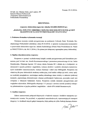 Pozytywna oceną jaka wypływa z analiry rozprawy doktorskiej mgra inZ. Jakuba Sza-