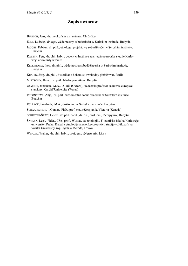 Lětopis 60 (2013) 2 159 Zapis awtorow BULISCH, Jens, dr. theol., farar a stawiznar, Chrósćicy ELLE, Ludwig, dr. agr., wědomostny sobudźěłaćer w Serbskim instituće, Budyšin JACOBS, Fabian, dr. phil., etnologa, projektowy sobudźěłaćer w Serbskim instituće, Budyšin KALETA, Petr, dr. phil. habil., docent w Instituće za srjedźnoeuropske studije Karloweje uniwersity w Praze KELLEROWA, Ines, dr. phil., wědomostna sobudźěłaćerka w Serbskim instituće, Budyšin KRACIK, Jörg, dr. phil., historikar a bohemist, swobodny přełožowar, Berlin MIRTSCHIN, Hans, dr. phil., hladar pomnikow, Budyšin OSMOND, Jonathan, M.A., D.Phil. (Oxford), slědźerski profesor za nowše europske stawizny, Cardiff University (Wales) POHONČOWA, Anja, dr. phil., wědomostna sobudźěłaćerka w Serbskim instituće, Budyšin POLLACK, Friedrich, M.A., doktorand w Serbskim instituće, Budyšin SCHAARSCHMIDT, Gunter, PhD., prof. em., rěčespytnik, Victoria (Kanada) SCHUSTER-ŠEWC, Heinz, dr. phil. habil., dr. h.c., prof. em., rěčespytnik, Budyšin ŠATAVA, Leoš, PhDr., CSc., prof., Wustaw za etnologiju, Filozofiska fakulta Karloweje uniwersity, Praha; Katedra etnologije a zwonkaeuropskich studijow, Filozofiska fakulta Uniwersity swj. Cyrila a Metoda, Trnava WENZEL, Walter, dr. phil. habil., prof. em., rěčespytnik, Lipsk