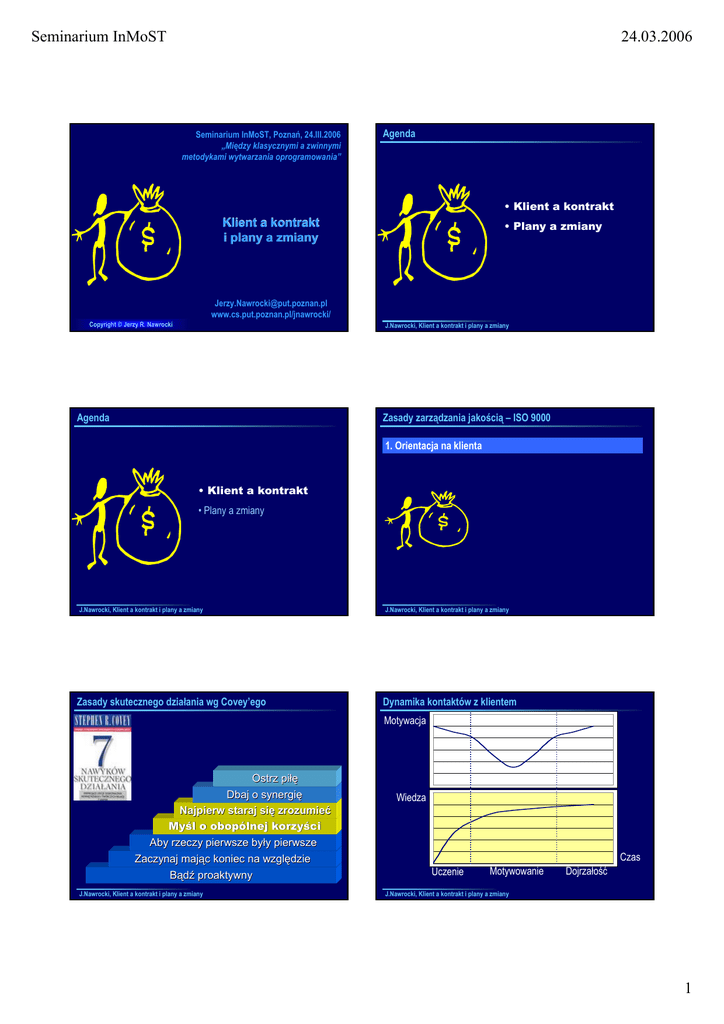 Seminarium InMoST 24.03.2006 Seminarium InMoST, Poznań, 24.III.2006 „Między klasycznymi a zwinnymi metodykami wytwarzania oprogramowania” Agenda • Klient a kontrakt Klient a kontrakt i plany a zmiany • Plany a zmiany [email protected] www.cs.put.poznan.pl/jnawrocki/ Copyright © Jerzy R. Nawrocki J.Nawrocki, Klient a kontrakt i plany a zmiany Agenda Zasady zarządzania jakością – ISO 9000 1. Orientacja na klienta • Klient a kontrakt • Plany a zmiany J.Nawrocki, Klient a kontrakt i plany a zmiany Zasady skutecznego działania wg Covey’ego J.Nawrocki, Klient a kontrakt i plany a zmiany Dynamika kontaktów z klientem Motywacja Ostrz piłę piłę Dbaj o synergię synergię Najpierw staraj się się zrozumieć zrozumieć Myś Myśl o obopó obopólnej korzyś korzyści Aby rzeczy pierwsze był były pierwsze Zaczynaj mają mając koniec na wzglę względzie Bądź proaktywny J.Nawrocki, Klient a kontrakt i plany a zmiany Wiedza Czas Uczenie Motywowanie Dojrzałość J.Nawrocki, Klient a kontrakt i plany a zmiany 1 Seminarium InMoST 24.03.2006 Praktyki XP dotyczące klienta Jeśli klienta nie ma na miejscu ... Opowieść użytkownika To i to powinno być tak a tak. Praktyki XP: XP: • Klient na miejscu (on (on--site) site) • Kró Krótkie wydania • Gra planistyczna • Klient wymyś wymyśla testy akceptacyjne • Metafora • ... Przypadek użycia Scenariusz główny: 1. ... 2. ... Rozszerzenia: 2a. ... Analityk J.Nawrocki, Klient a kontrakt i plany a zmiany J.Nawrocki, Klient a kontrakt i plany a zmiany Planowanie wydania Fazy w RUP More rs 9 godz colo More rs colo Pisze opowieści użyt. Pracochł., ryzyko prędkość 9h More rs colo 6h More . func Elaboration Construction Transition Rozpoczęcie Dopracowanie Konstrukcja Wdrożenie Wybiera zakres J.Nawrocki, Klient a kontrakt i plany a zmiany J.Nawrocki, Klient a kontrakt i plany a zmiany Cykl życia projektu wg XPrince 16.10 27.11 ZałożeCel i nia zakres projektu Inception MTV Impact 23.01 8.04 27.05 17.06 8.07 Archi- Wydanie Wydanie Wydanie Zamknię tektura 1 2 3 -cie projektu Model biznesowy Przyrost 1 Przyrost 1 Przyrost 1 Przyrost 1 Zakres systemu Przyrost 2 Przyrost 2 Przyrost 2 Przyrost 2 Wdrożenie J.Nawrocki, Klient a kontrakt i plany a zmiany Wdrożenie 45% 50% Wdrożenie Merit Trust Voice J.Nawrocki, Klient a kontrakt i plany a zmiany 2 Seminarium InMoST 24.03.2006 MTV Impact MTV Impact 45% 50% Trust Merit Voice 45% 50% Trust Merit Voice J.Nawrocki, Klient a kontrakt i plany a zmiany J.Nawrocki, Klient a kontrakt i plany a zmiany MTV Impact Efektywna współpraca z klientem • Dbaj o zaufanie Merit Voice • Mądrze dąż do celu 45% 50% Trust J.Nawrocki, Klient a kontrakt i plany a zmiany J.Nawrocki, Klient a kontrakt i plany a zmiany Kto zawinił? Agenda Do przodu Przyczyny niepowodzeń 20% J.Nawrocki, Klient a kontrakt i plany a zmiany 80% Rozwiązania potrzebne do osiągnięcia celu • Klient a kontrakt • Plany a zmiany J.Nawrocki, Klient a kontrakt i plany a zmiany 3 Seminarium InMoST 24.03.2006 Najpierw wizja produktu potem plany Jakie szacowanie pracochłonności takie planowanie Inception Wizja produktu: • Na czym polega problem? • Kogo dotyczy? • Jakie są jego implikacje? • Jaki jest pomysł na jego rozwiązanie? Elaboration Construction Transition Rozpoczęcie Dopracowanie Konstrukcja Ile zajmie poznanie dziedziny? Wdrożenie Jak rozległy jest system? Ile zajmie sformułowanie wymagań? Czy są szczególne wymagania dot. architektury? W jakim stopniu mamy opanowaną technologię? J.Nawrocki, Klient a kontrakt i plany a zmiany J.Nawrocki, Klient a kontrakt i plany a zmiany Jakie szacowanie pracochłonności takie planowanie Inception Elaboration Zmiany Construction Transition Rozpoczęcie Dopracowanie Konstrukcja Wdrożenie Prawo Murphy’ego: Każde żądanie zmiany przez klienta jest akceptowane natychmiast, Każde zadanie wypełni nam każdy czas, jaki mu przydzielimy. pod warunkiem, że klient skompensuje dodatkową pracochłonność. J.Nawrocki, Klient a kontrakt i plany a zmiany J.Nawrocki, Klient a kontrakt i plany a zmiany Kontrola zmian wg CMM Change request Err User Kontrola zmian wg CMM Change request S.C. Manager Change request Err Developer User Change request S.C. Manager Developer Change report Decision J.Nawrocki, Klient a kontrakt i plany a zmiany SCCB Change report Decision Change request P. Manager SCCB J.Nawrocki, Klient a kontrakt i plany a zmiany 4 Seminarium InMoST 24.03.2006 Agenda Pytania? • Klient a kontrakt • Plany a zmiany J.Nawrocki, Klient a kontrakt i plany a zmiany J.Nawrocki, Klient a kontrakt i plany a zmiany 5