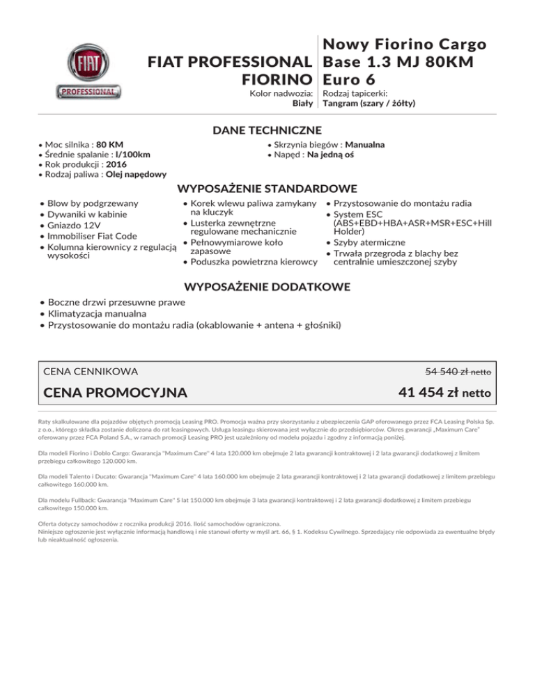 Nowy Fiorino Cargo FIAT PROFESSIONAL Base 1.3 MJ 80KM FIORINO Euro 6 Kolor nadwozia: Biały Rodzaj tapicerki: Tangram (szary / żółty) DANE TECHNICZNE • Moc silnika : 80 KM • Średnie spalanie : l/100km • Rok produkcji : 2016 • Rodzaj paliwa : Olej napędowy • Skrzynia biegów : Manualna • Napęd : Na jedną oś WYPOSAŻENIE STANDARDOWE • Blow by podgrzewany • Korek wlewu paliwa zamykany na kluczyk • Dywaniki w kabinie • Lusterka zewnętrzne • Gniazdo 12V regulowane mechanicznie • Immobiliser Fiat Code • Pełnowymiarowe koło • Kolumna kierownicy z regulacją zapasowe wysokości • Poduszka powietrzna kierowcy • Przystosowanie do montażu radia • System ESC (ABS+EBD+HBA+ASR+MSR+ESC+Hill Holder) • Szyby atermiczne • Trwała przegroda z blachy bez centralnie umieszczonej szyby WYPOSAŻENIE DODATKOWE • Boczne drzwi przesuwne prawe • Klimatyzacja manualna • Przystosowanie do montażu radia (okablowanie + antena + głośniki) CENA CENNIKOWA CENA PROMOCYJNA 54 540 zł netto 41 454 zł netto Raty skalkulowane dla pojazdów objętych promocją Leasing PRO. Promocja ważna przy skorzystaniu z ubezpieczenia GAP oferowanego przez FCA Leasing Polska Sp. z o.o., którego składka zostanie doliczona do rat leasingowych. Usługa leasingu skierowana jest wyłącznie do przedsiębiorców. Okres gwarancji „Maximum Care” oferowany przez FCA Poland S.A., w ramach promocji Leasing PRO jest uzależniony od modelu pojazdu i zgodny z informacją poniżej. Dla modeli Fiorino i Doblo Cargo: Gwarancja "Maximum Care" 4 lata 120.000 km obejmuje 2 lata gwarancji kontraktowej i 2 lata gwarancji dodatkowej z limitem przebiegu całkowitego 120.000 km. Dla modeli Talento i Ducato: Gwarancja "Maximum Care" 4 lata 160.000 km obejmuje 2 lata gwarancji kontraktowej i 2 lata gwarancji dodatkowej z limitem przebiegu całkowitego 160.000 km. Dla modelu Fullback: Gwarancja "Maximum Care" 5 lat 150.000 km obejmuje 3 lata gwarancji kontraktowej i 2 lata gwarancji dodatkowej z limitem przebiegu całkowitego 150.000 km. Oferta dotyczy samochodów z rocznika produkcji 2016. Ilość samochodów ograniczona. Niniejsze ogłoszenie jest wyłącznie informacją handlową i nie stanowi oferty w myśl art. 66, § 1. Kodeksu Cywilnego. Sprzedający nie odpowiada za ewentualne błędy lub nieaktualność ogłoszenia.